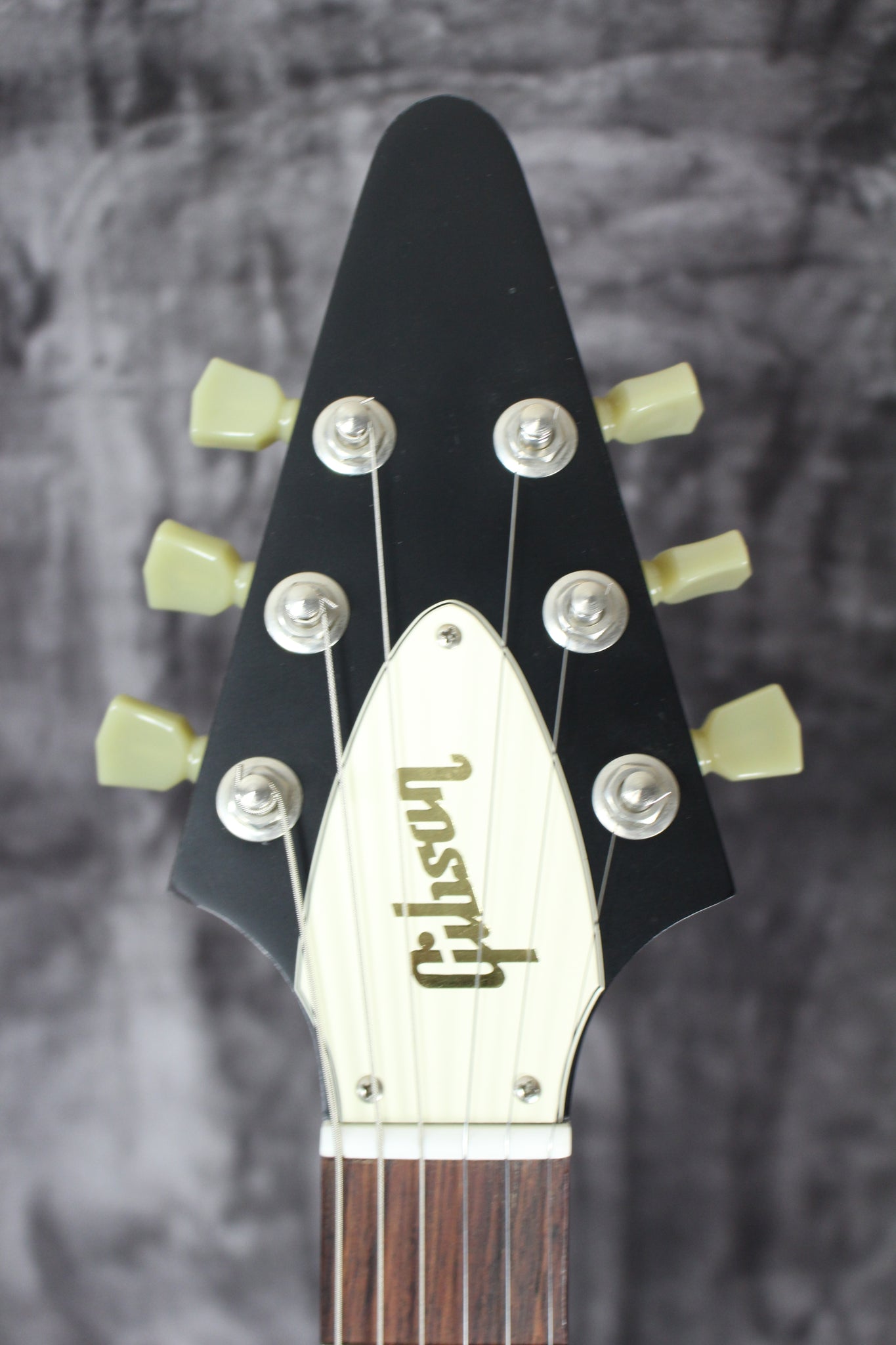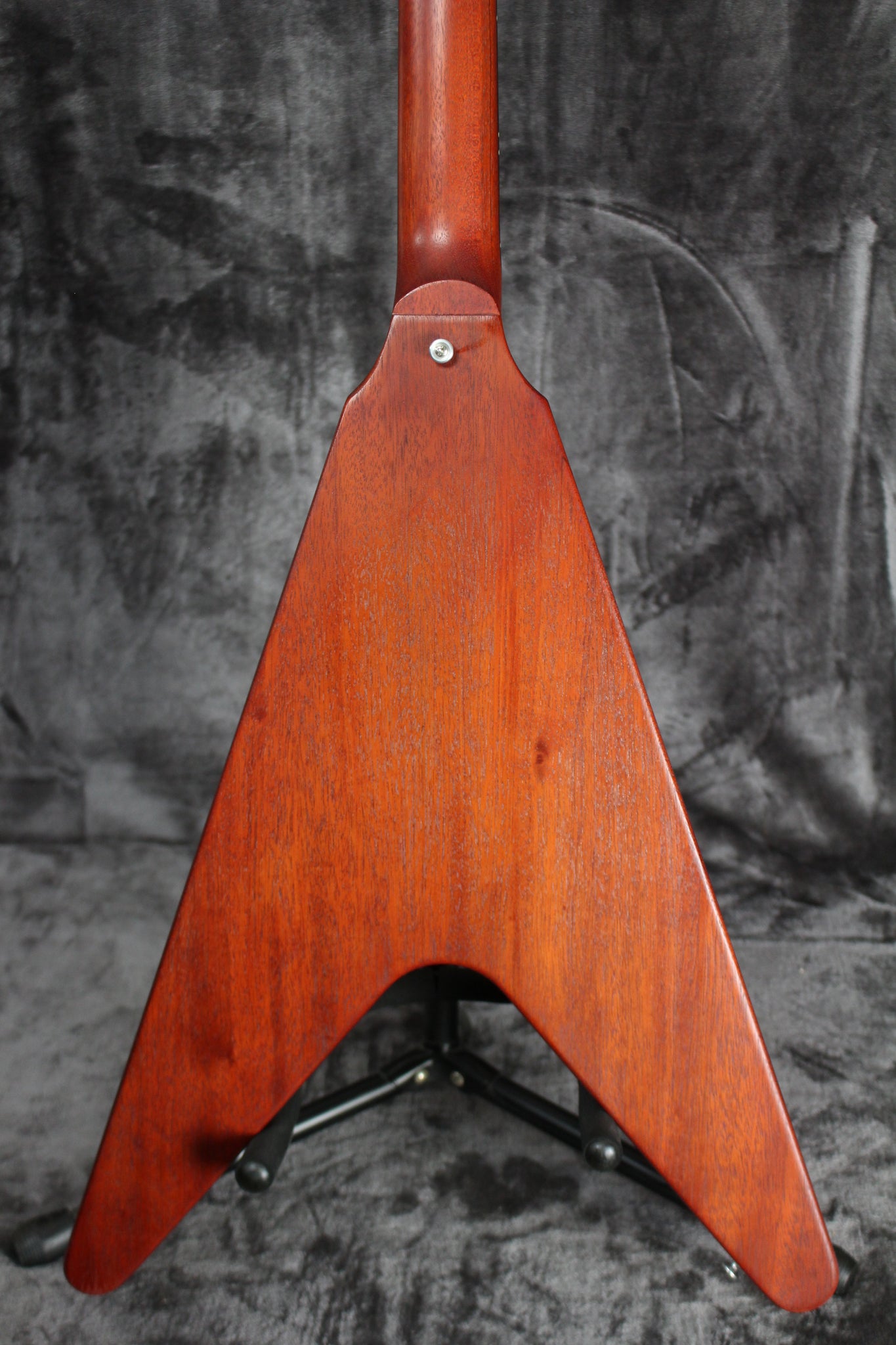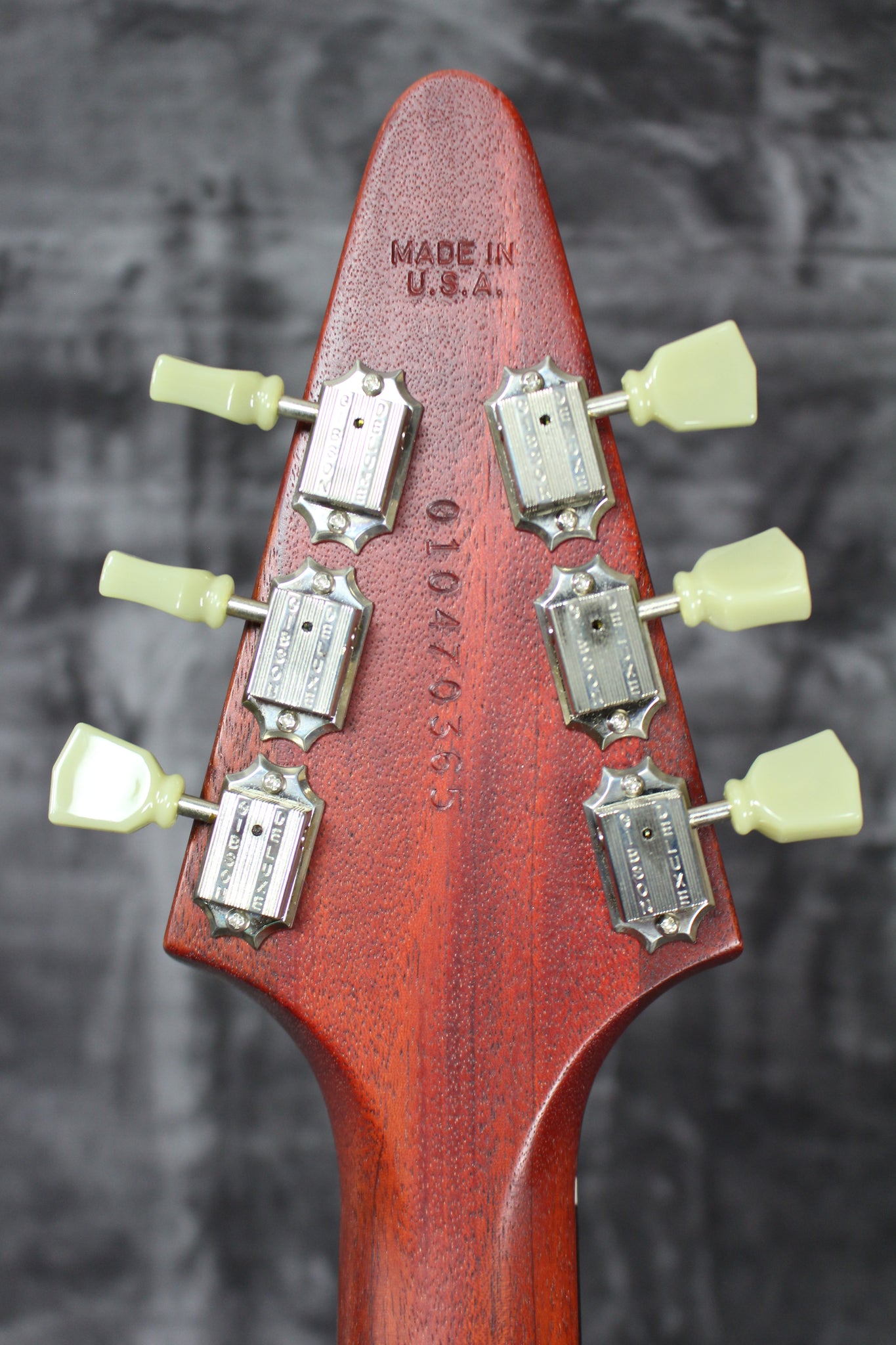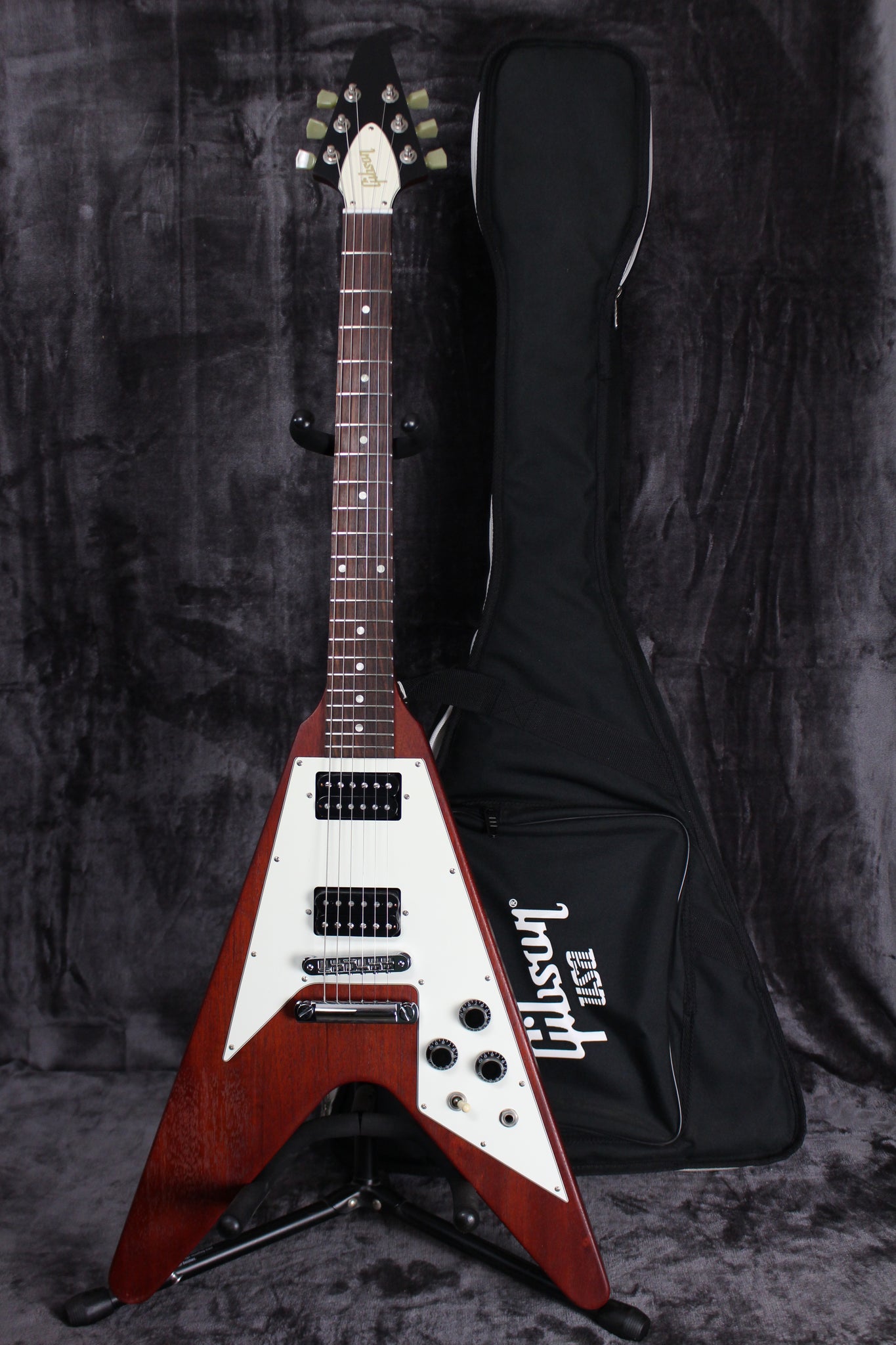 Summary: This 2007 Gibson Flying V Faded is a great, straight ahead guitar. It pairs Mahogany for the body and neck, with Rosewood for the fingerboard and that’s it for woods. To simplify the guitar, an ABR type tune-o-matic bridge and stop tailpiece set are installed in place of the original string-through design. Wiring is pretty standard, with a pair of uncovered humbucking pickups controlled by a pickup selector, individual volume controls, and a master tone.