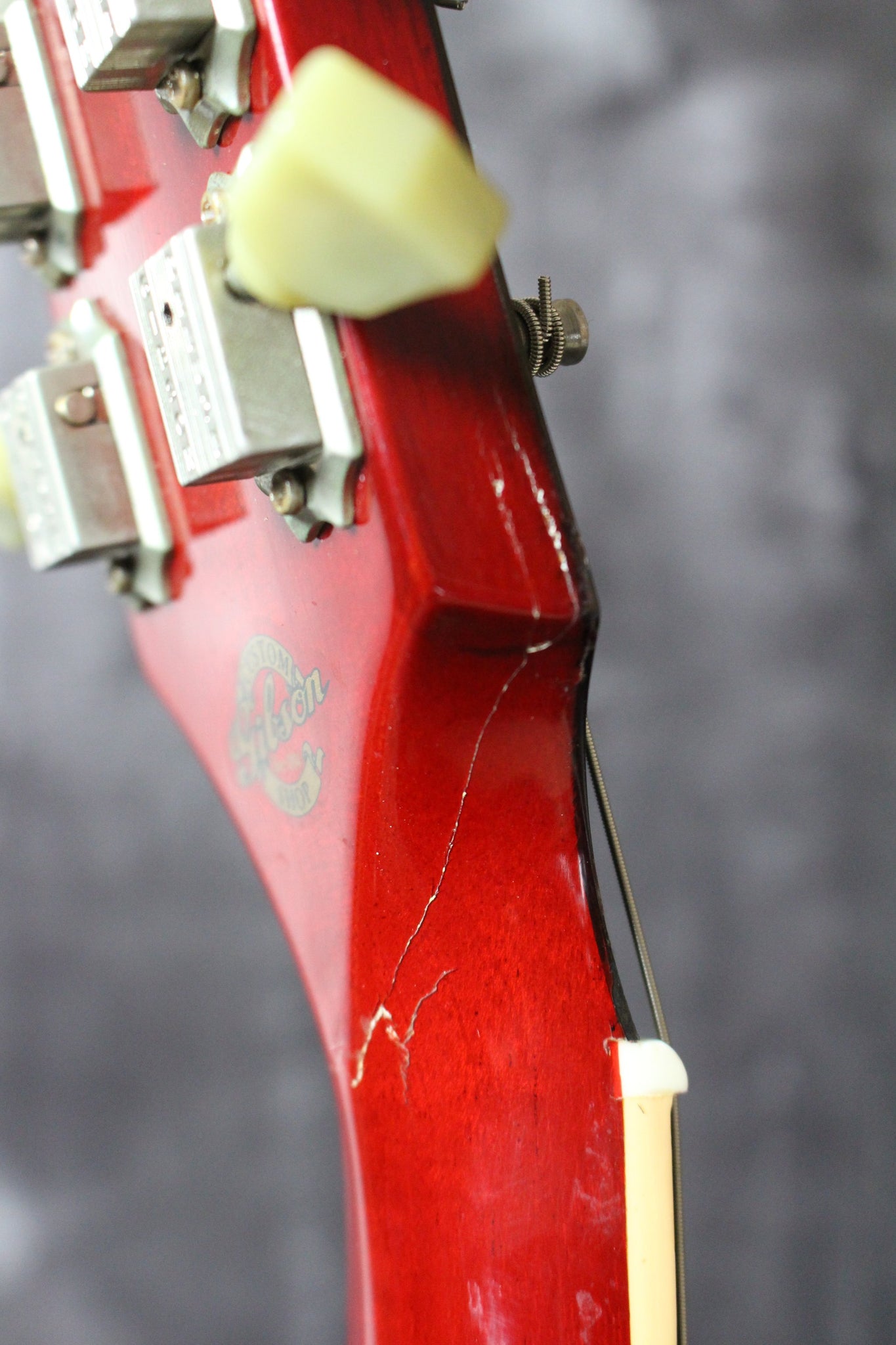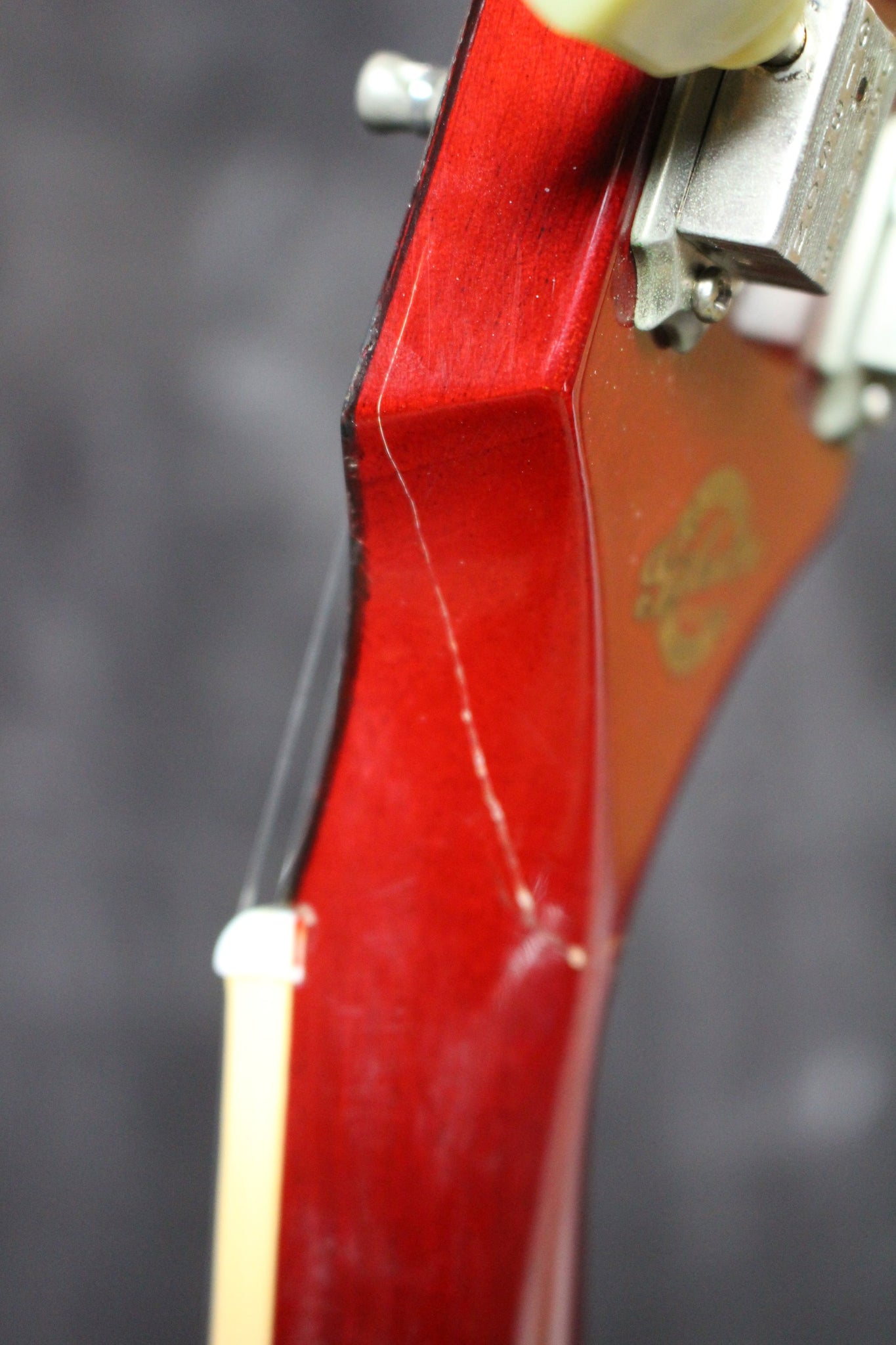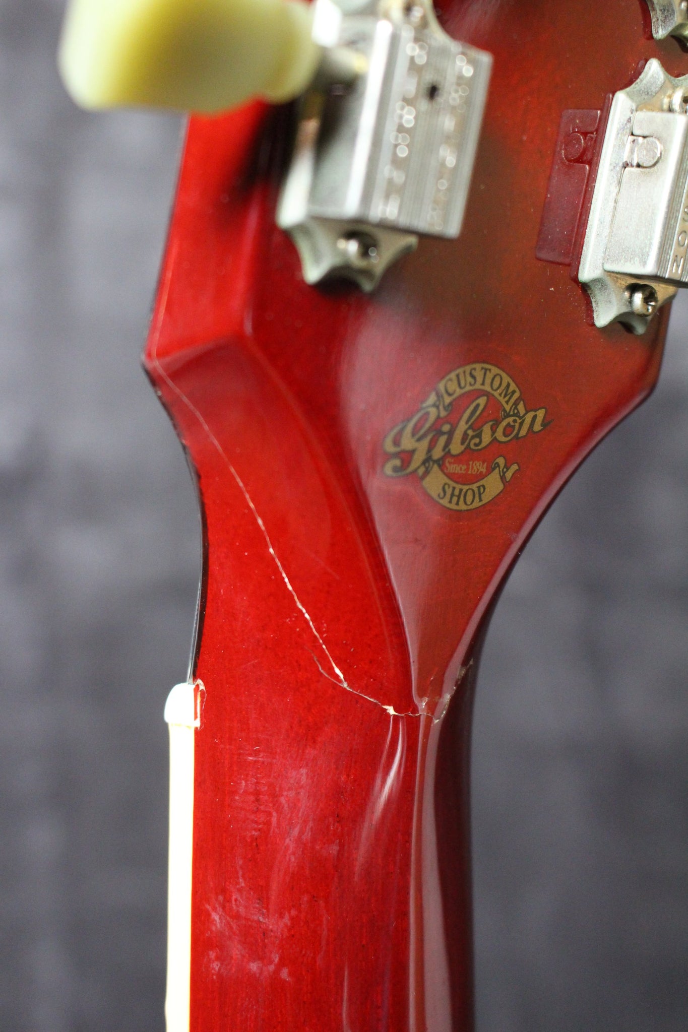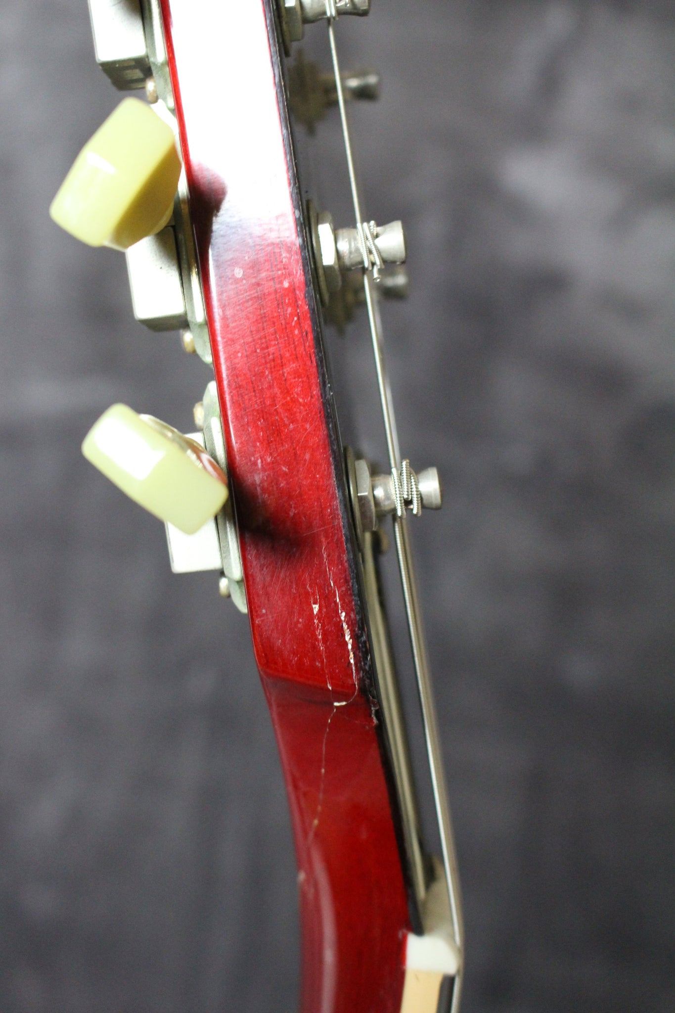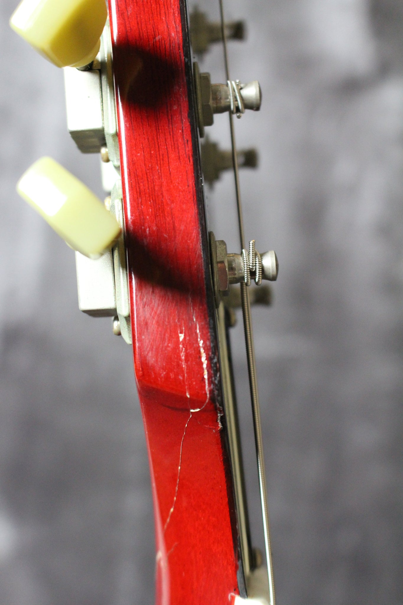 Cosmetics: This guitar has had a neck break and has been repaired. It has light surface scratches throughout and some small indentations. The back has worn slightly to a satin like finish. The back of the neck has a few very small indentations. The pickguard has regular wear. The frets are still in great shape.