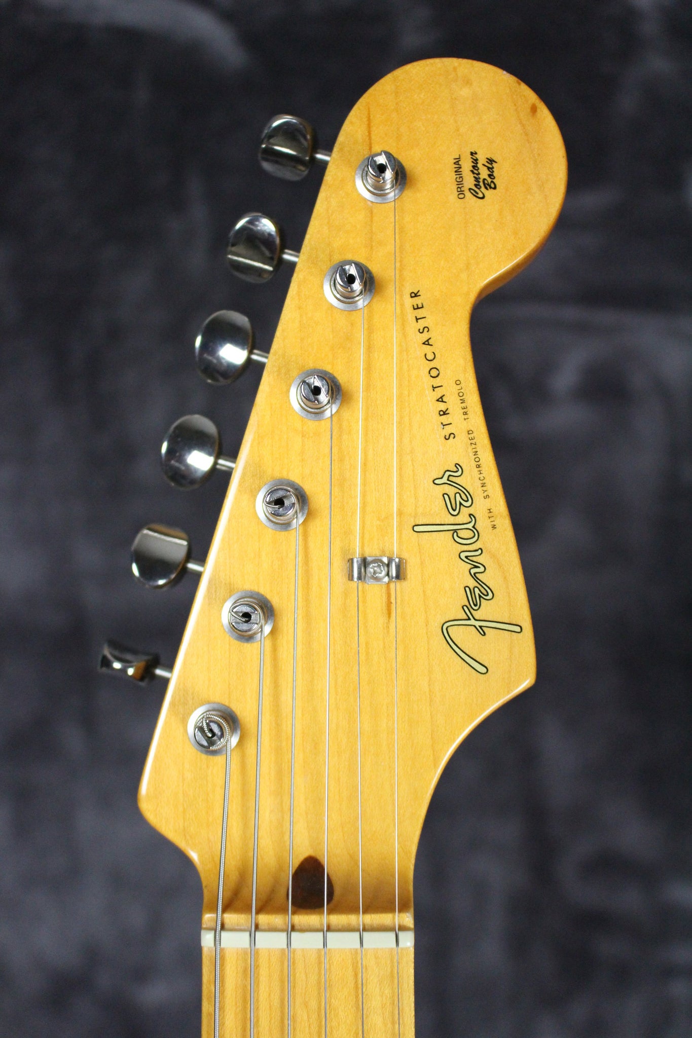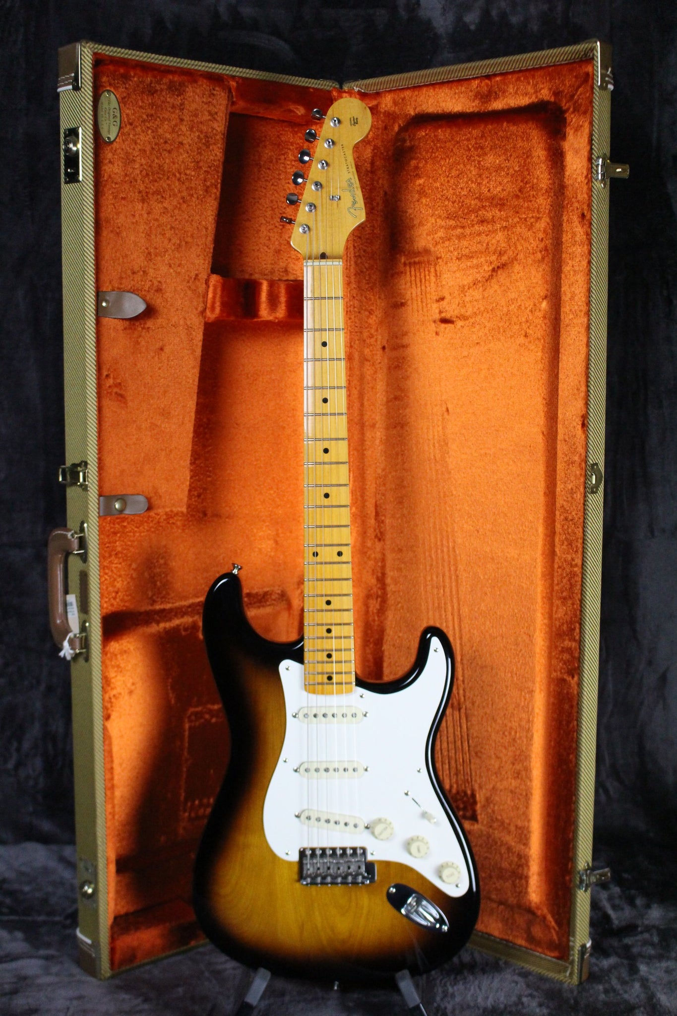 Summary: One of the most popular instruments in history, the Fender Stratocaster is the most imitated electric guitar ever. 1957 was a landmark year for the instrument; it had evolved from its early incarnations into an archetype, and it was the high point of the maple-neck era. Features include an alder body, American Vintage single-coil pickups, five-way switch, beveled pickup magnets, and a single-ply pickguard.
