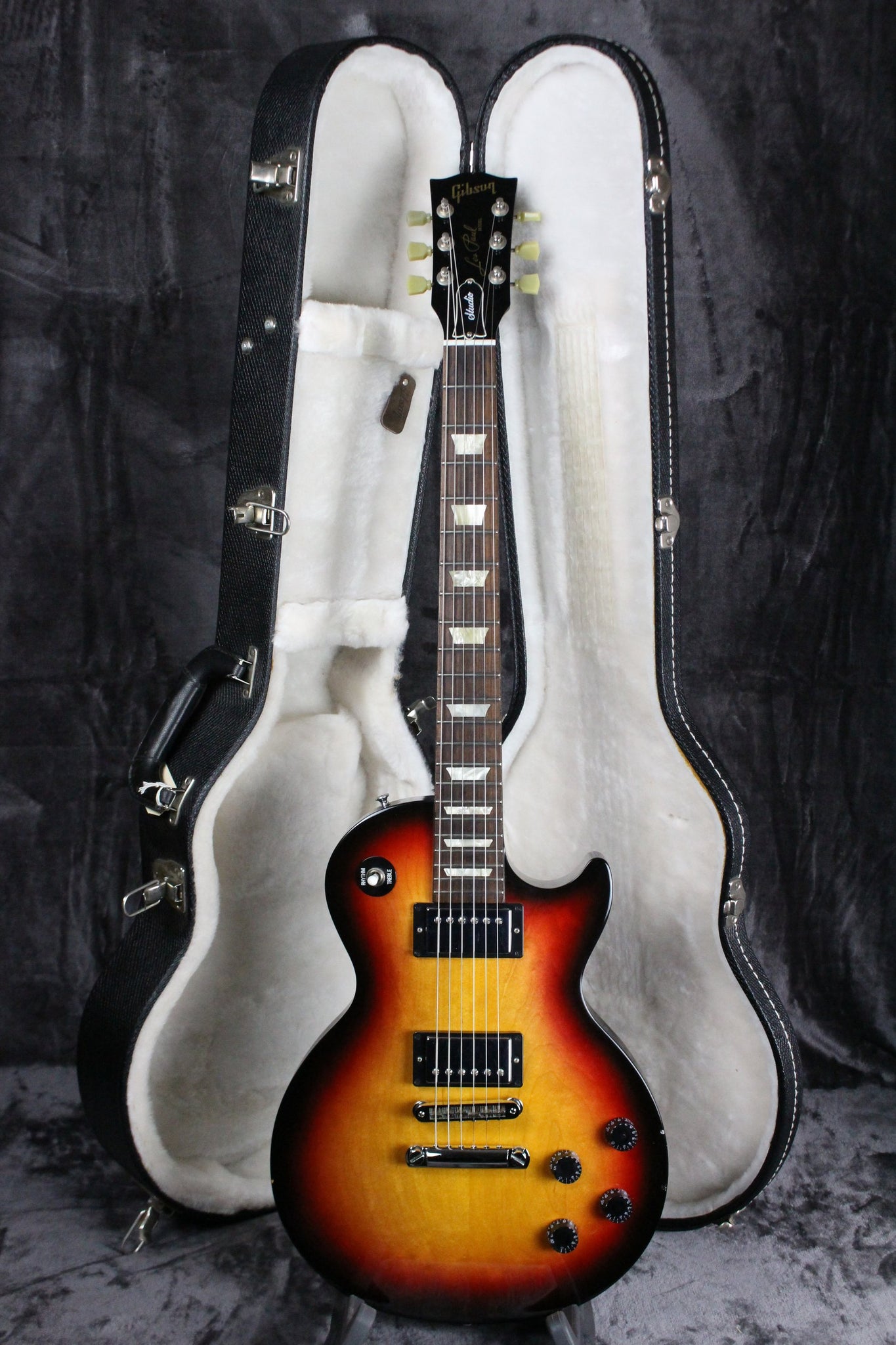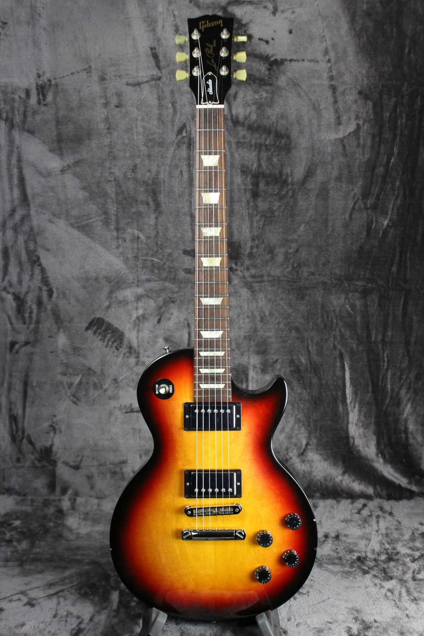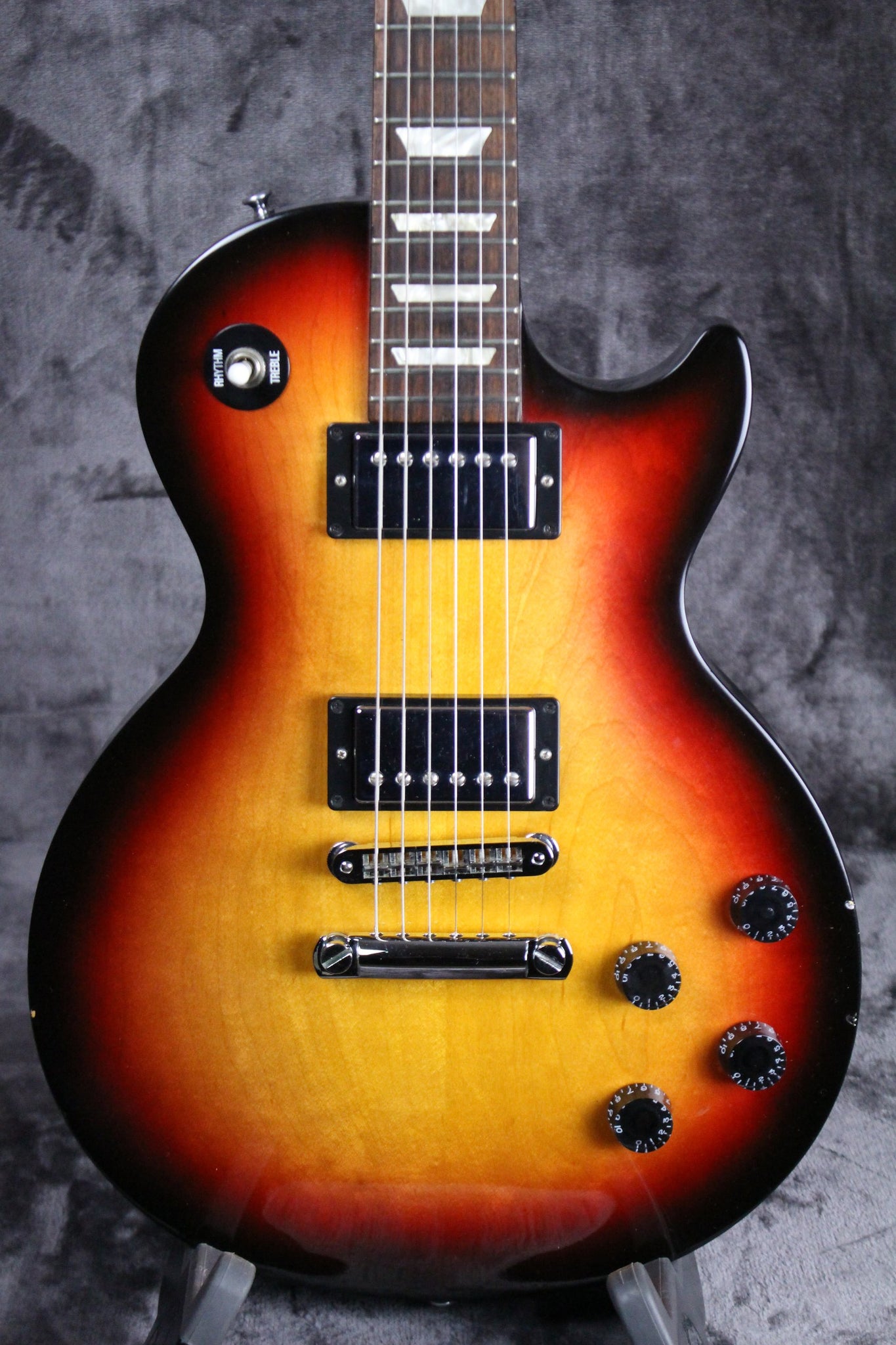 Summary: This Les Paul Studio features factory-installed 490R (rhythm) and 490T (treble) pickups. These "Modern Classic" pickups feature tonal characteristics similar to the '57 Classic, but deliver a slight increase in the upper mids, for a more contemporary humbucking sound. The Les Paul Studio's mahogany neck is carved with a 1959 rounded profile for authentic feel. The fingerboard on this Fire Burst model is rosewood, with full-size pearloid trapezoid inlays. The Les Paul Studio's 22-fret neck and 24 3/4" scale length make for an easy playing, riff-friendly electric guitar.