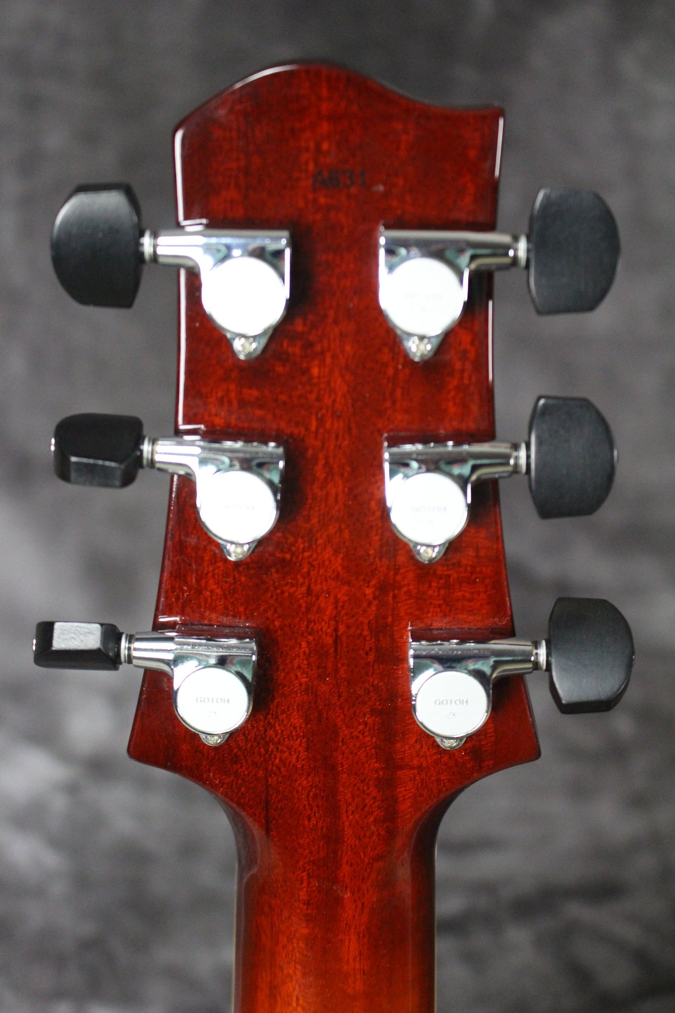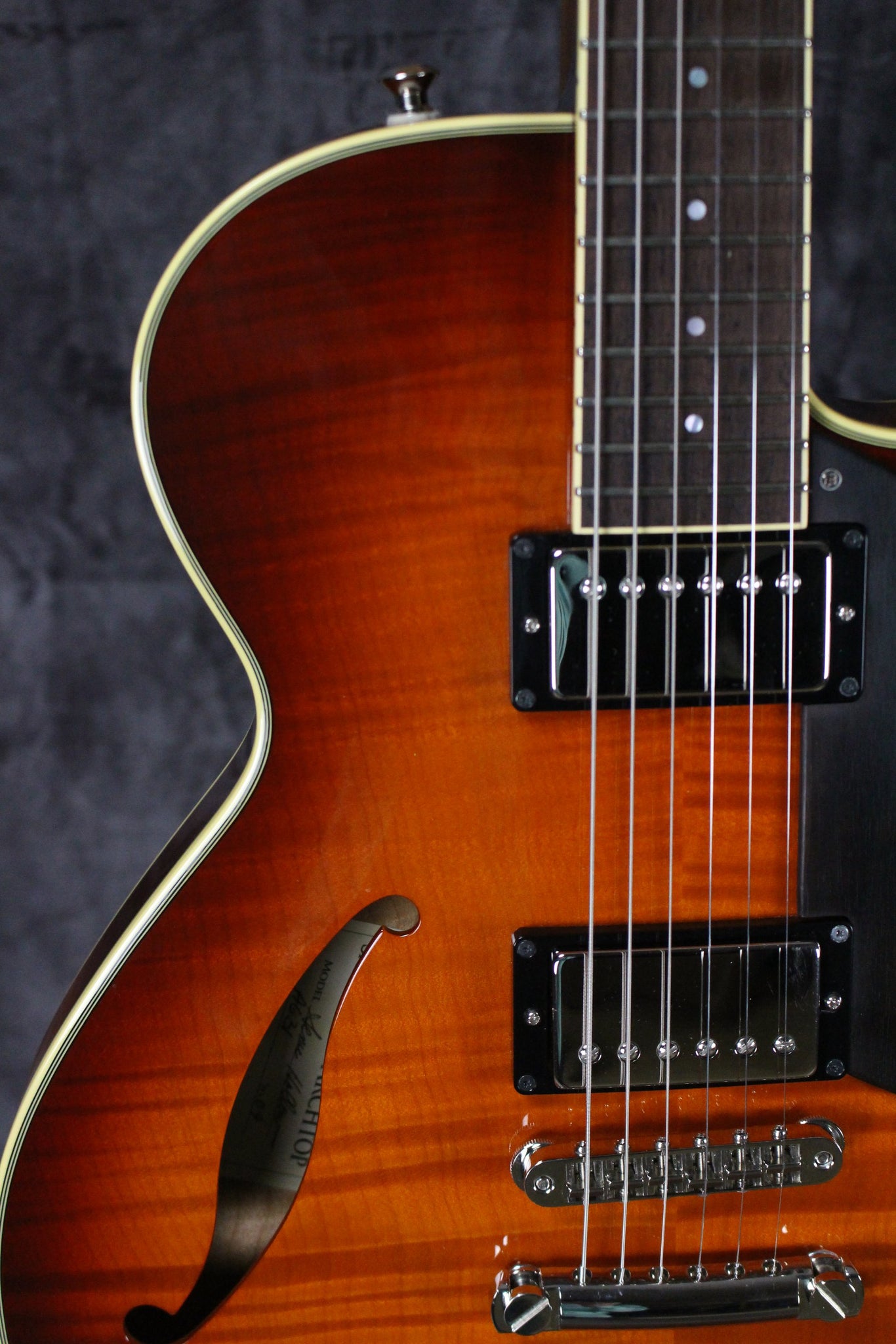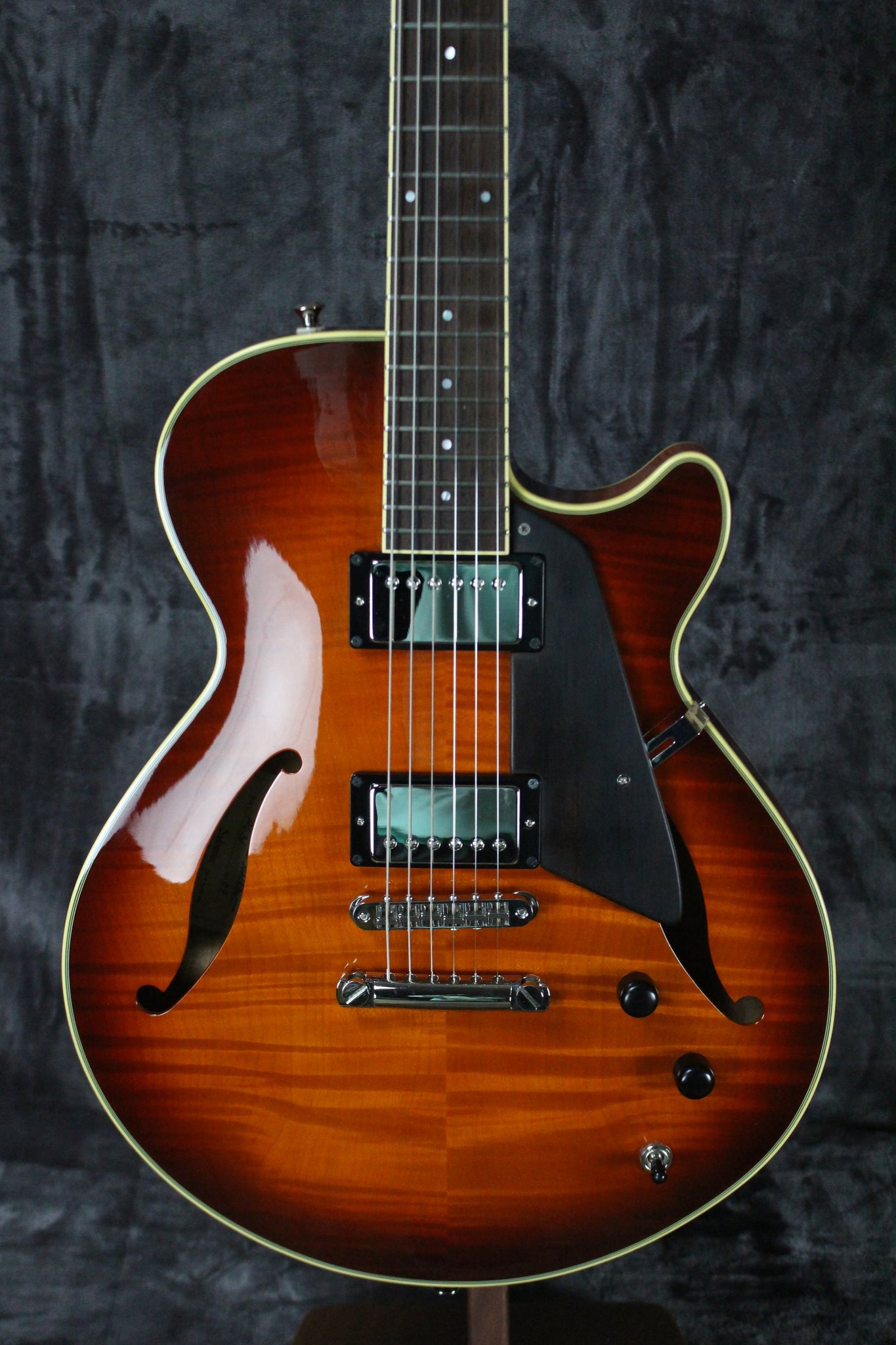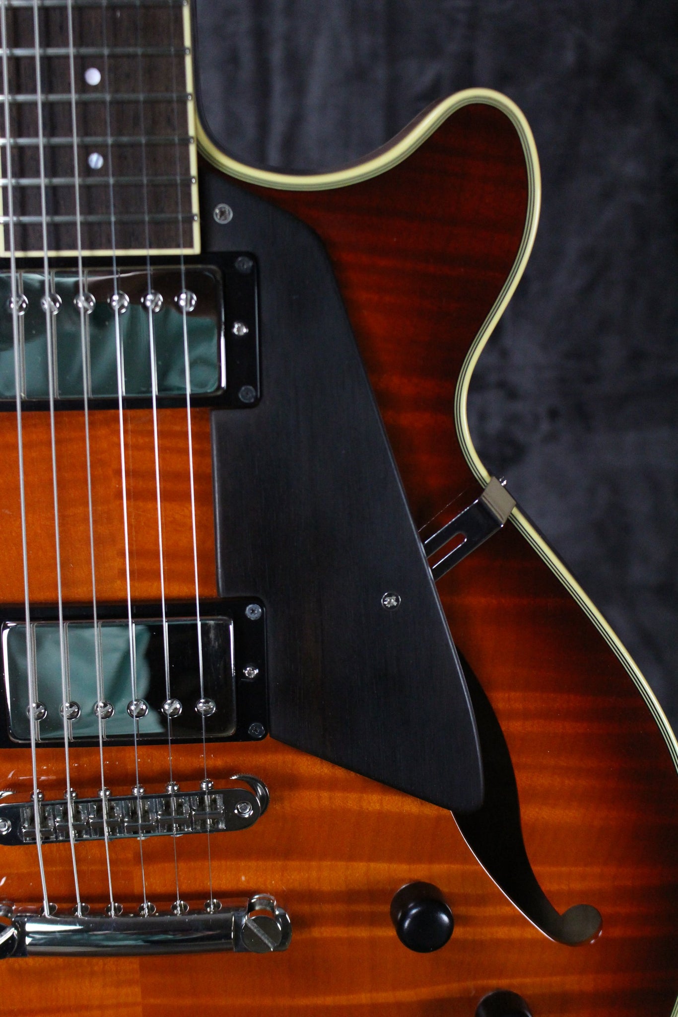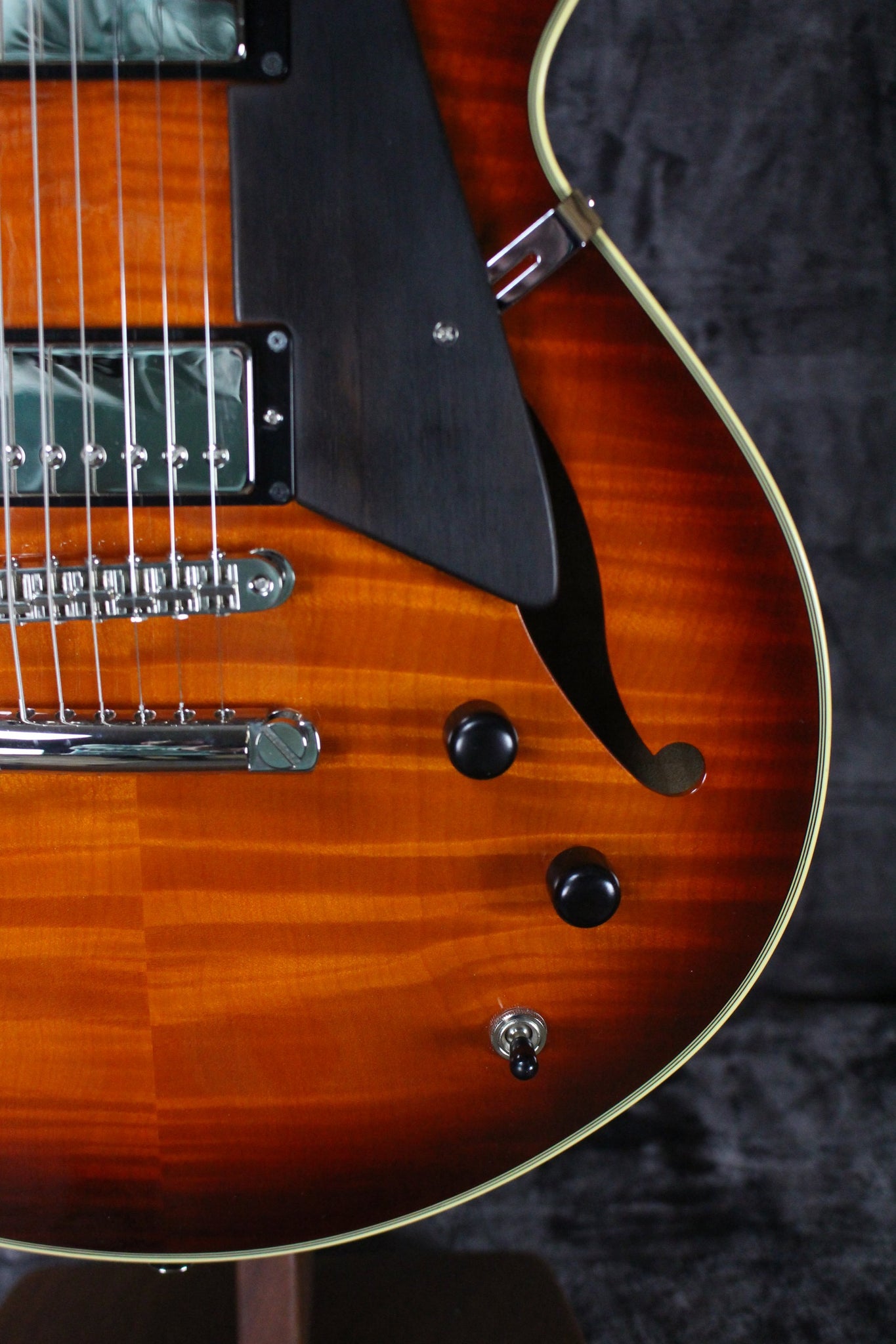 Body: 15" body width at lower bout, 5-ply flamed maple laminate with chambered spruce center block, 1 3/4" body depth, with scraped binding in Sienna Burst finish.