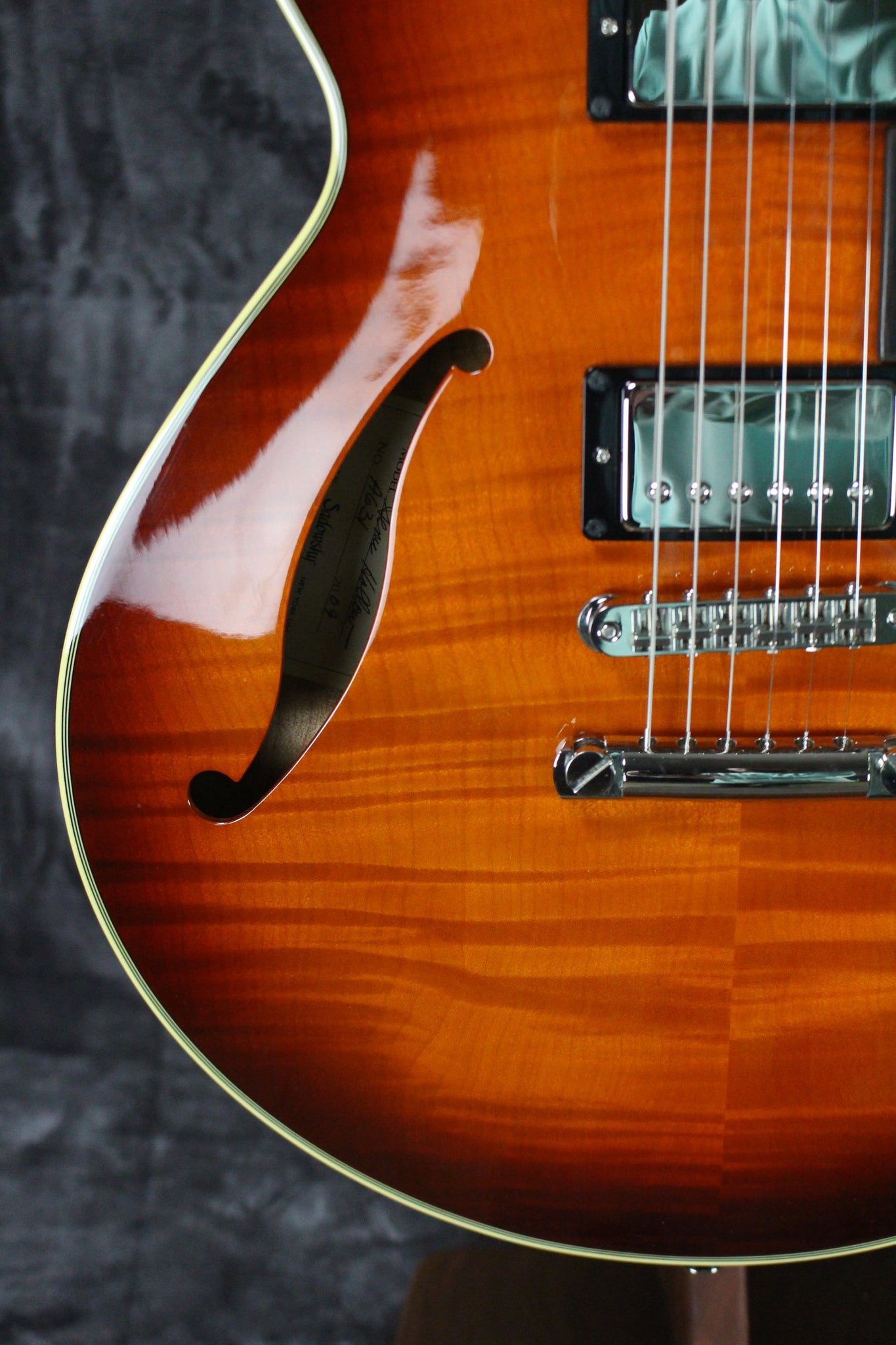 This 2009 Sadowsky Archtop Semi Hollow is constructed of highly flamed 5-ply arched Maple, specifically crafted to optimize amplified tone while suppressing feedback. The thinline version of the popular Jimmy Bruno model, the Semi-Hollow is a delight to hold, and a breeze to tote to the gig. The gentle D neck profile is particularly inviting, and the smooth fretwork on the solid Amazon Rosewood fingerboard board all make for an exceptionally nimble playing experience. Advanced design features include the extended cutaway body for enhanced fret access, and the chambered body, much lighter than conventional slimline guitars.
