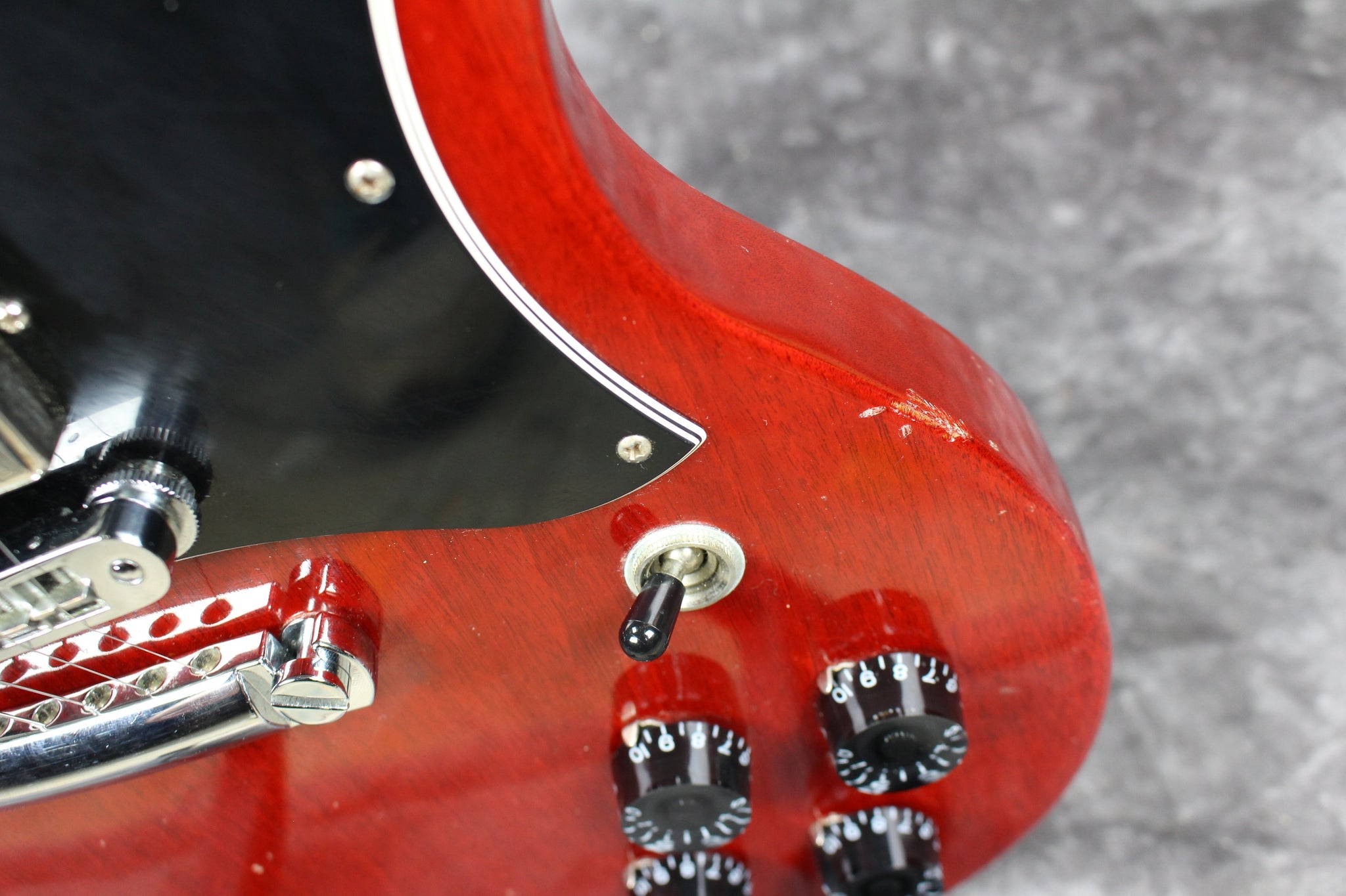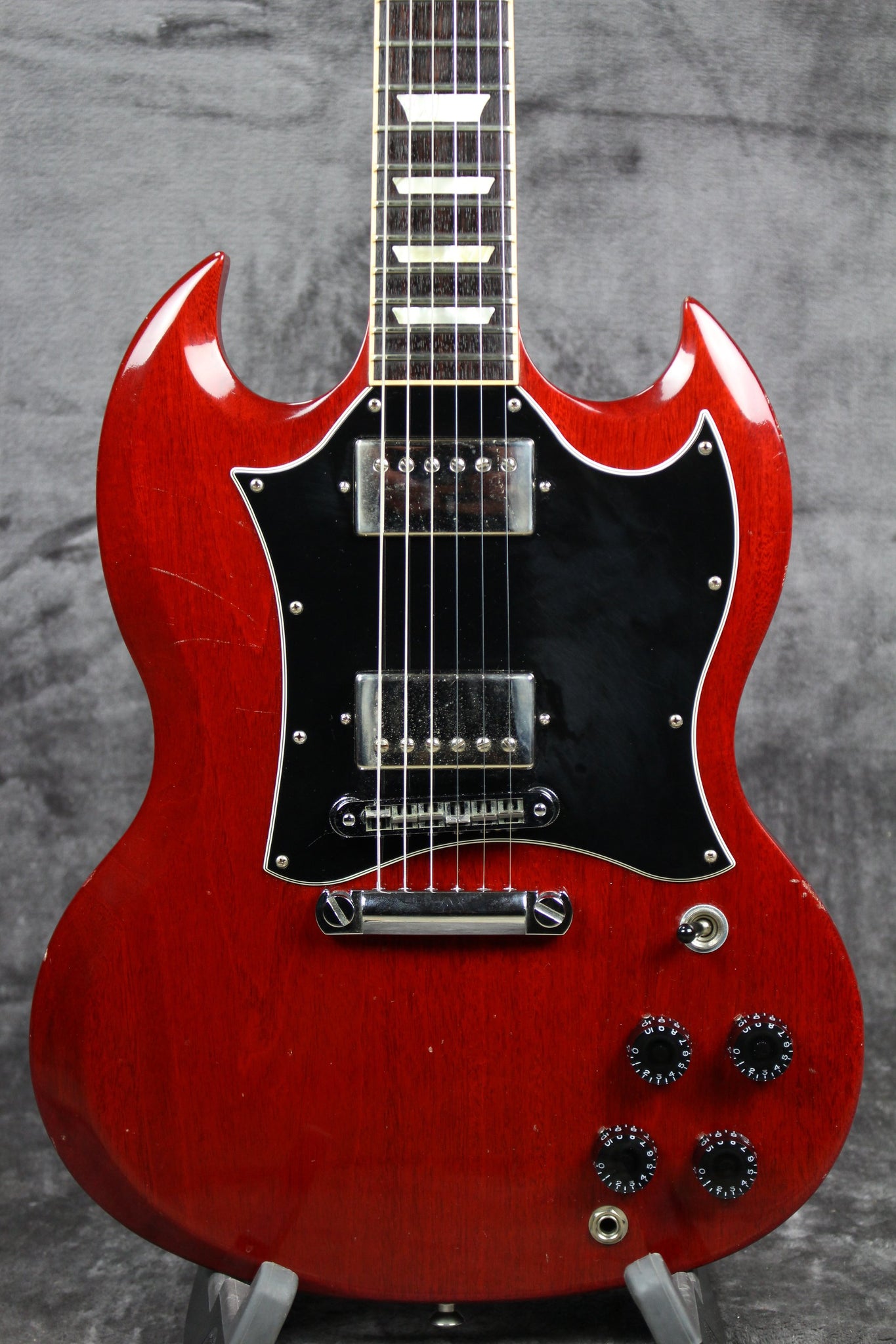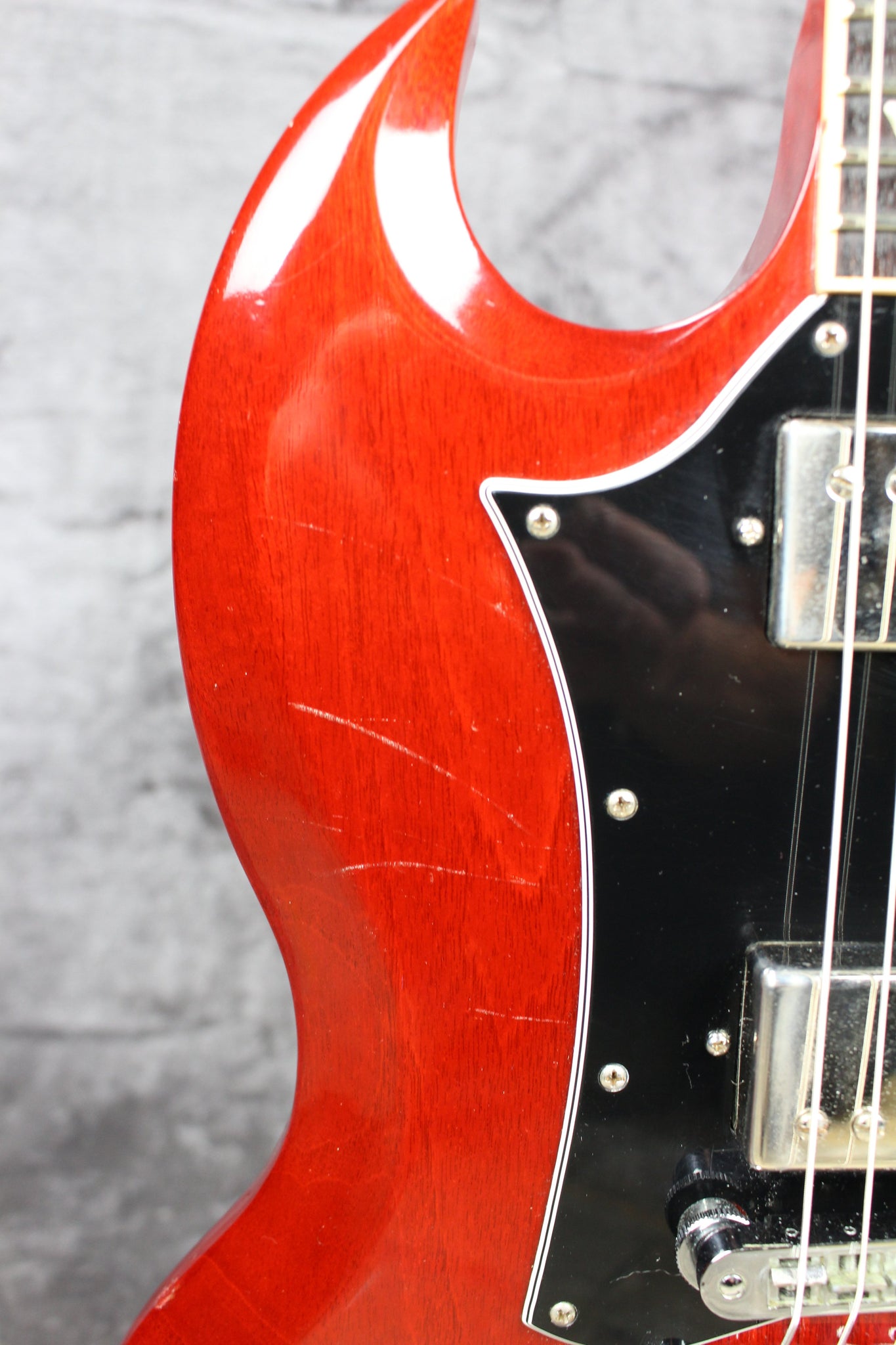 Cosmetics: This guitar has small scratches and dents on most of the body. The pickguard has regular pick wear. The neck has a few scratches and dents. Overall, this guitar has been gigged with but plays and feels great.