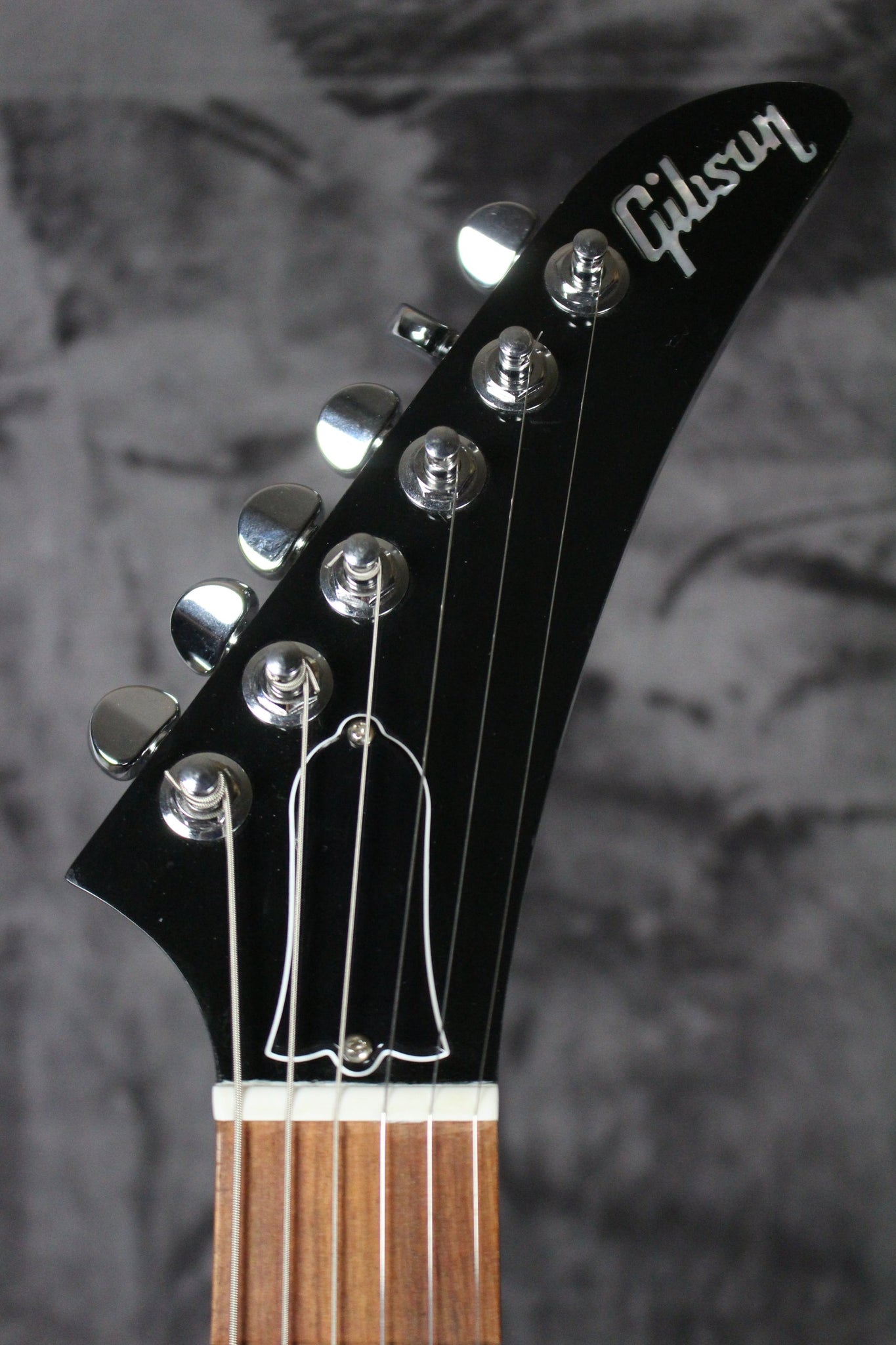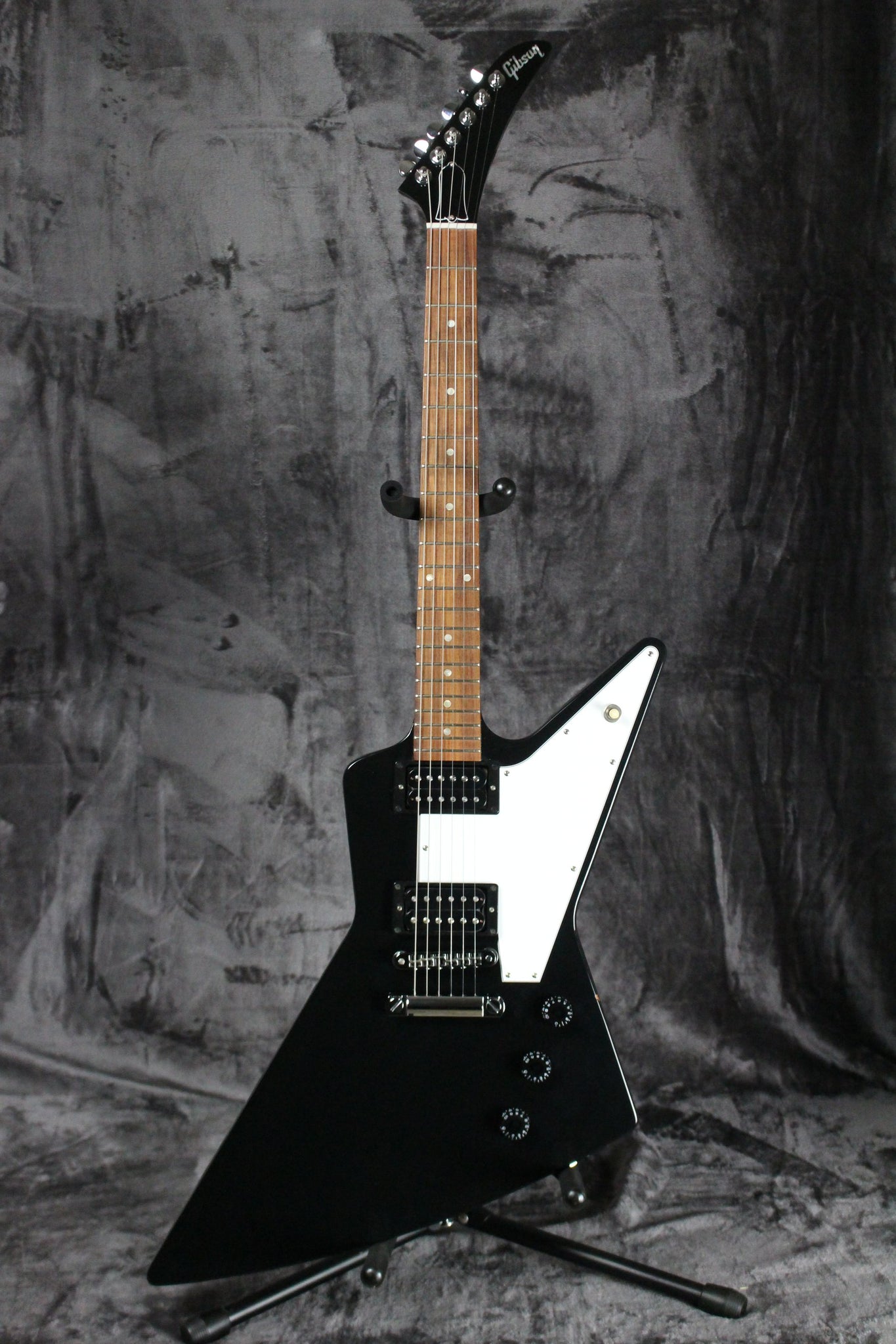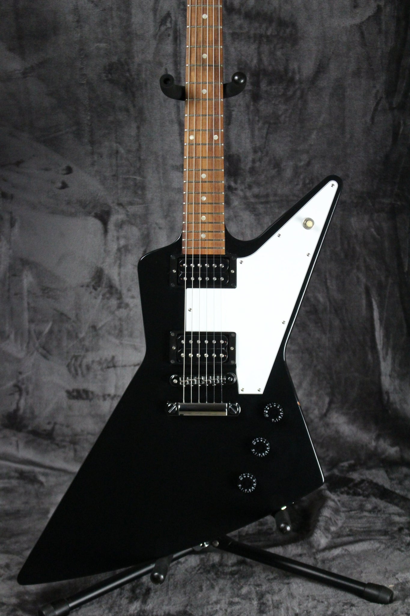 Summary: After a decade of rapid revisions and tiers of the Explorer, Gibson went back to its roots in 1990, pulling the new Explorer's design from the original 1976 re-release. This design would remain in production under various names until the mid-2010s. This Explorer was built in 2012, has an ebony finish, two hot Gibson humbuckers, and the Grover tuning keys provide great tuning stability.