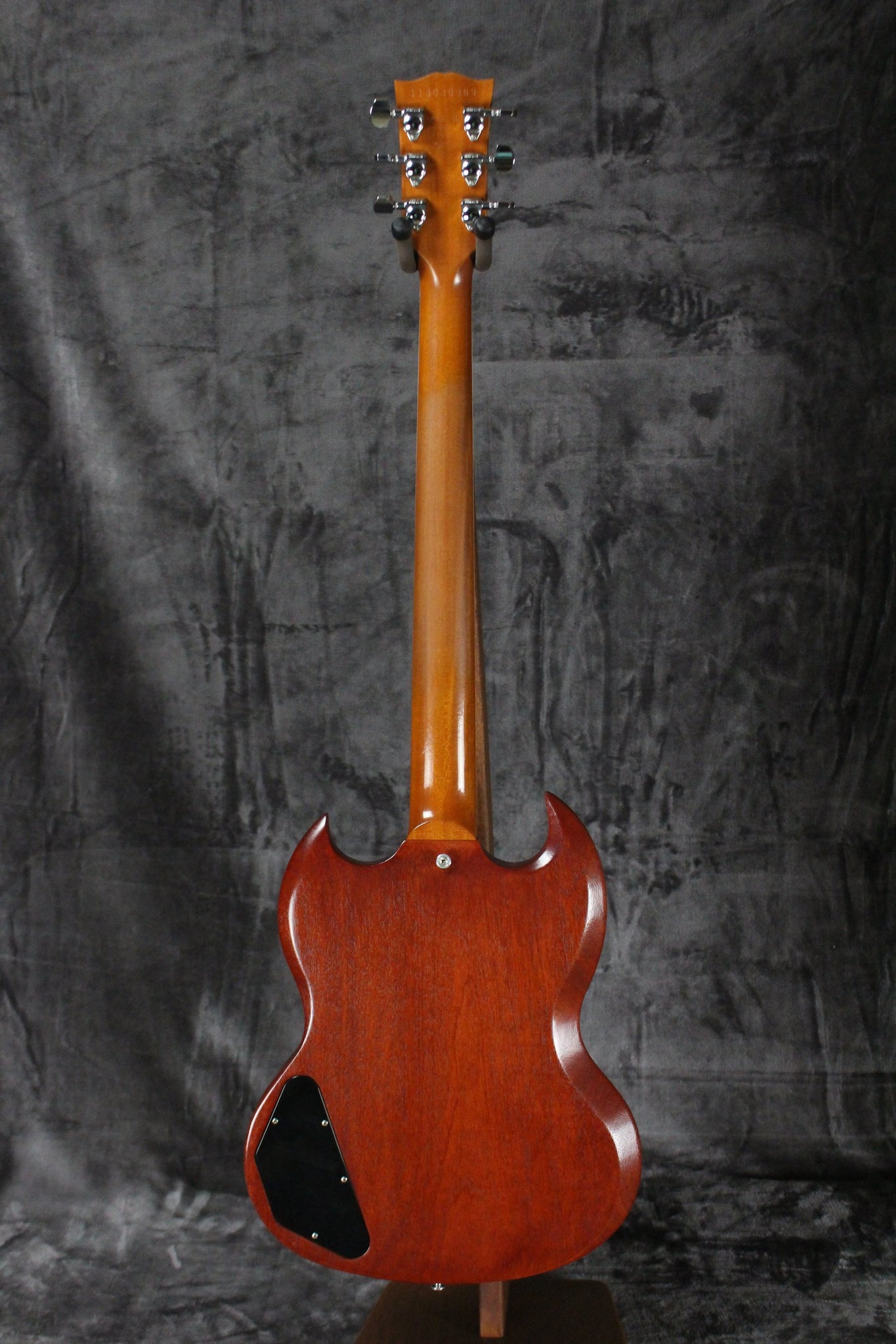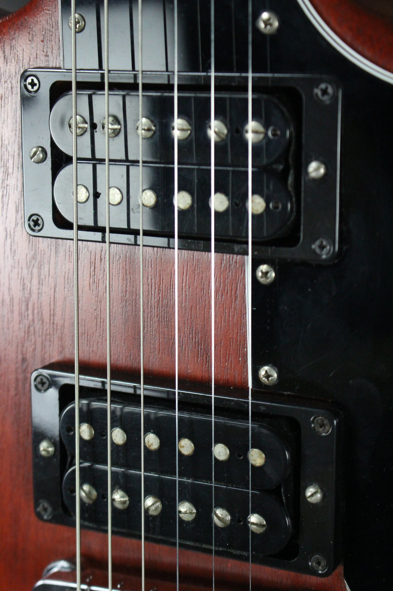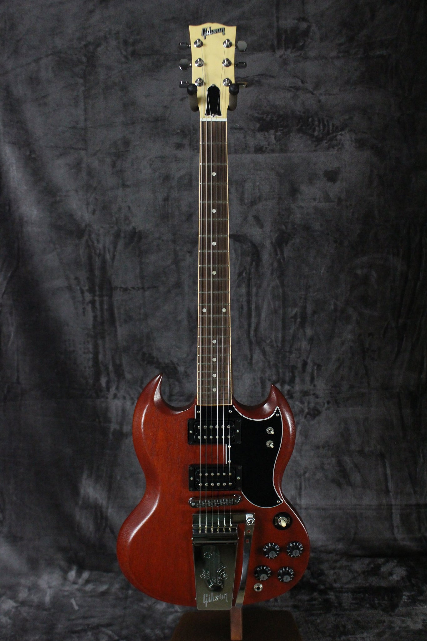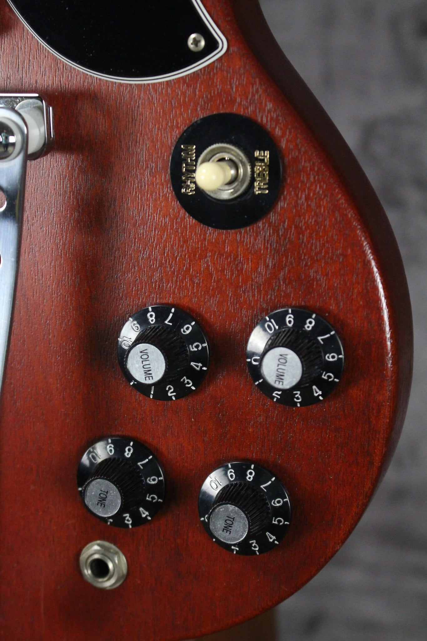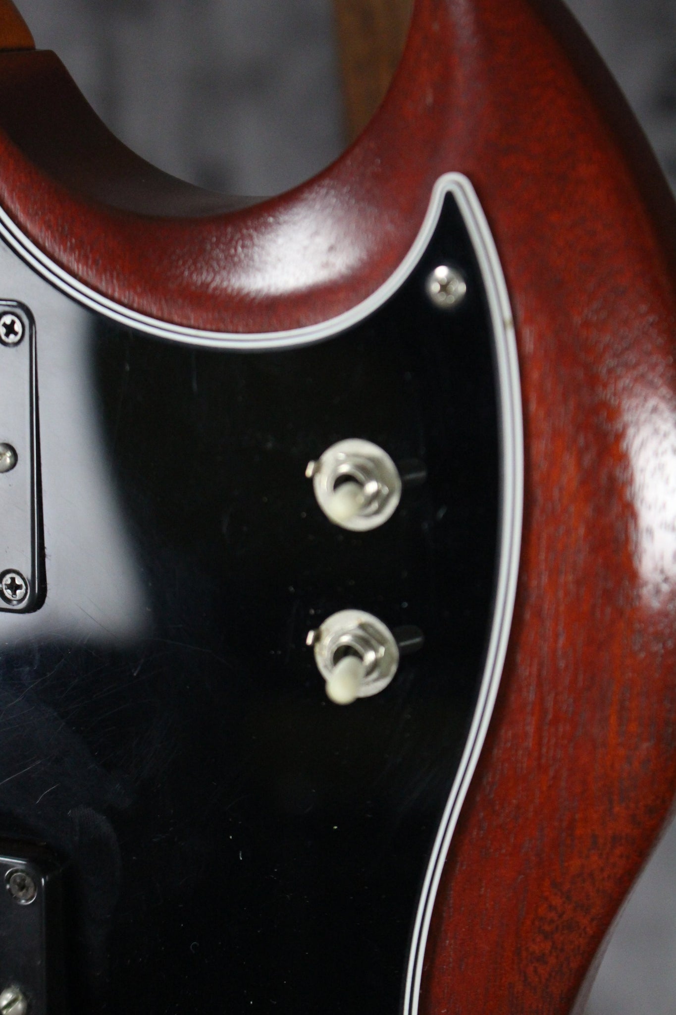This 2013 Gibson Frank Zappa Roxy SG is a replica of Frank’s modded SG used in the live performances with his band The Mothers at the Roxy Theatre in Hollywood from December 1973 and after—documented in the album Roxy & Elsewhere, are often considered to display the pinnacle of his unbridled invention. Production was limited to 400 units.The heavily modified state of FZ’s guitar still functions perfectly as a straight-up vintage-reissue SG when desired but just flip either of the two mini-toggle switches to split the uncovered humbuckers’ coils, or to throw the pickups out of phase, and you leap into funky Zappa-certified tones, all aided by the highly functional Maestro-style vibrola with Lyre tailpiece. With its natural neck and headstock, and a carefully color-matched rendition of FZ’s faded nitrocellulose Cherry finish, the Frank Zappa Roxy SG looks every bit as distinctive as it sounds.