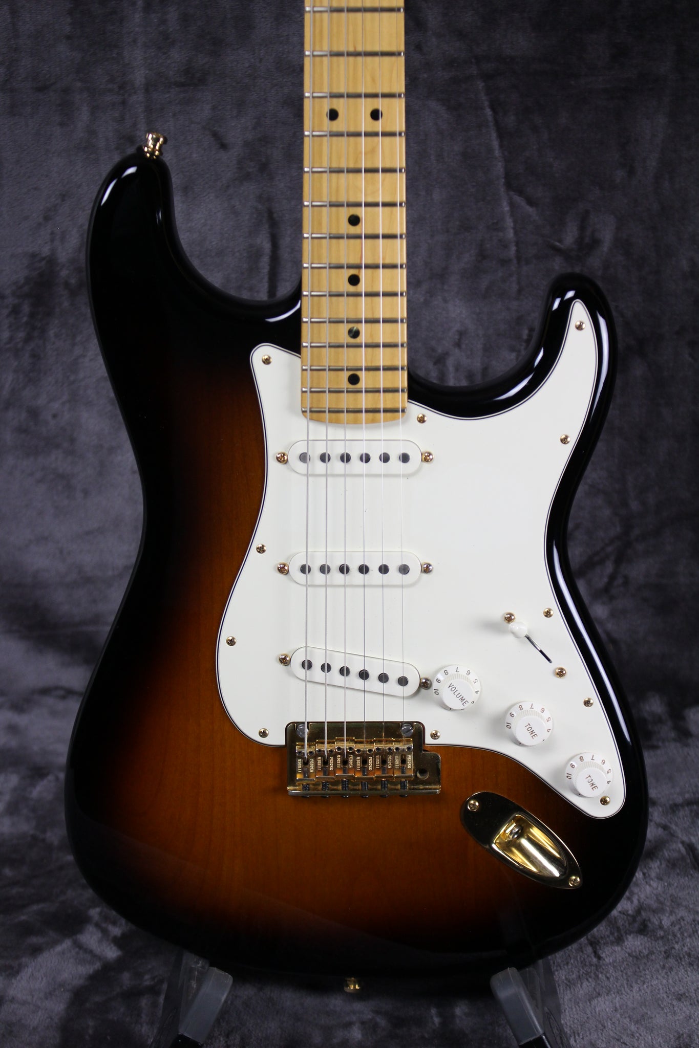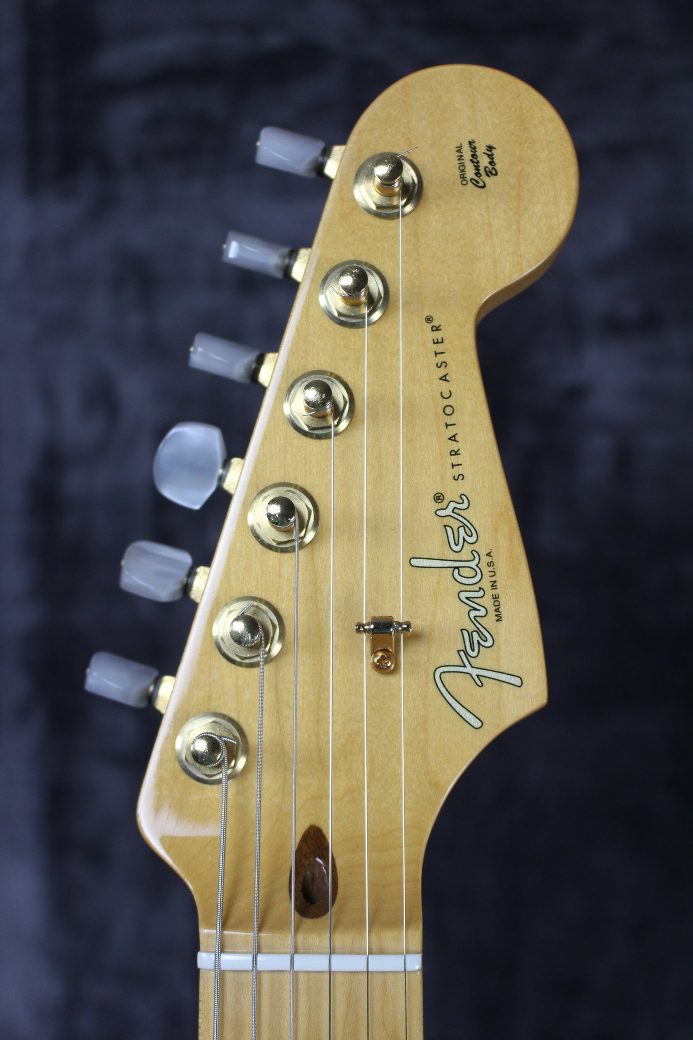 Pickups/Hardware: Special-Design 1954 Strat Single-Coil pickups, Deluxe Cast/Sealed with Pearl Button tuning keys, 2-Point Synchronized Tremolo with Vintage-Style Stamped Steel Saddles, Parchment plastic knobs, synthetic bone nut.