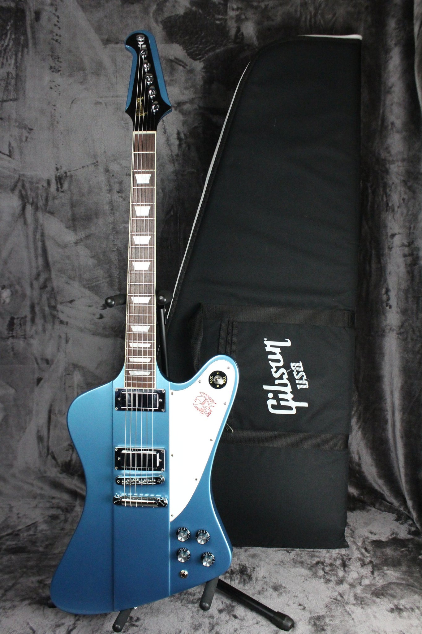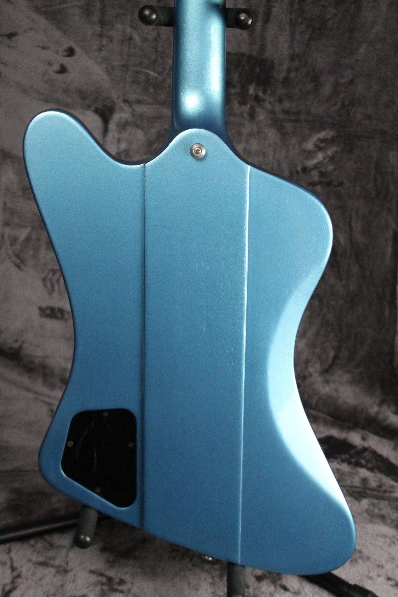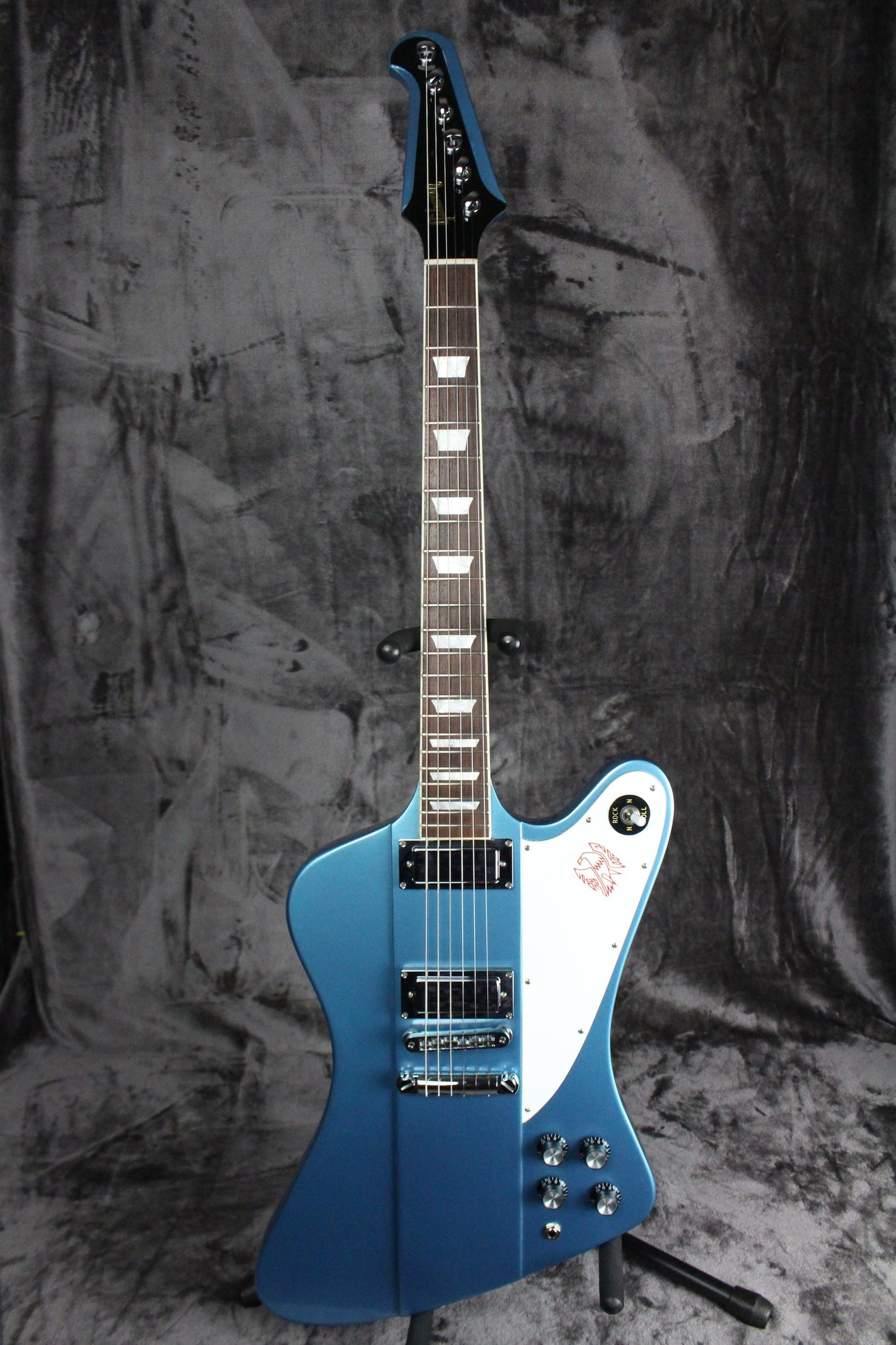 Pickups/Hardware: Two mini humbuckers, Steinberger gearless tuning keys, tunomatic bridge/stop bar tailpiece, 2x volume/2x tone controls/3-way pickup selector, white pickguard with Firebird logo.