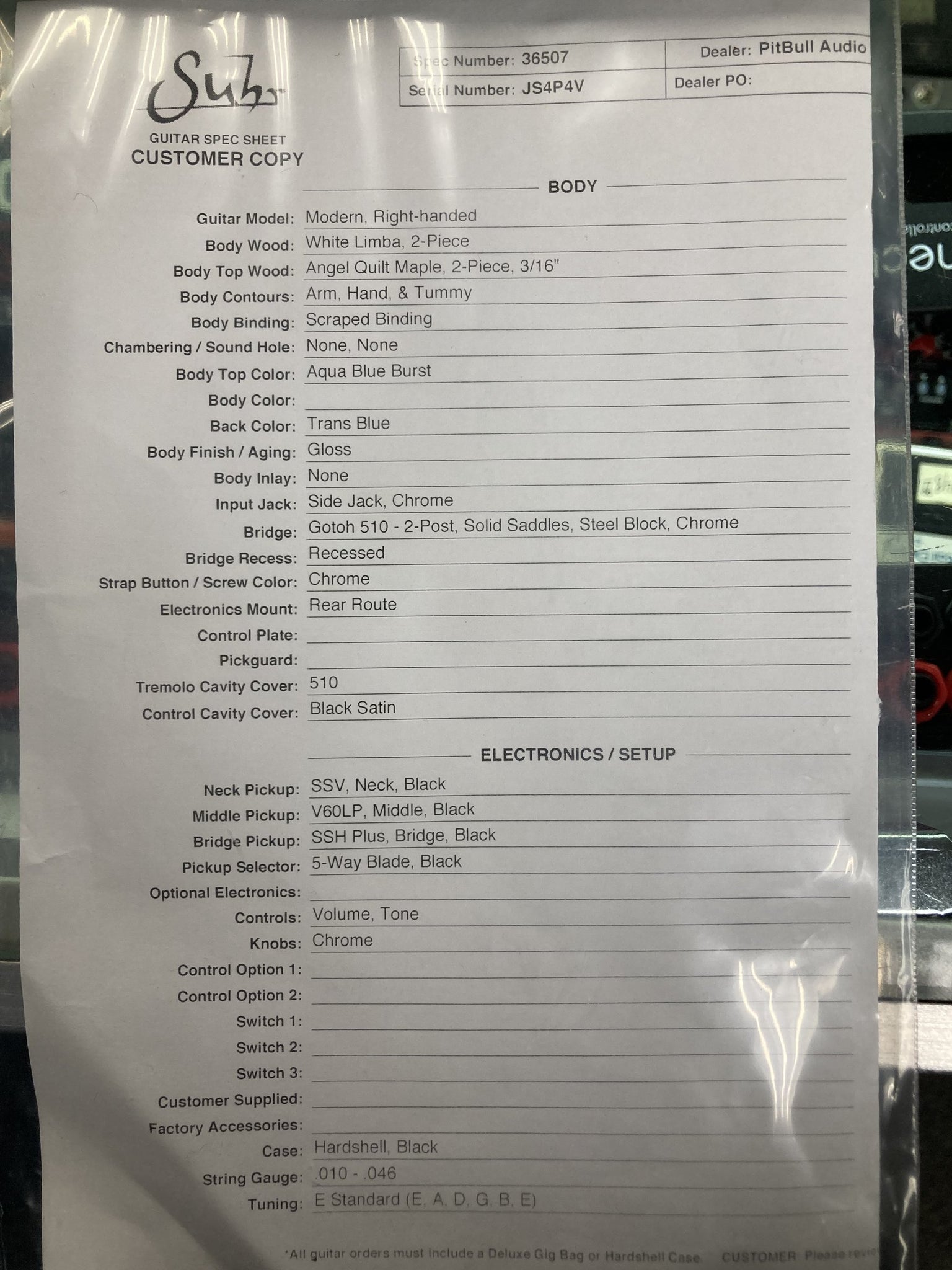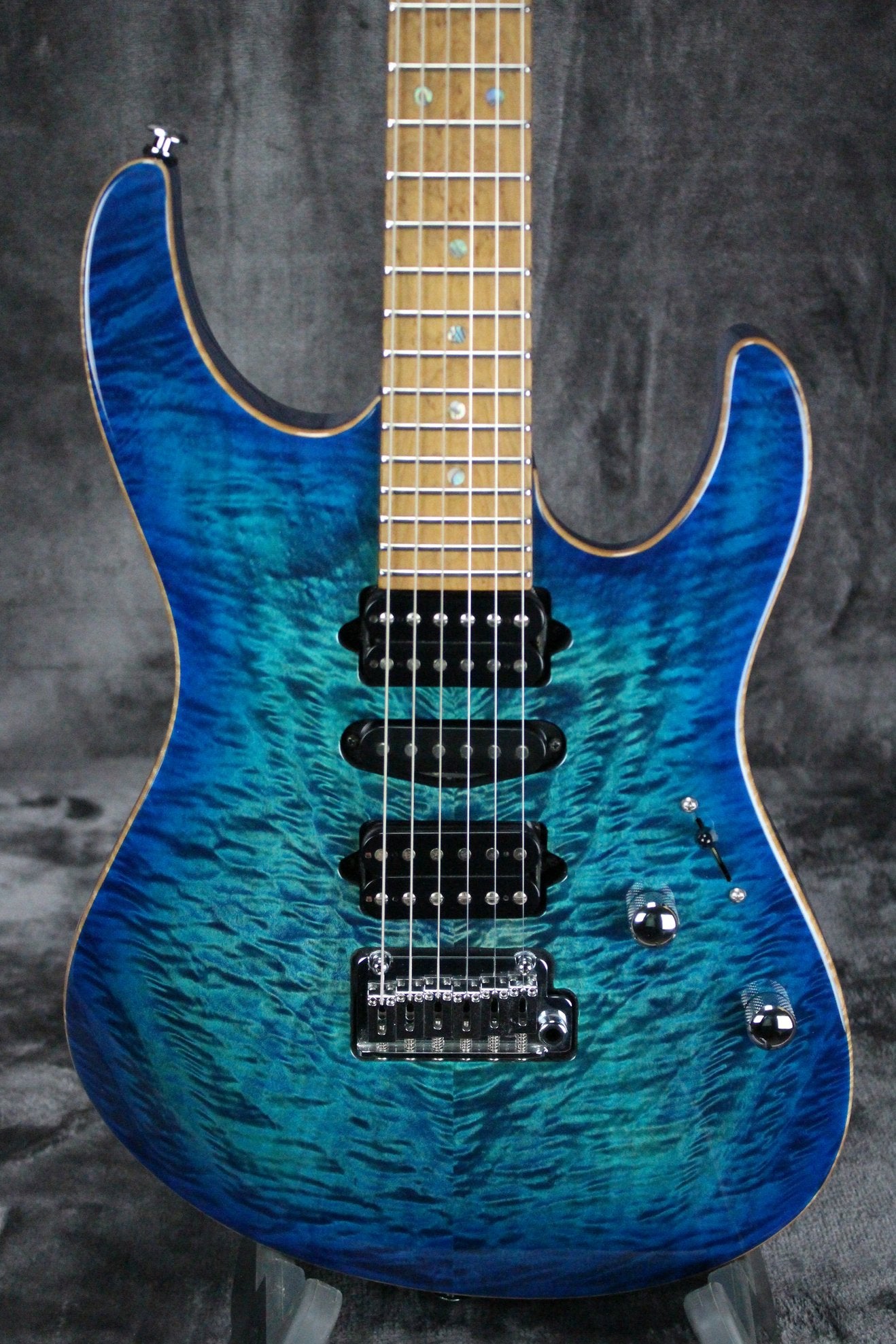 Summary: This Modern features a Roasted Maple neck with a 3A Roasted Birdseye Maple fingerboard. This Modern has specifications including the sleek elliptical neck profile, balanced asymmetrical 2-piece White Limba body, innovative neck heel and a stunning 2-piece Angel Quilt Maple top finished in an Aqua Blue Burst. The Suhr locking tuners and the Gotoh 510 tremolo provides superior tuning stability.