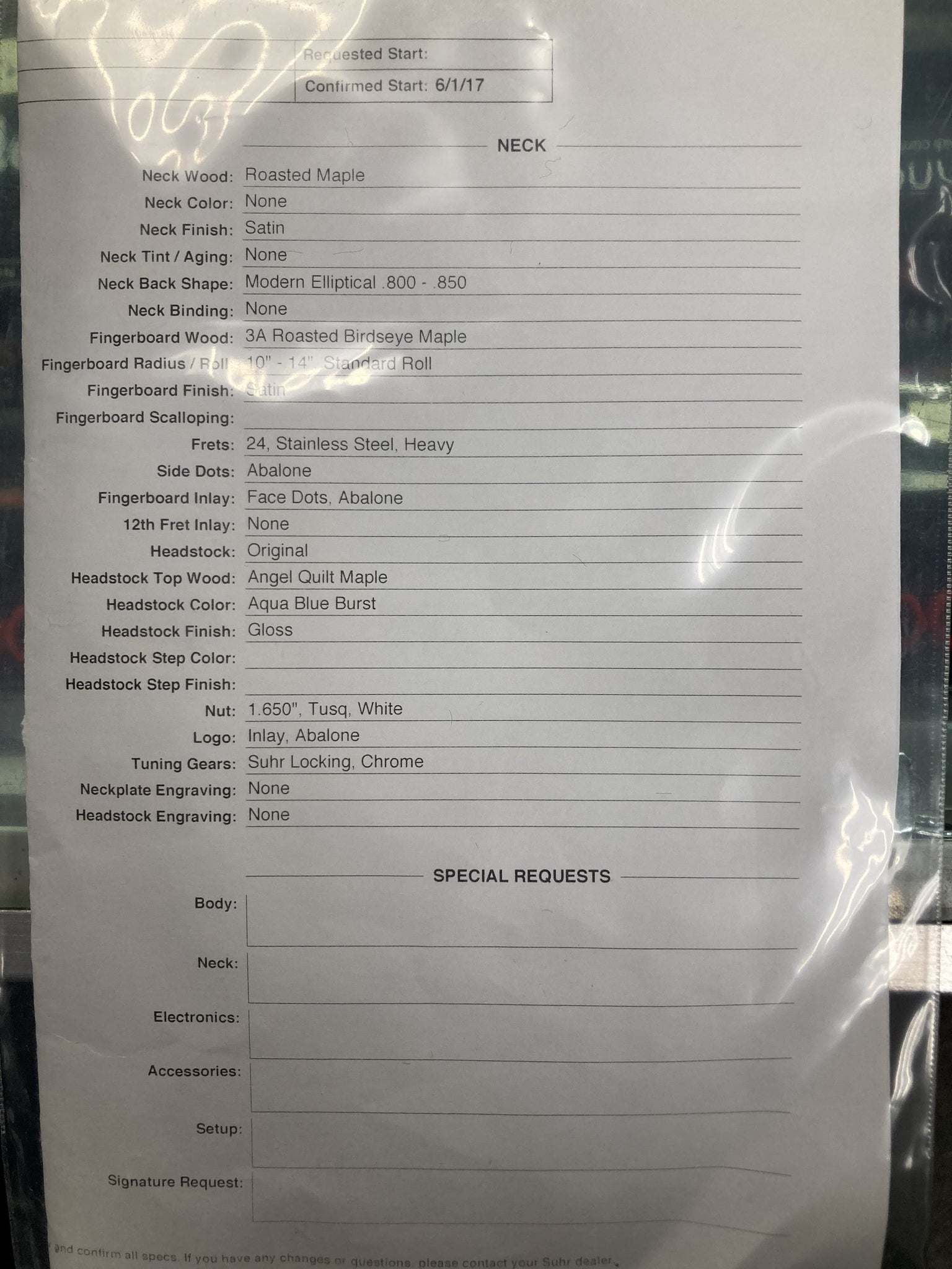 Neck: Roasted Maple with a 3A Roasted Birdseye Maple fingerboard, 1.650” nut width, white tusq nut, 10”-14” radius/standard roll, 24 stainless steel/heavy frets, matching Aqua Blue Burst headstock, satin finish, Modern Elliptical shape (.800-.850), Abalone face dots/side dots.