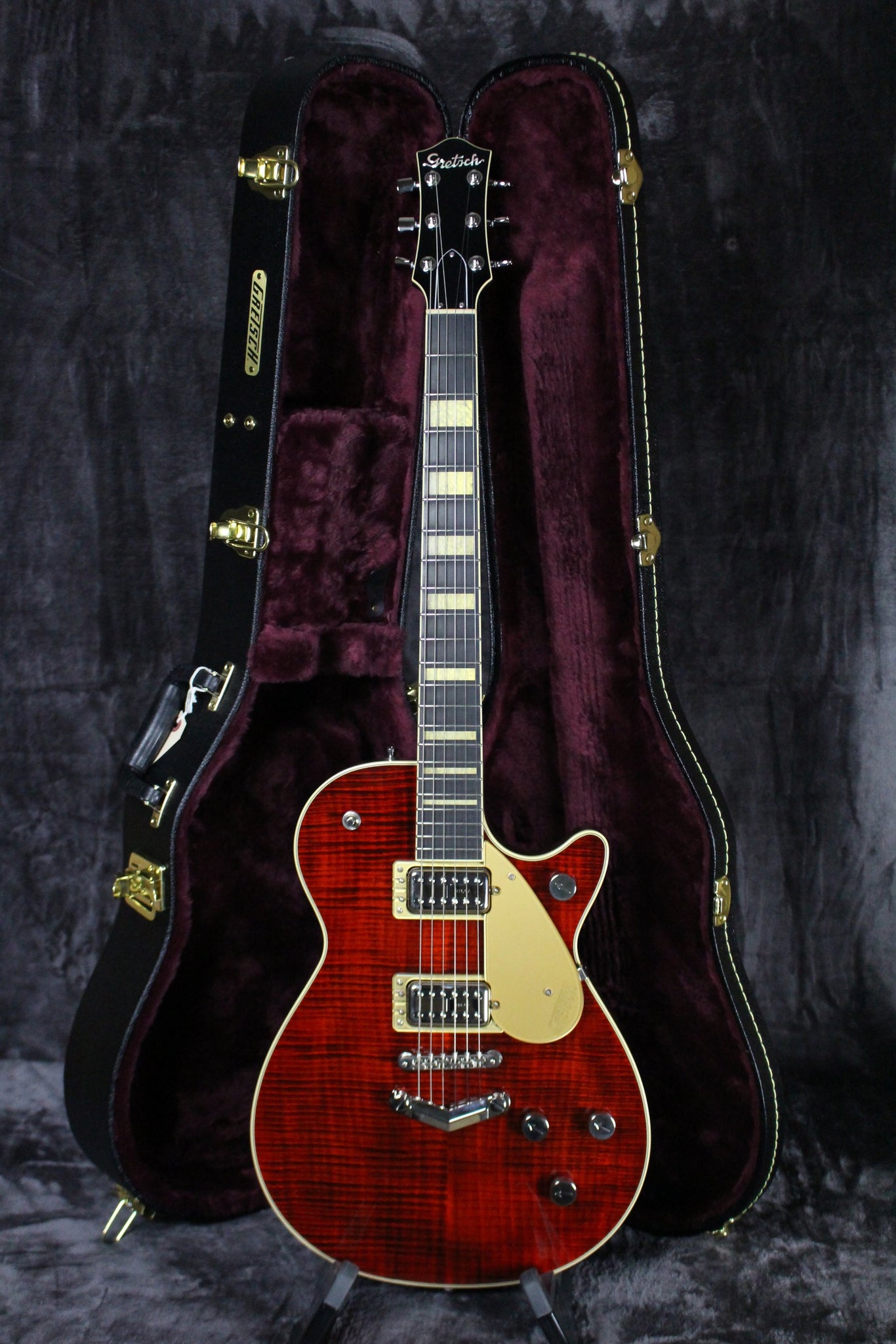 Summary: The Gretsch G6228FM Players Edition Jet BT Single-Cut with V-Stoptail and a Flame Maple top comes equipped with Gretsch Broad'Tron BT65 pickups. Designed by the famed Tim Shaw, the BT65 captures the guitar's sonic palette and reproduces powerful mids, extended lows and an exceptionally clear, yet smooth high-end. The Jet BT features a lowered neck set that greatly improves fret-hand mobility while also giving the picking hand a closer approach, increasing comfort and accuracy. This Gretsch also comes with the original hard-shell case.
