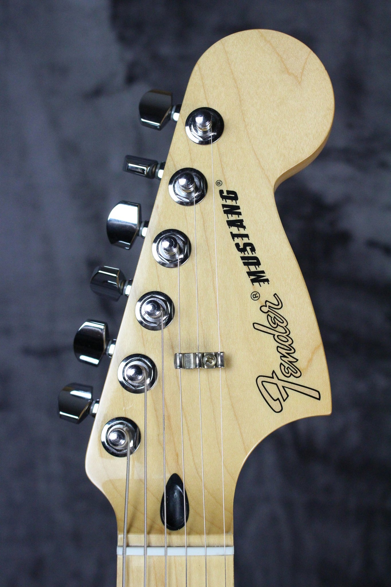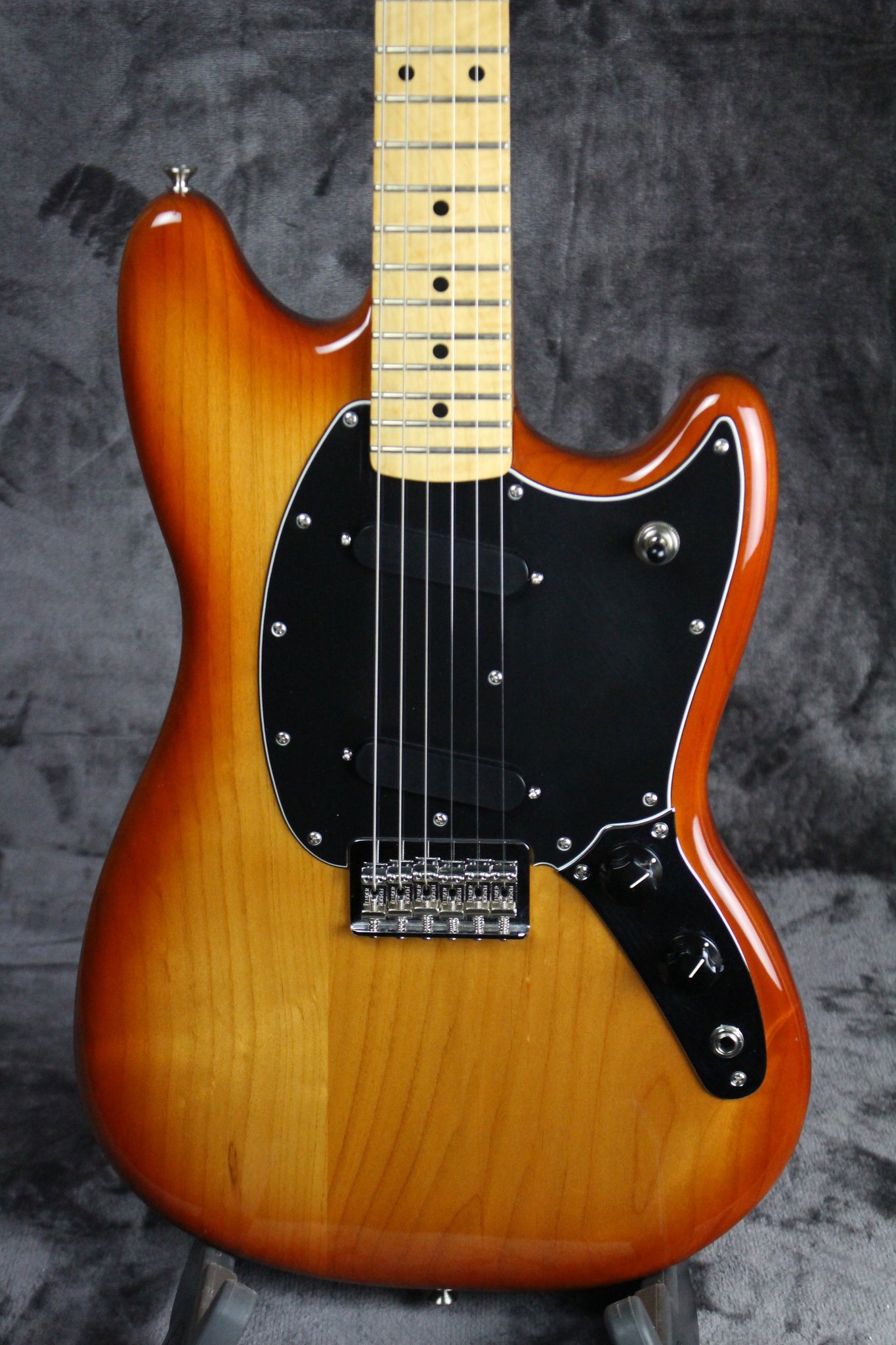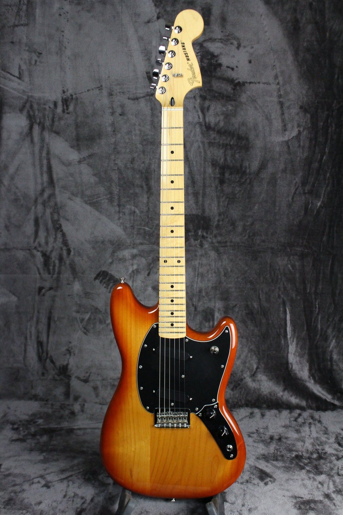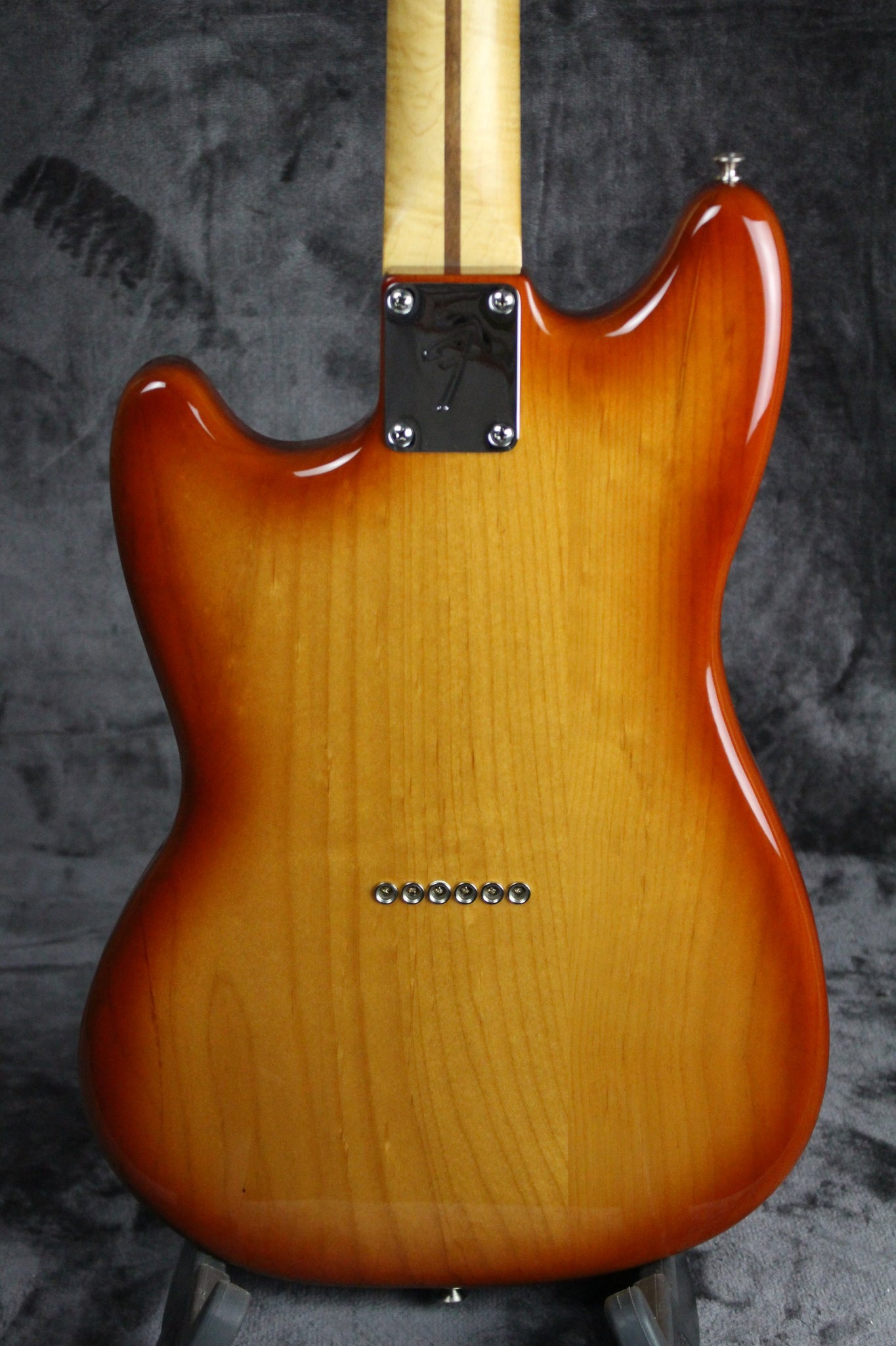 Pickups/Hardware: Two Fender Mustang single coil pickups, master volume/master tone controls/3-way pickup selector, Fender closed gear tuning keys, 3-ply black pickguard, string through the body six saddle bridge.