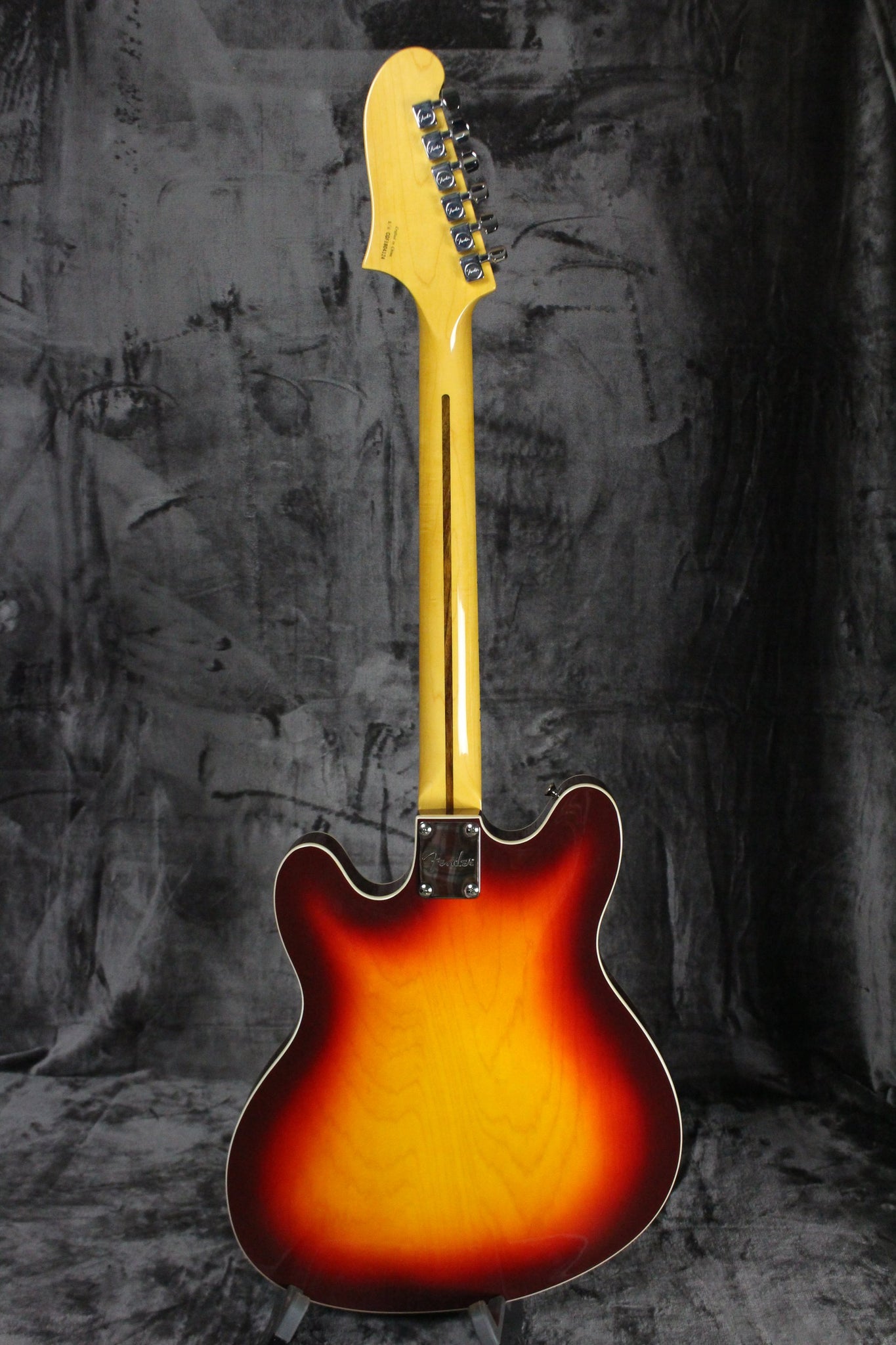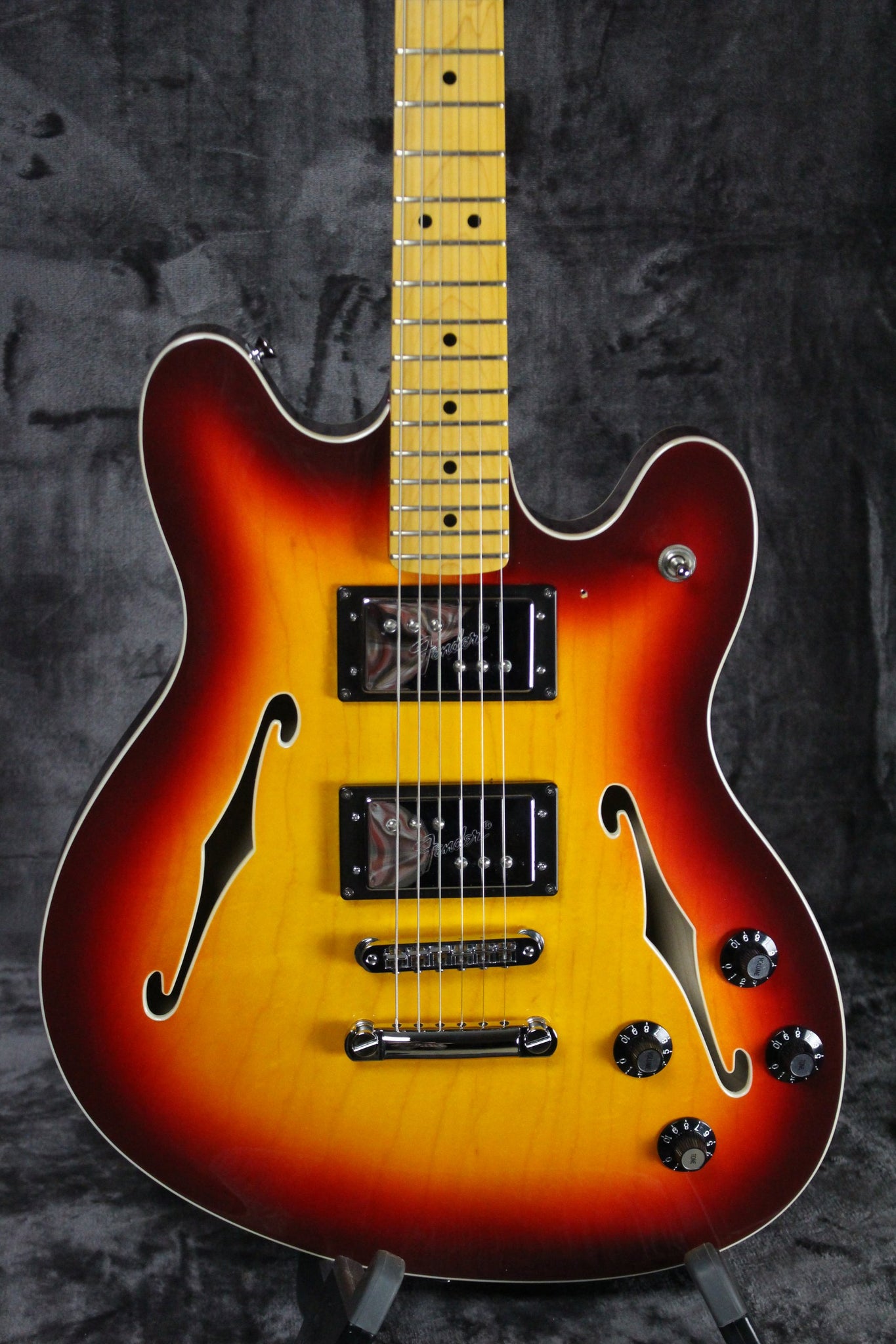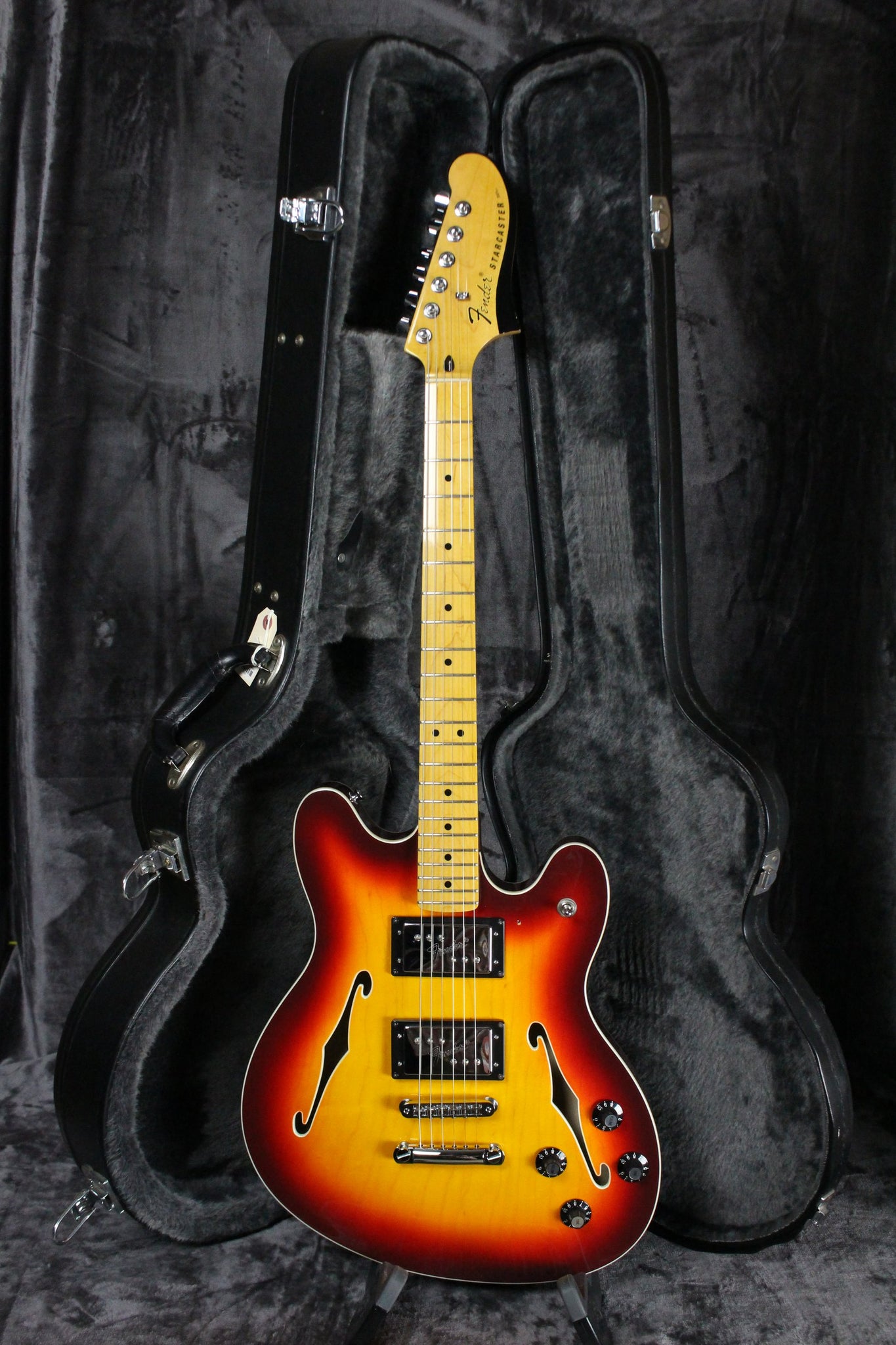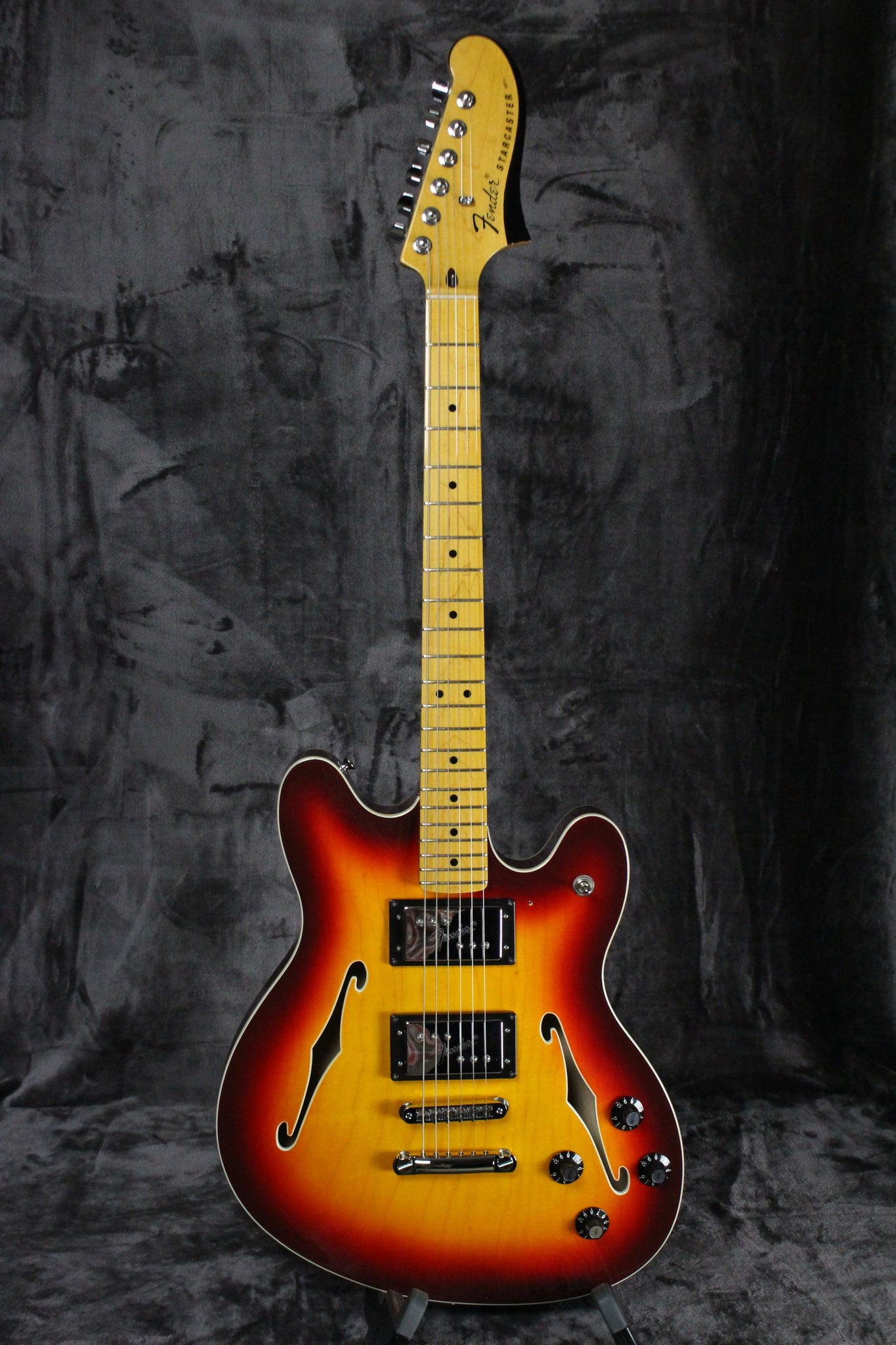 Summary: Since the mid-to-late 1970s, the Starcaster has occupied a special place in Fender history as its one-and-only offset-waist semi-hollow electric guitar. This version of the Starcaster maintains many of the features of the original including maple construction, dual f-holes and two Fender Wide Range humbucker pickups with chrome covers. The neck radius is slightly more compact at 9.5-inches and features the same 22 medium jumbo frets. Some changes include the removal of the master volume control and the addition of an Adjusto-Matic bridge with anchored tailpiece.