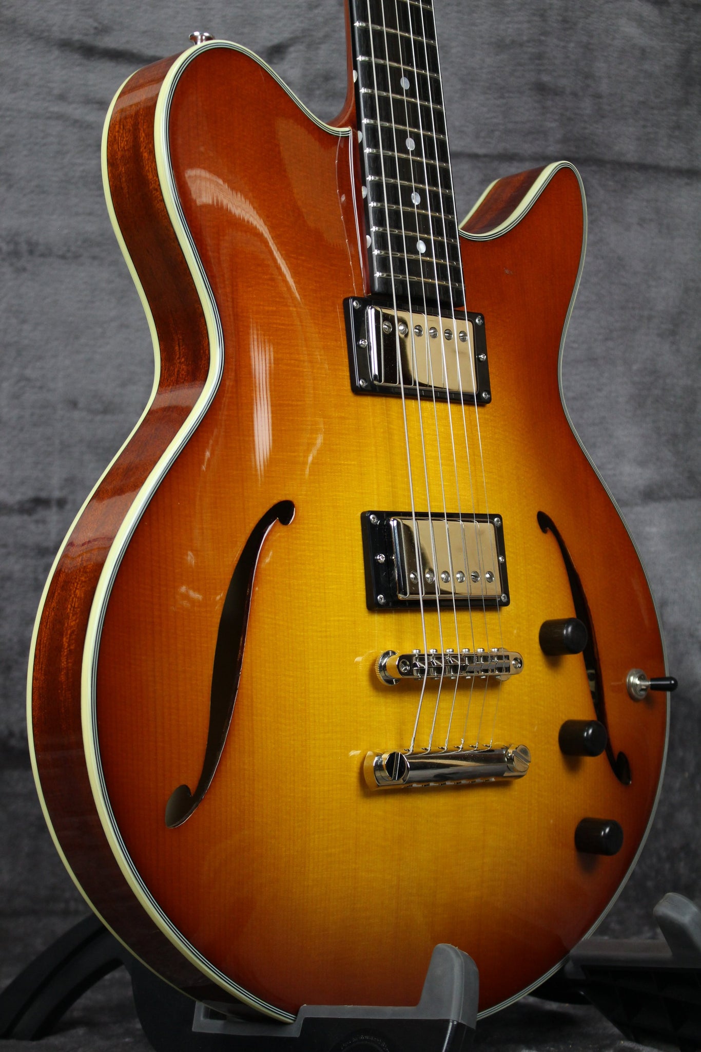 Body: Vintage sunburst, thinline archtop, the top is solid spruce and back and sides are mahogany laminate, gloss finish, cream and black binding on the top/back, dimensions are 14.75” x 1.75”.