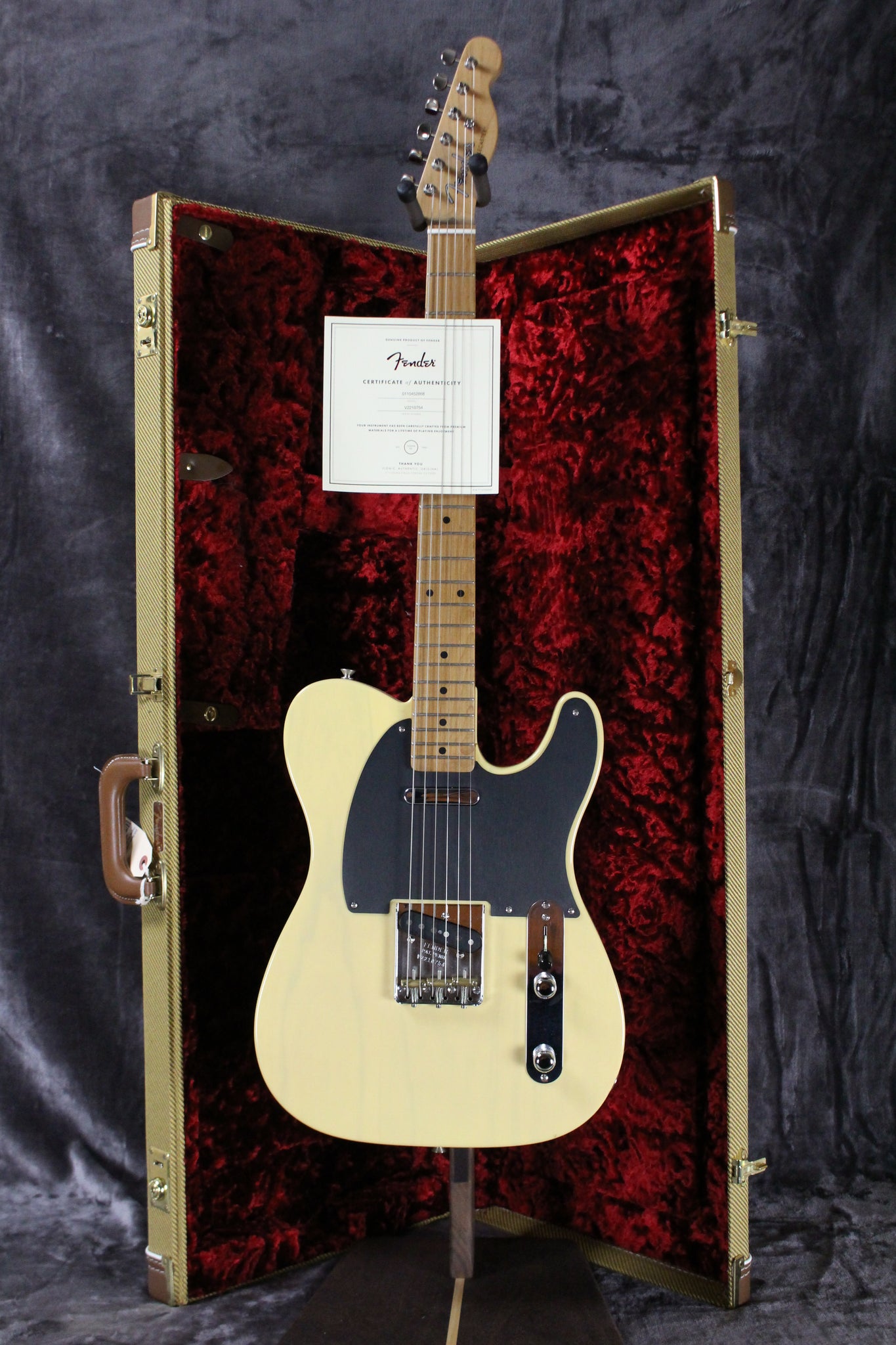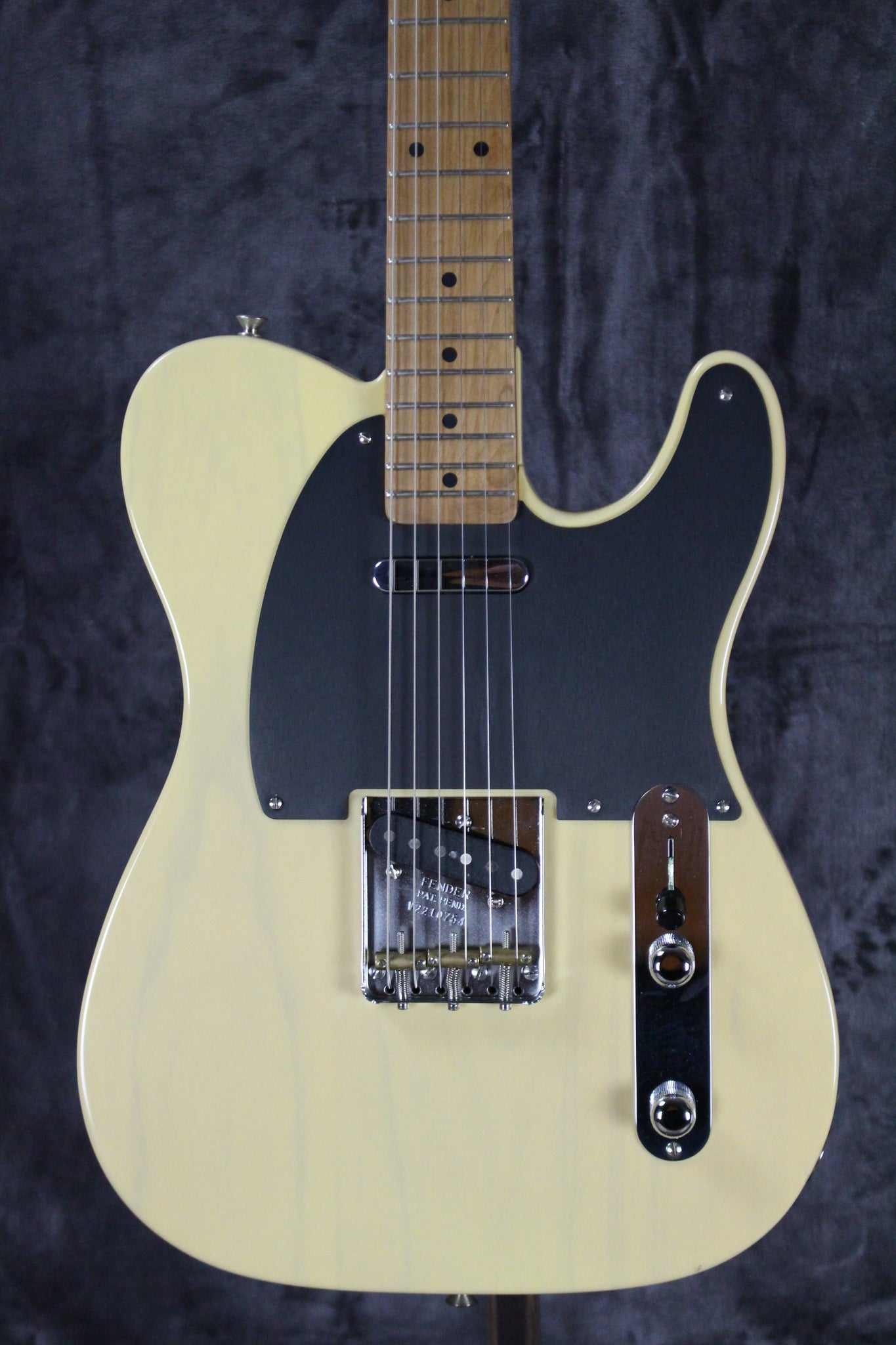 Pickups/Hardware: Fender Pure Vintage ‘52 single coil pickups, Fender Deluxe tuning keys, 3-saddle American Vintage strings-through-body Tele bridge with brass saddles, knurled chrome knobs, bone nut.
