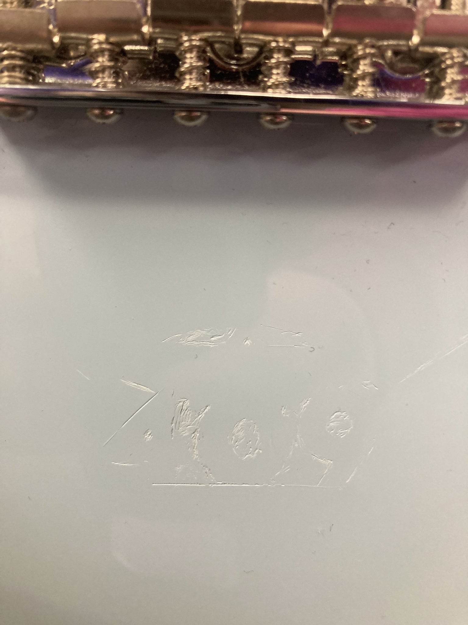 Cosmetics: This guitar has regular pick wear on the pickguard. There are small pieces of plastic sticking out underneath the control knobs from the protective plastic that was on the pickguard. There is something (the numbers 409) carved into the finish on the top of the body near the tremolo system (See Photos Please). The fingerboard edges have been rolled and the fret edges have been cleaned up. You can see where the edges have been sanded down a little from the fret rolling. This has made it very comfortable to play. The back of the neck is smooth and in great shape. The frets are in great shape and still have a ton of life.