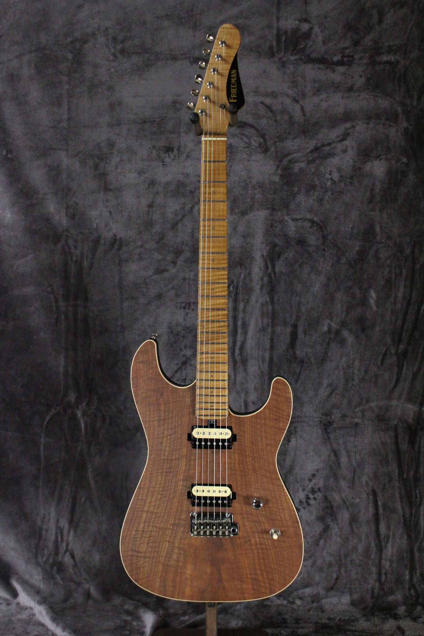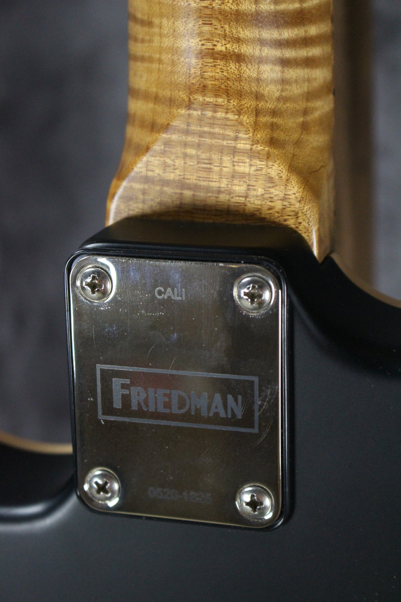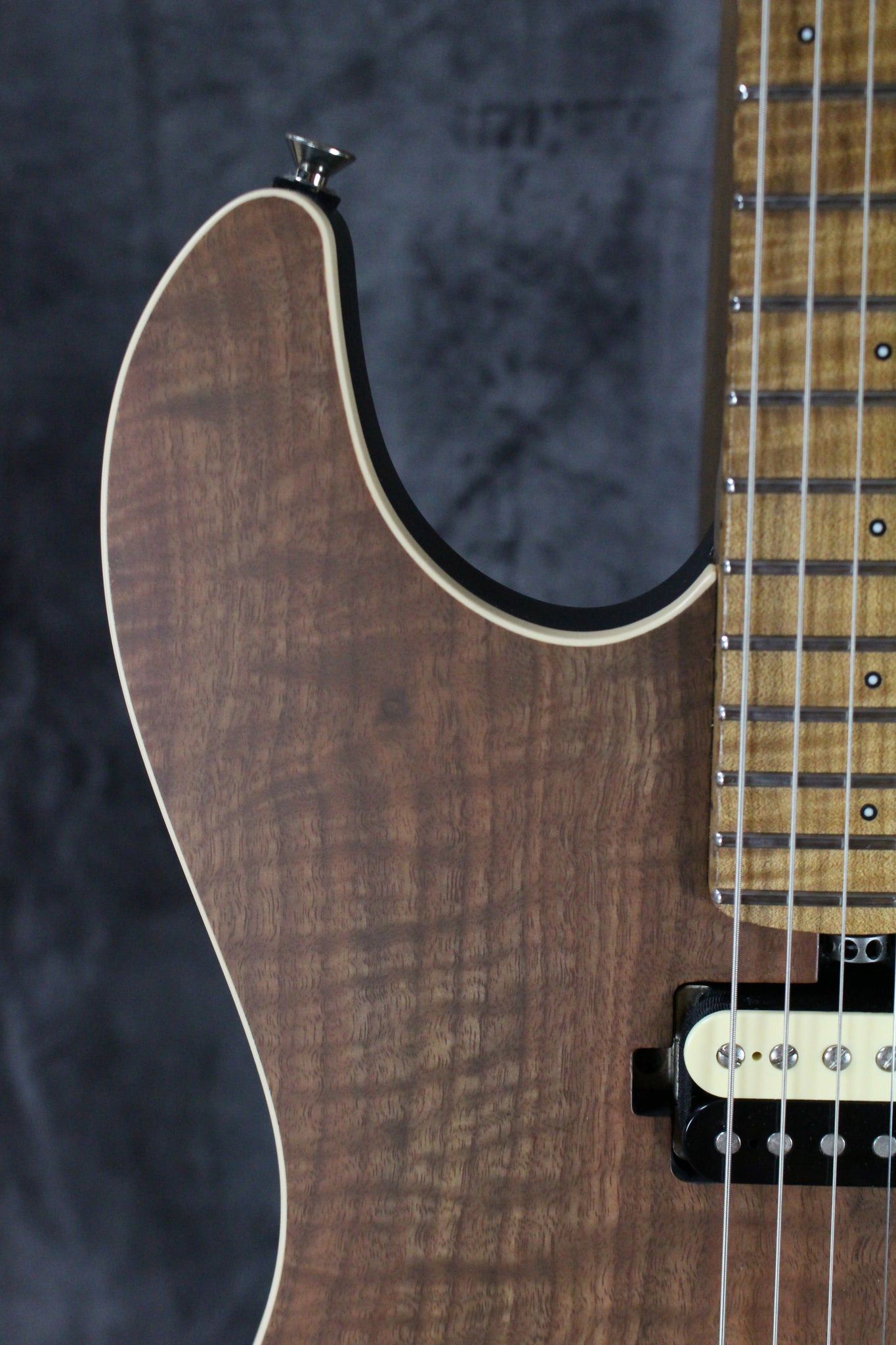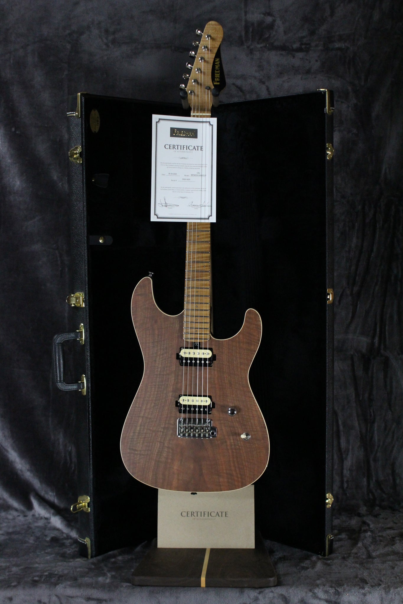 This 2020 Friedman Cali features a splendid 4A Figured Walnut top and a gorgeous roasted flamed Maple neck. It has a fat bass response, snarling midrange, and sizzling high-end. The flatter radius is what really makes this guitar fit for speed and it's easier to play a thousand notes a second if you only have to worry about one volume knob and one three-way switch.