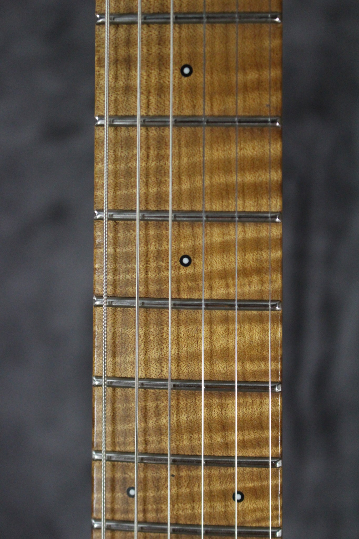 Neck: Roasted Flame Maple with a Maple fingerboard, 25.5” scale length, 1.625” nut width, 14” radius, bullseye dot inlays, 22 frets.