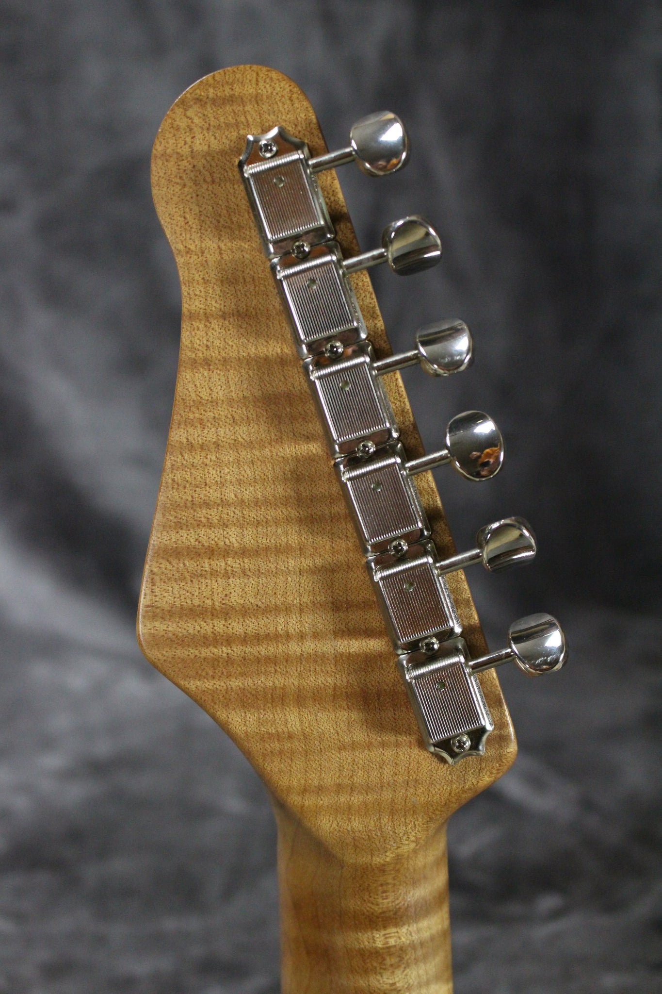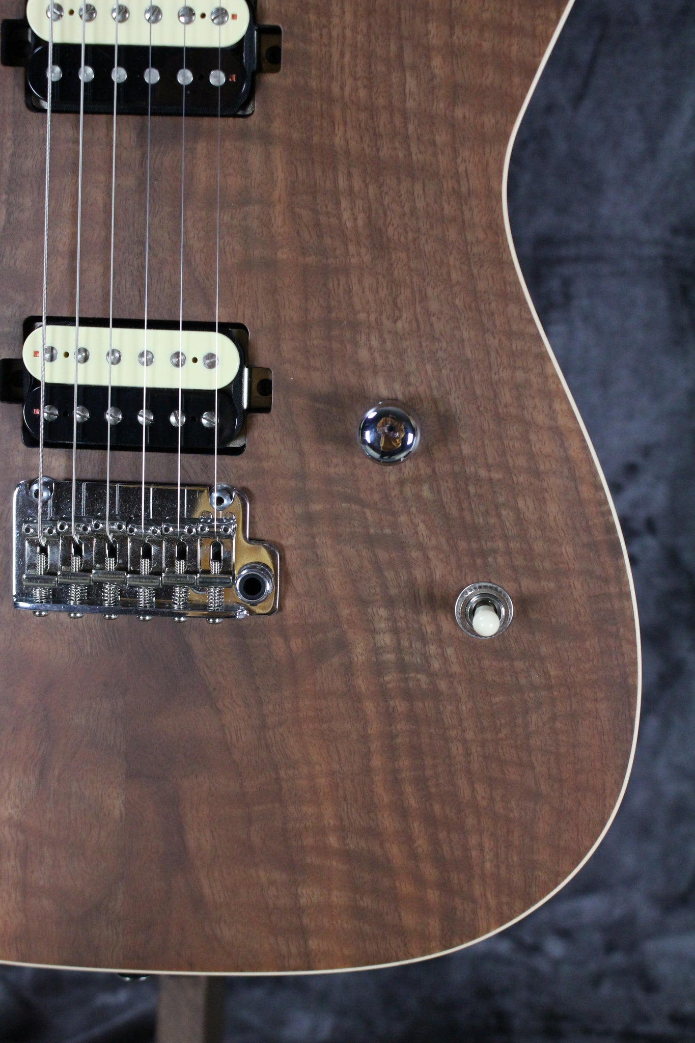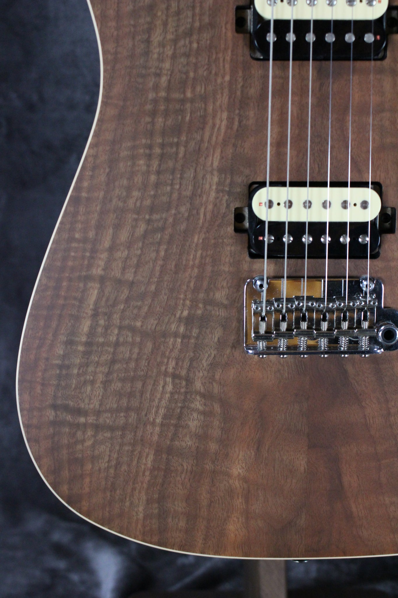 Body: Basswood with a 4A figured Walnut top, satin nitrocellulose finish, creme binding.