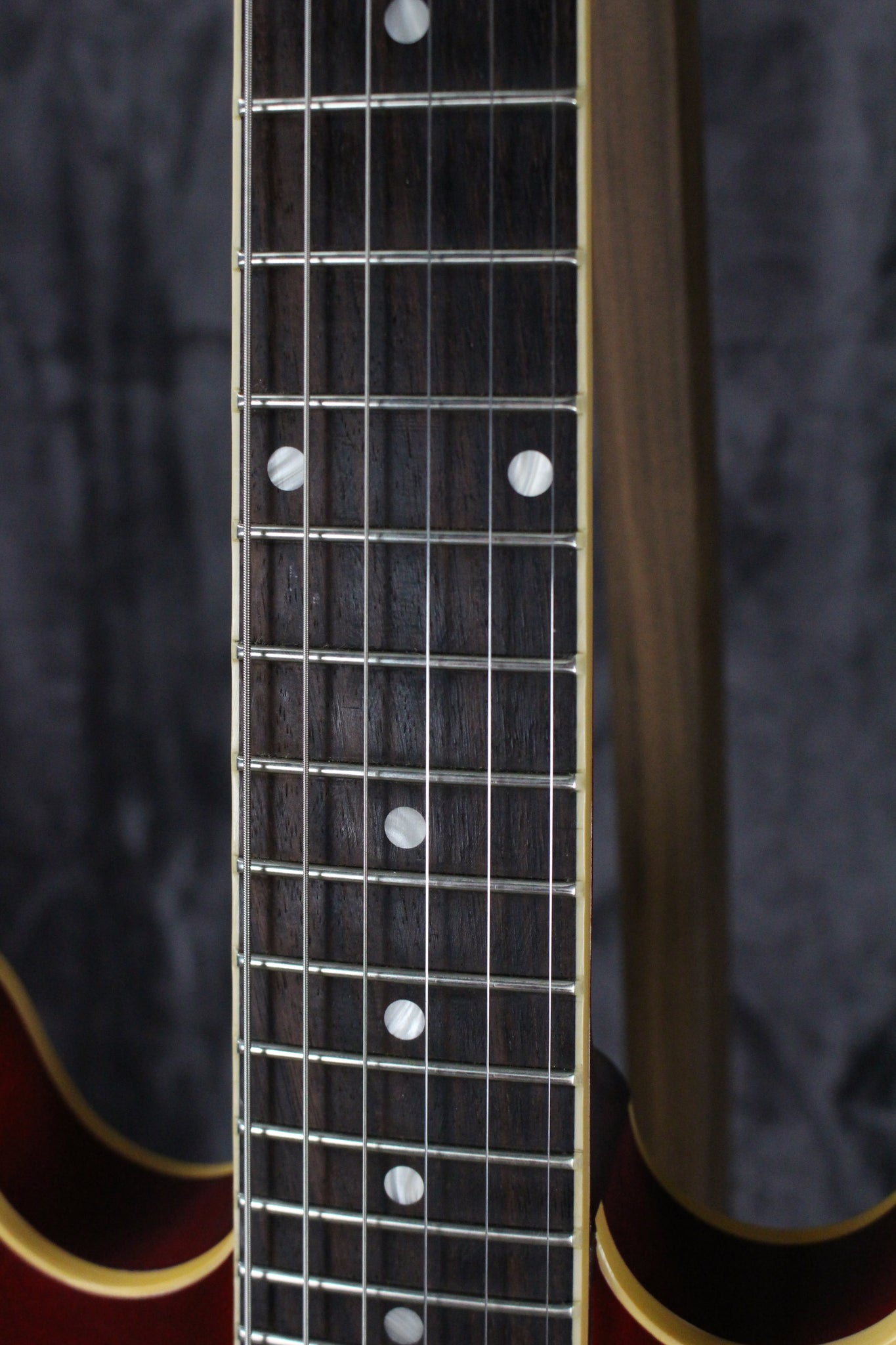 Neck: Mahogany with a bound Rosewood fingerboard, 24.75” scale length, 1.69” nut width, 22 frets, pearl dot inlays.