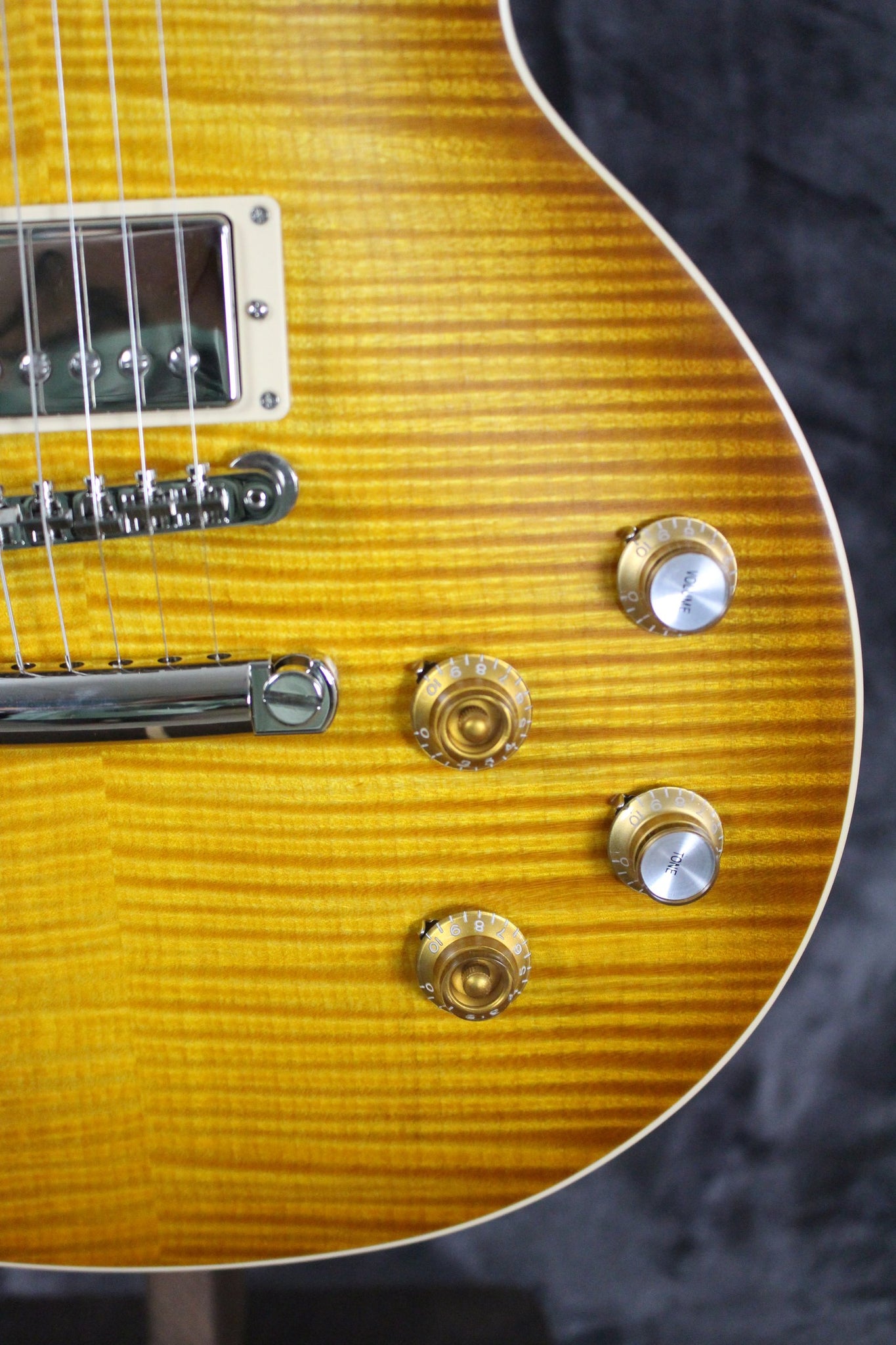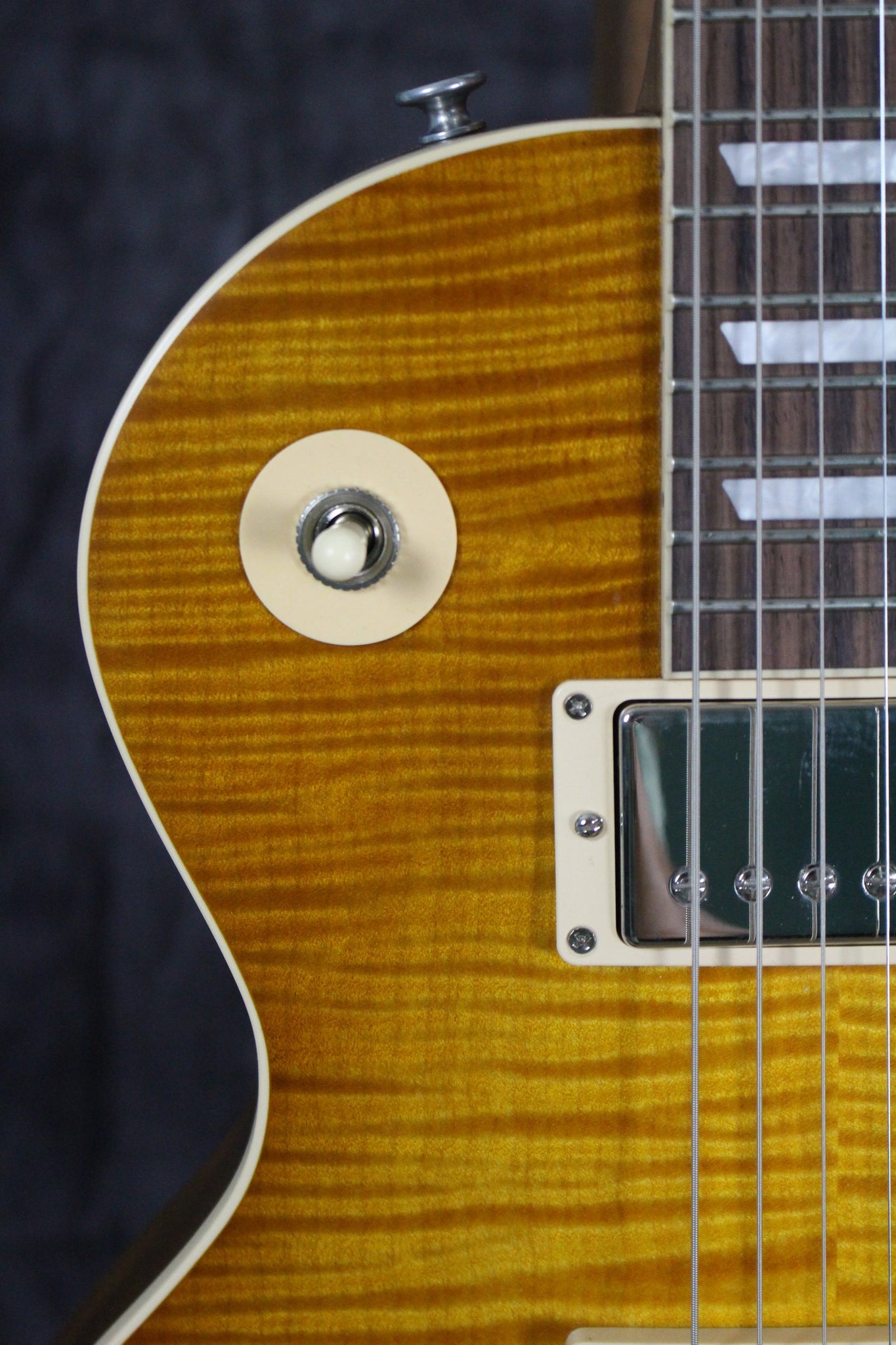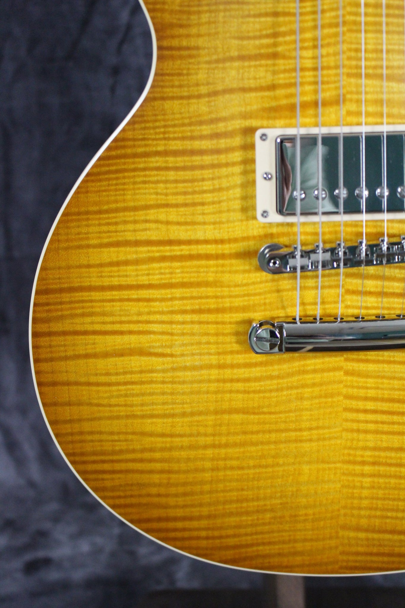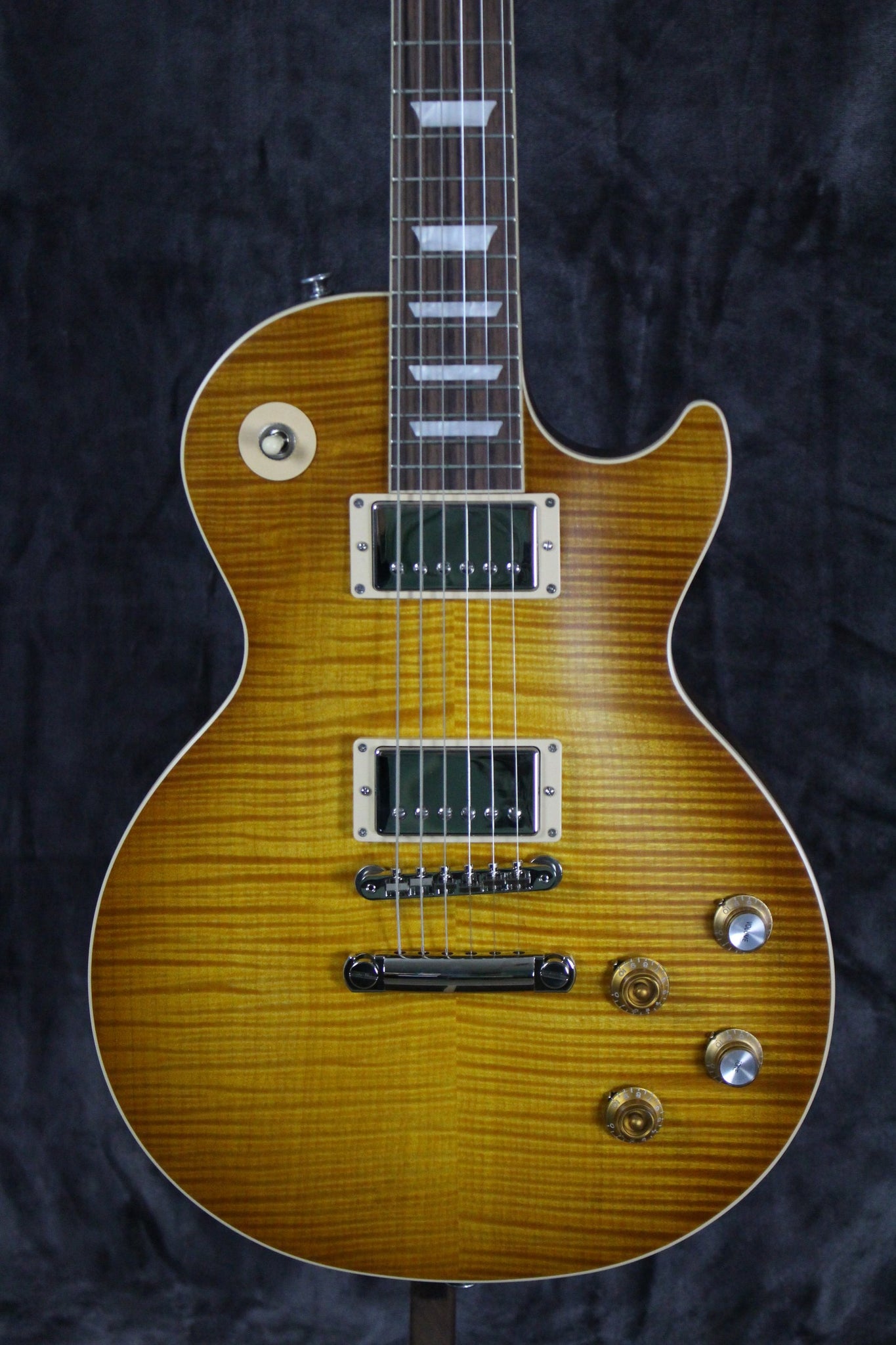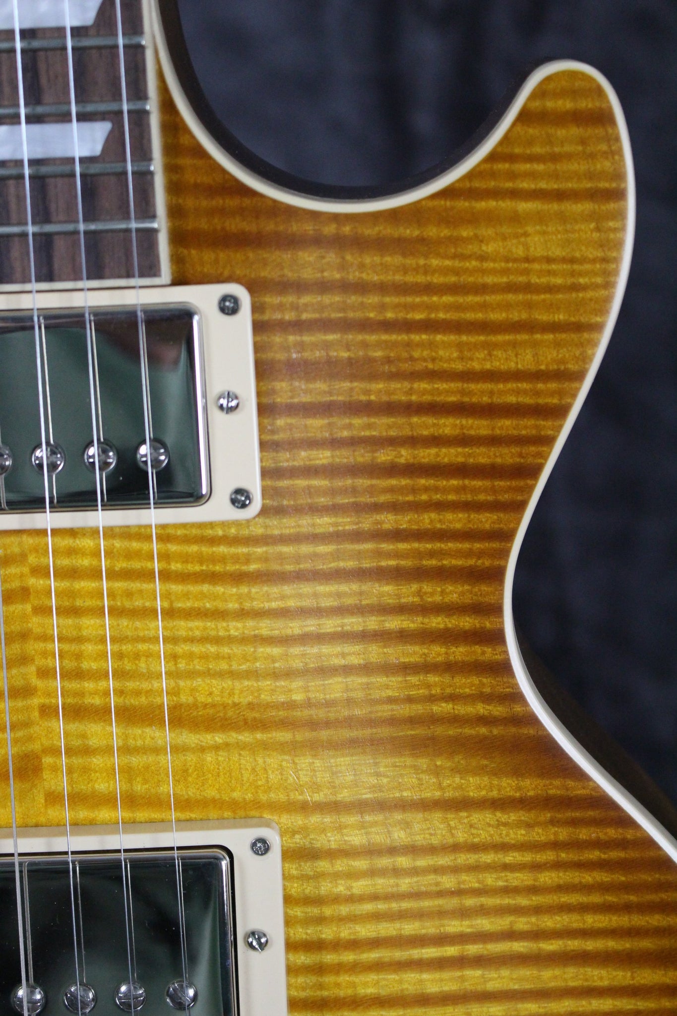 Top: Carved AAA flame maple top with “Greeny burst” satin nitrocellulose finish