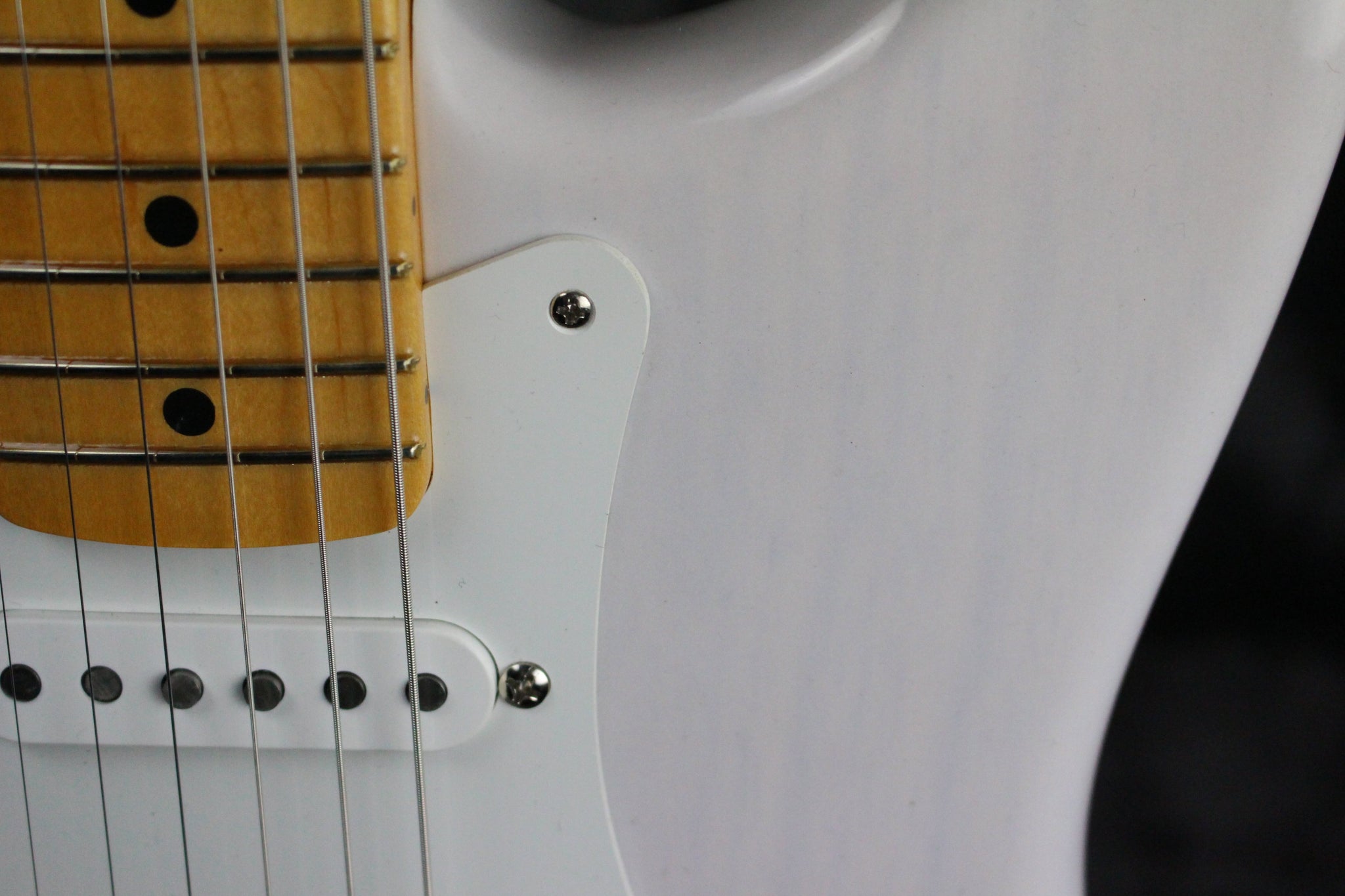 Pickups/Hardware: Three Pure Vintage ’59 single coil pickups, master volume/two tone controls/5-way pickup selector, vintage style tuning keys, Pure Vintage Synchronized Tremolo with Bent Steel Saddles, 1-ply eggshell pickguard.