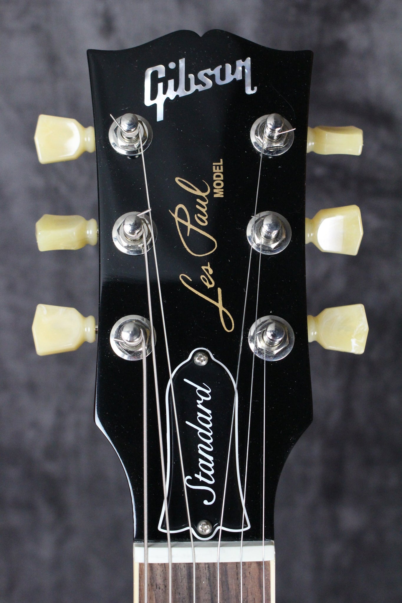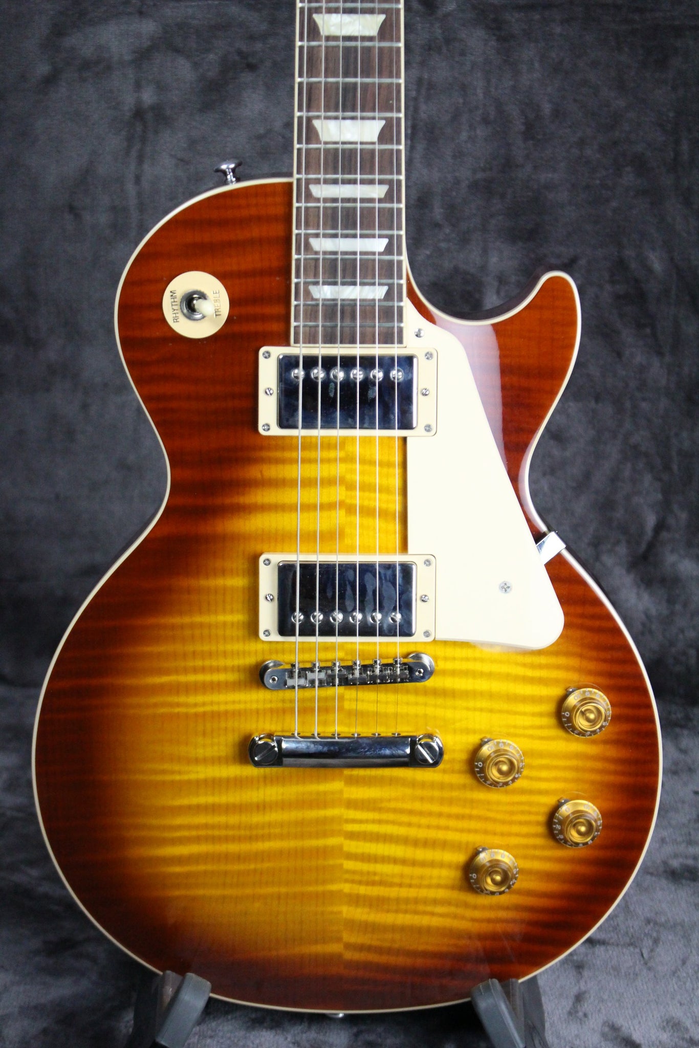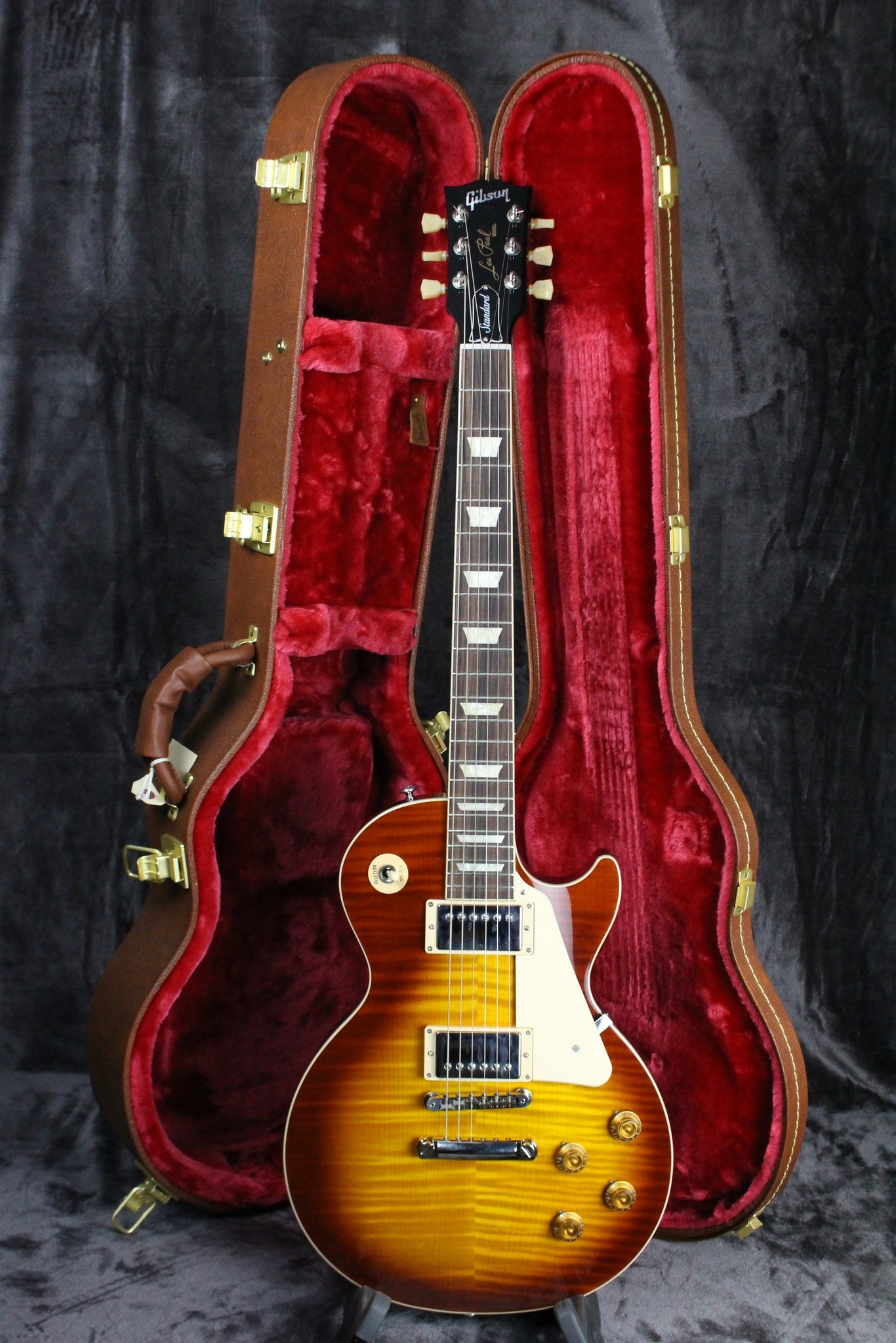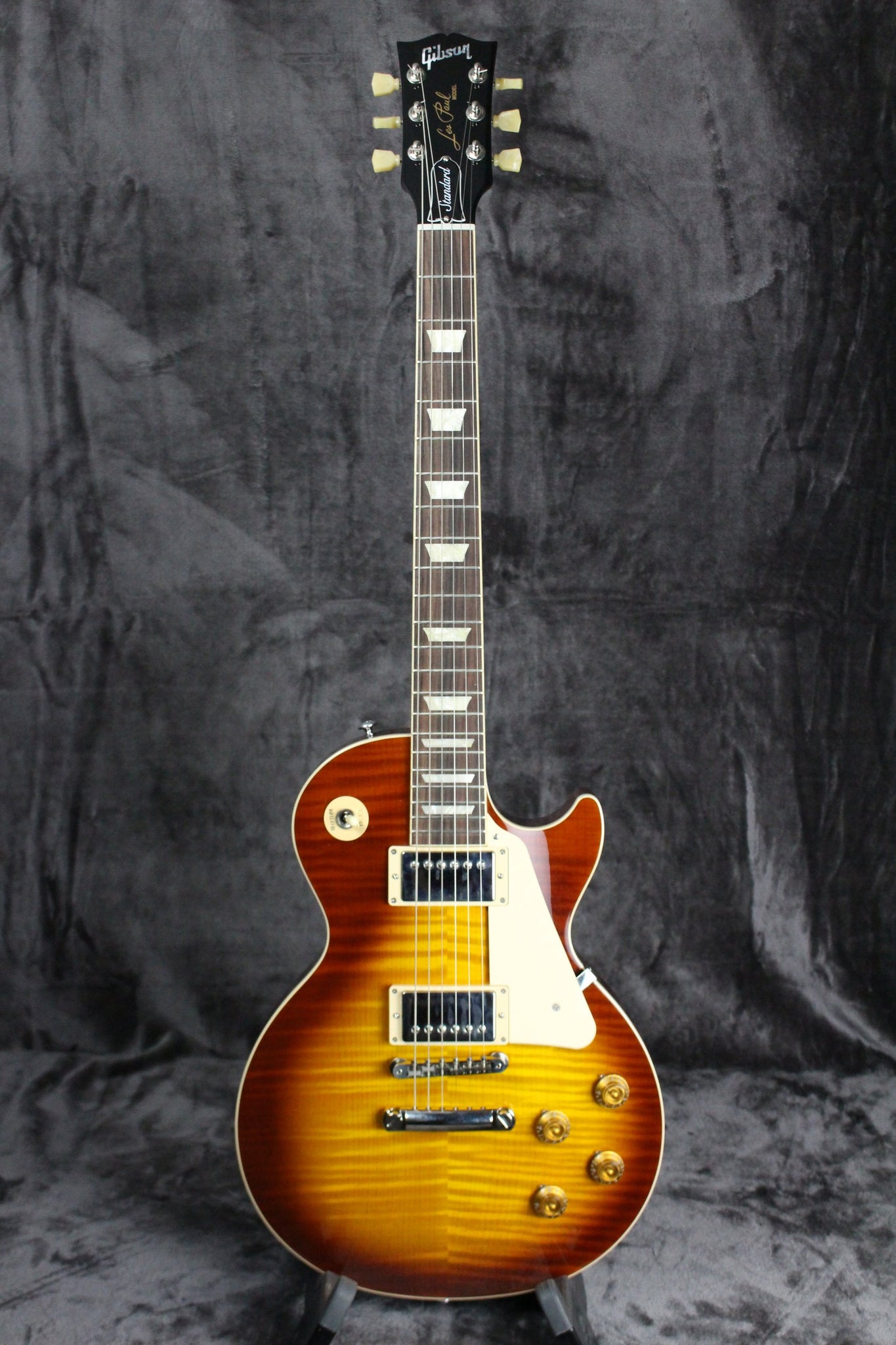 Summary: The new Les Paul Standard returns to the classic design that made it relevant, played and loved -- shaping sound across generations and genres of music. It pays tribute to Gibson's Golden Era of innovation and brings authenticity back to life. The Les Paul Standard 50's has a solid mahogany body with a maple top, a rounded 50's-style mahogany neck with a rosewood fingerboard and trapezoid inlays. It's equipped with an ABR-1, the classic-style Tune-O-Matic bridge, aluminum stop bar tailpiece, vintage deluxe tuners with keystone buttons, and aged gold tophat knobs. The calibrated Burstbucker 1 (neck) and Burstbucker 2 (bridge) pickups are loaded with AlNiCo II magnets, audio taper potentiometers and orange drop capacitors.