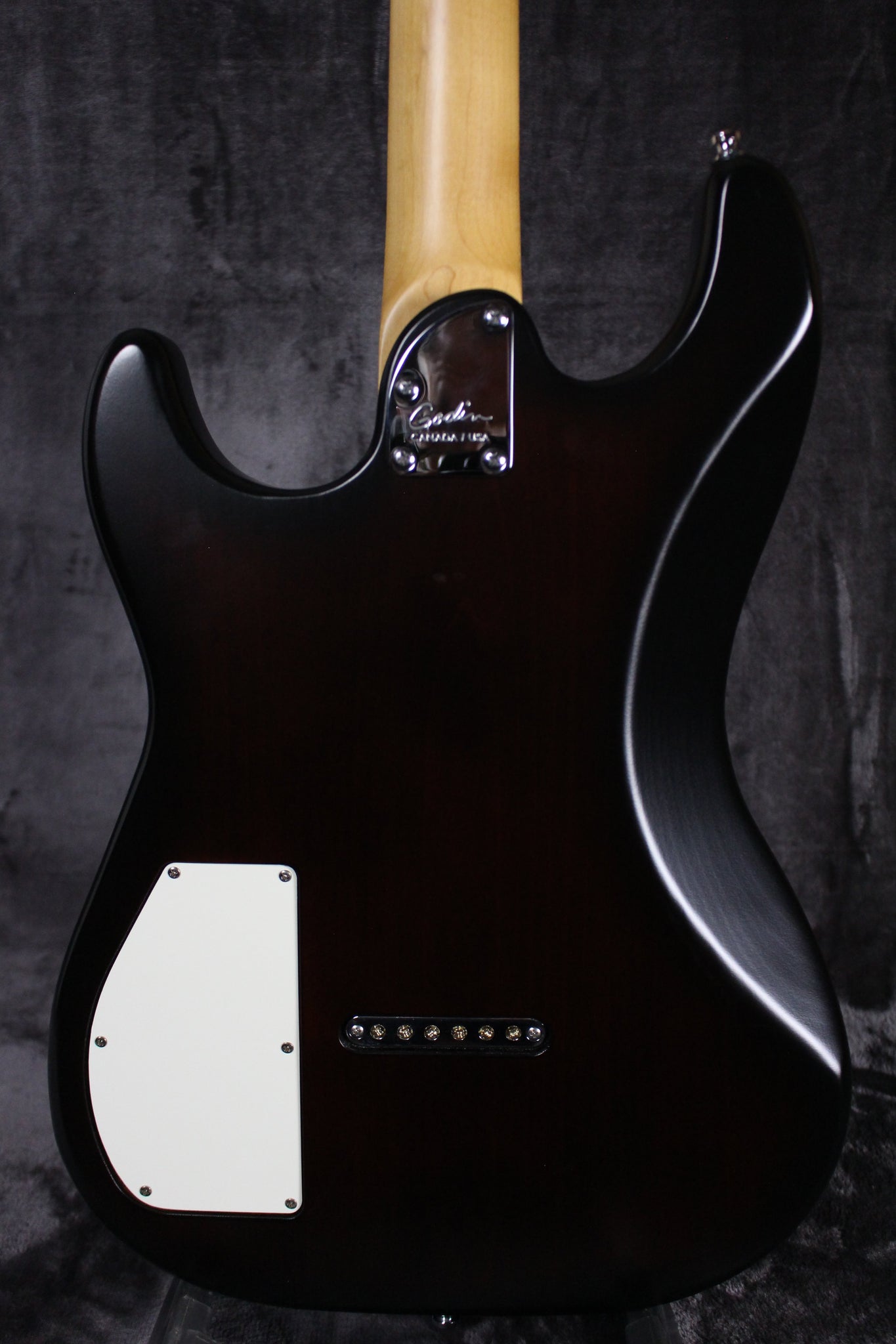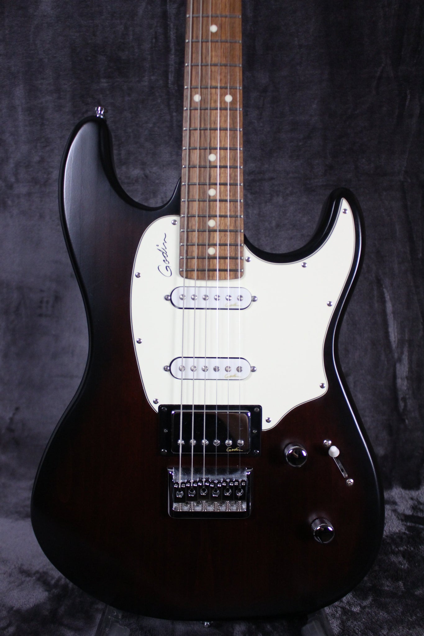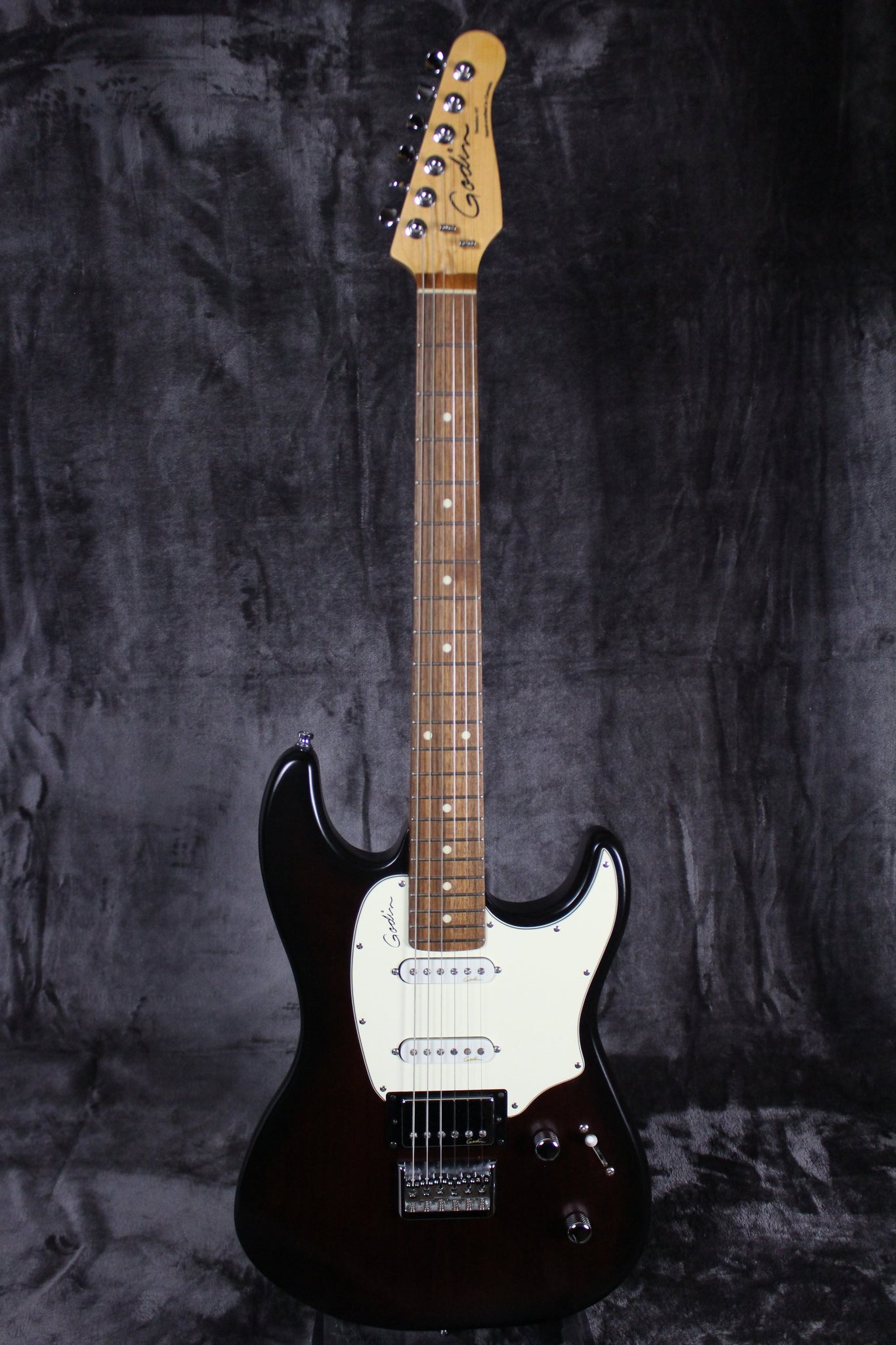 Pickups/Hardware: Godin custom humbucker, GS-1 single coil pickups, push/pull tone, volume, 5 way switch, hardtail bridge, chrome knobs,
