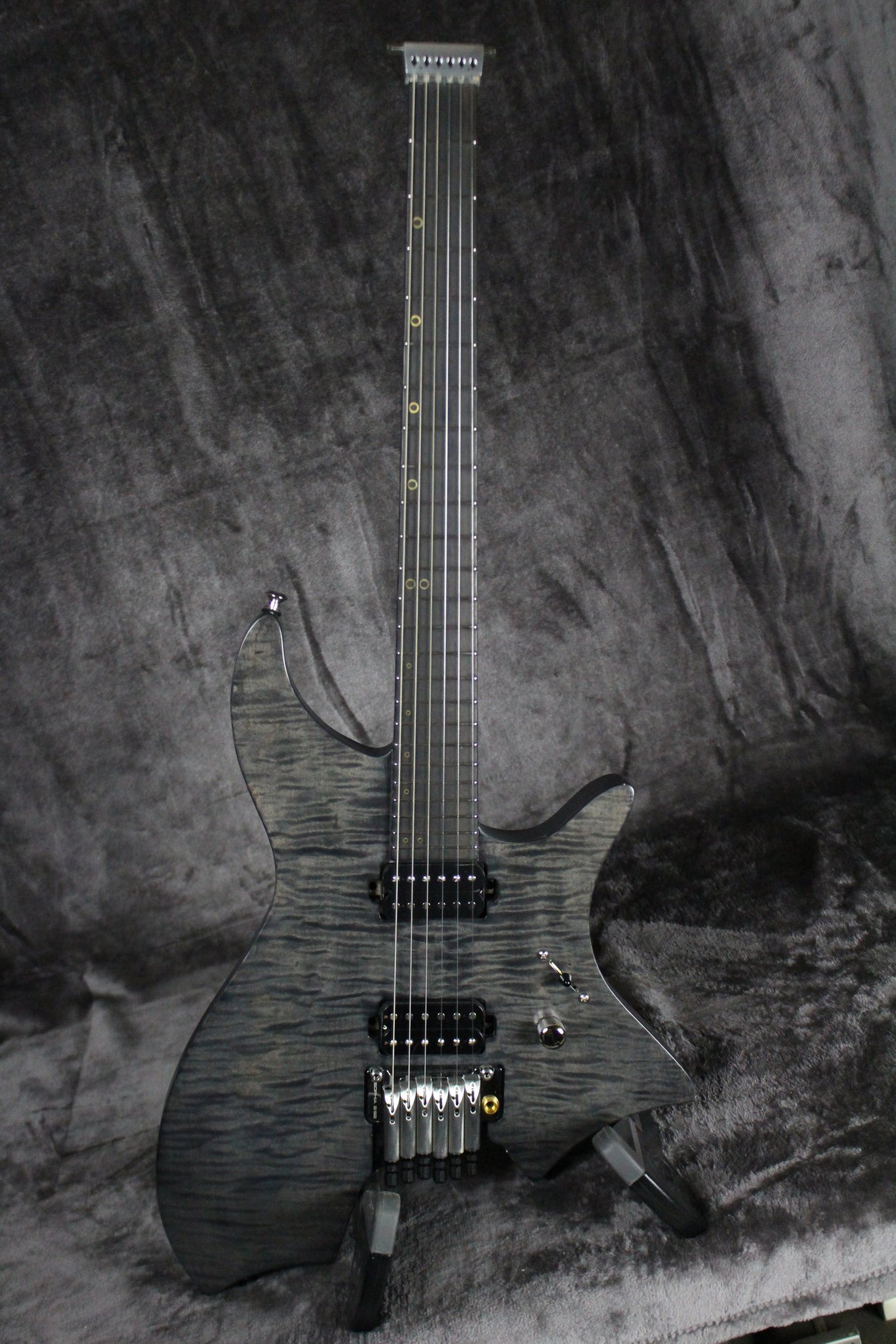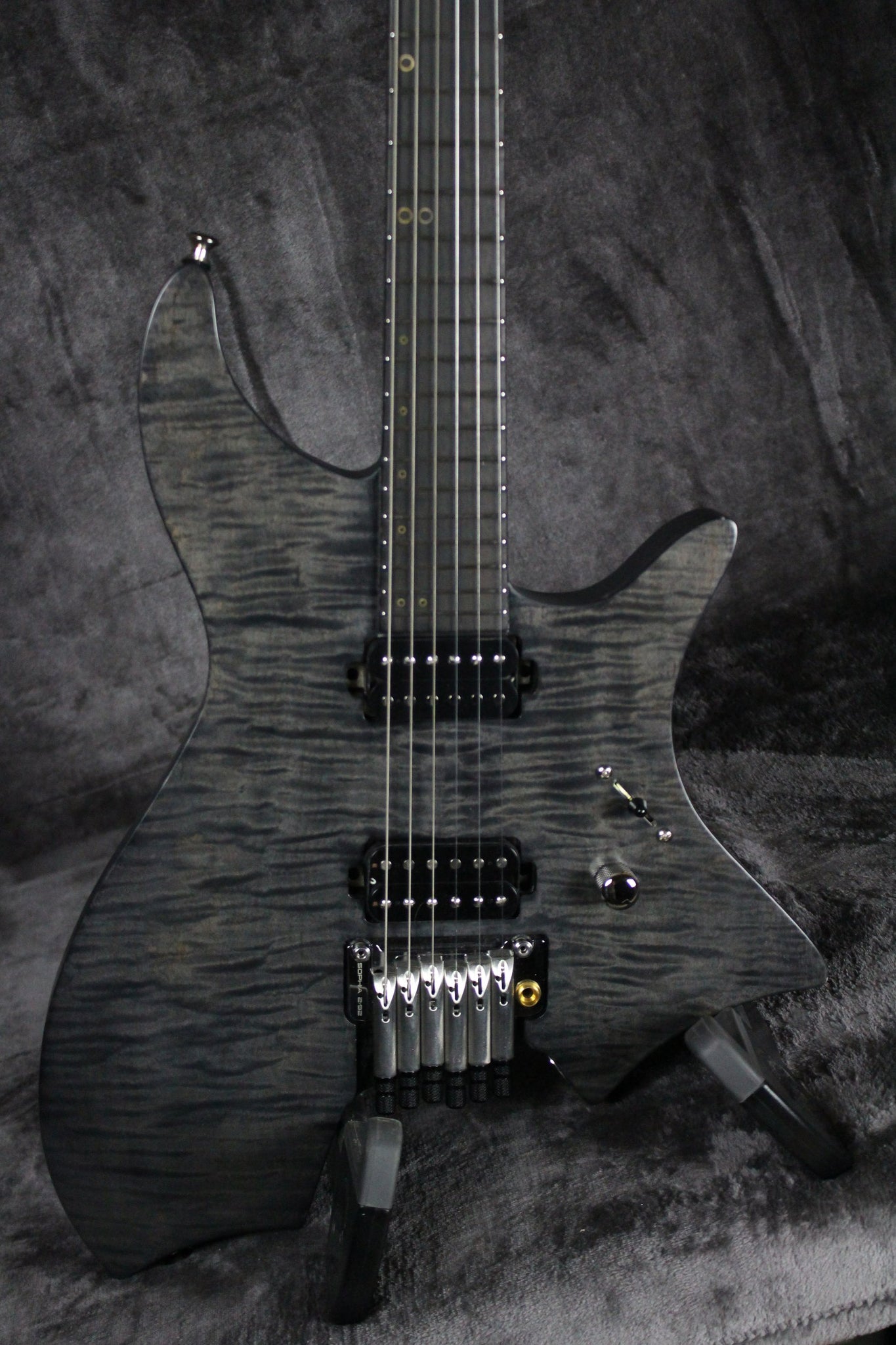 Body: Mahogany with an Eastern flame Maple top, hollow body with no hole, black Charcoal satin finish.
