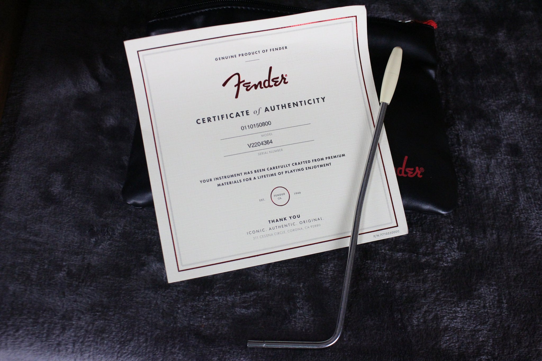 Pickups/Hardware: Pure Vintage '65 single-coil Jazzmaster pickups, Pure Vintage single line Fender Deluxe tuning keys, vintage-style floating tremolo with tremolo lock button and push-in tremolo arm, replacement Mastery bridge, chrome knobs, bone nut.