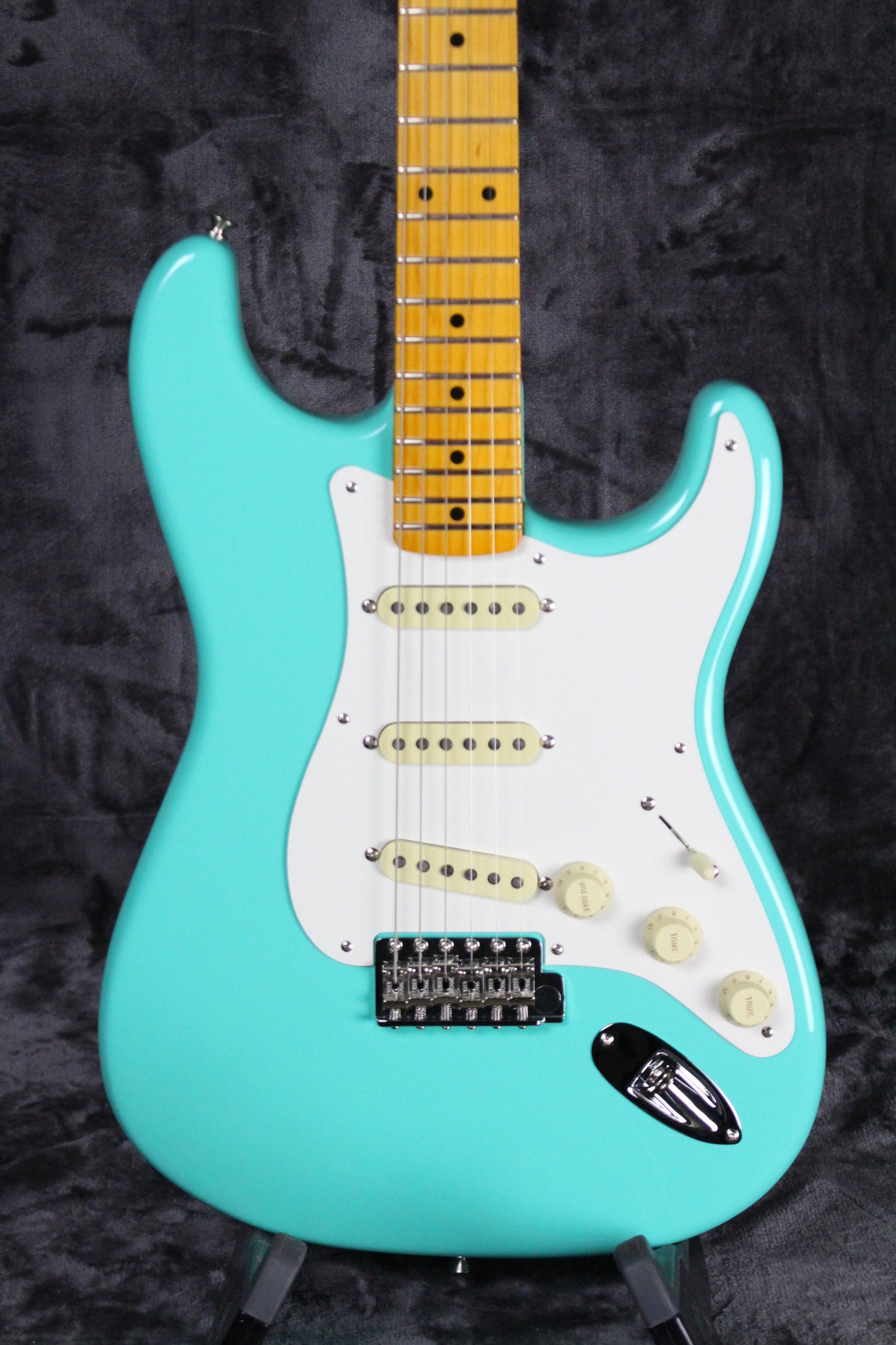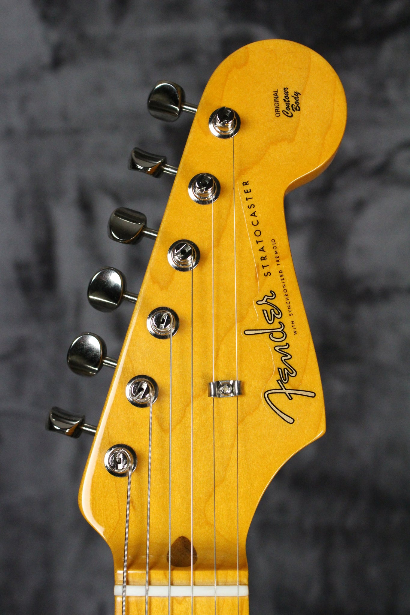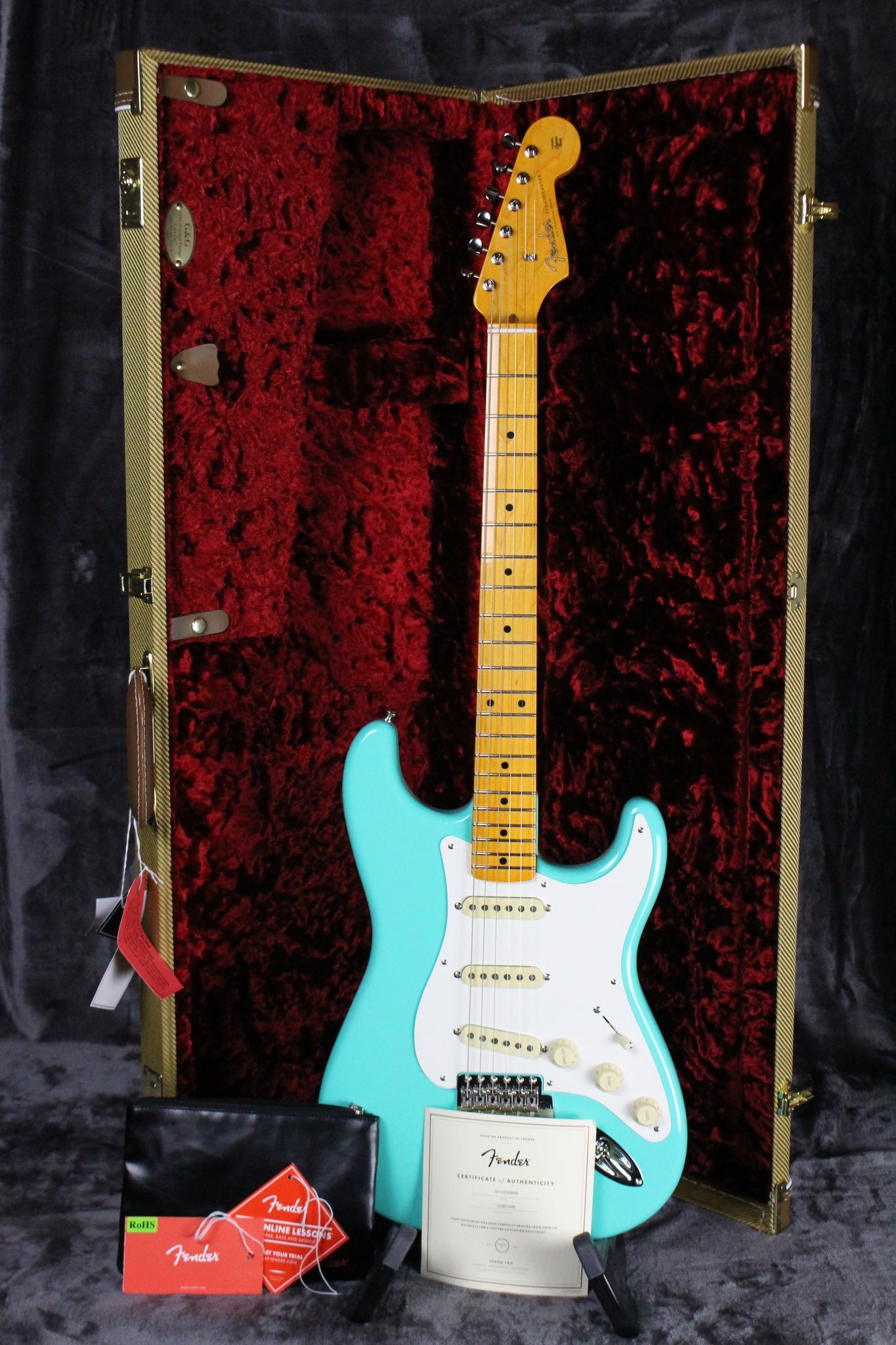 Pickups/Hardware: Three Pure Vintage ’57 Stratocaster single coil pickups, vintage tall frets, single ply pickguard, vintage style tuning keys, bone nut, master volume/2x tone controls/5-way pickup selector.