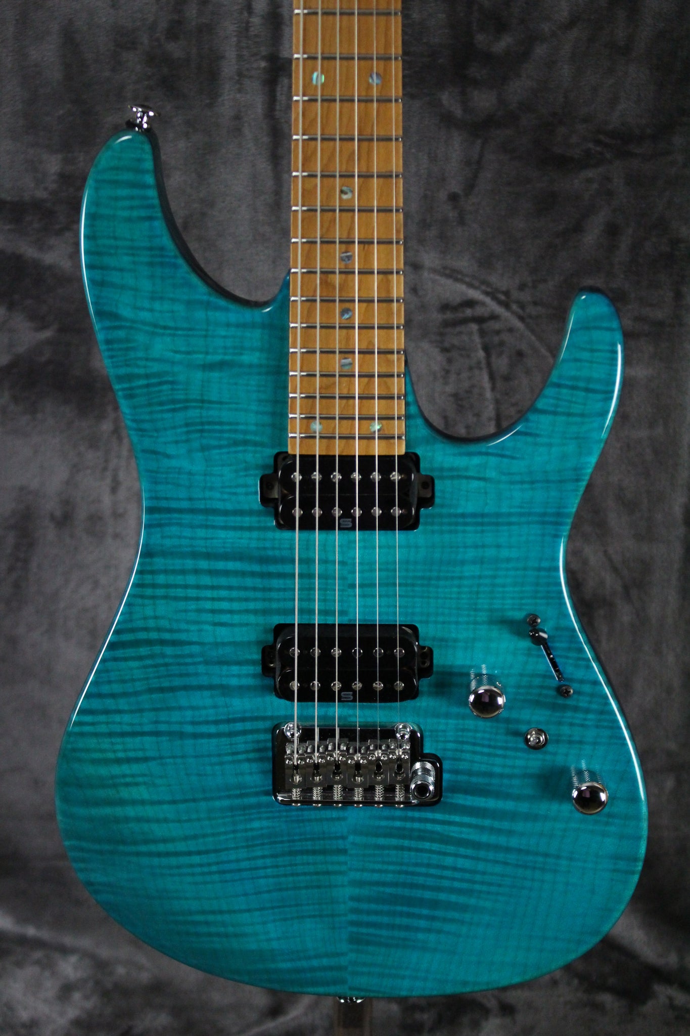 Body: Flamed Maple top, African Mahogany body in Aqua Blue gloss finish.
