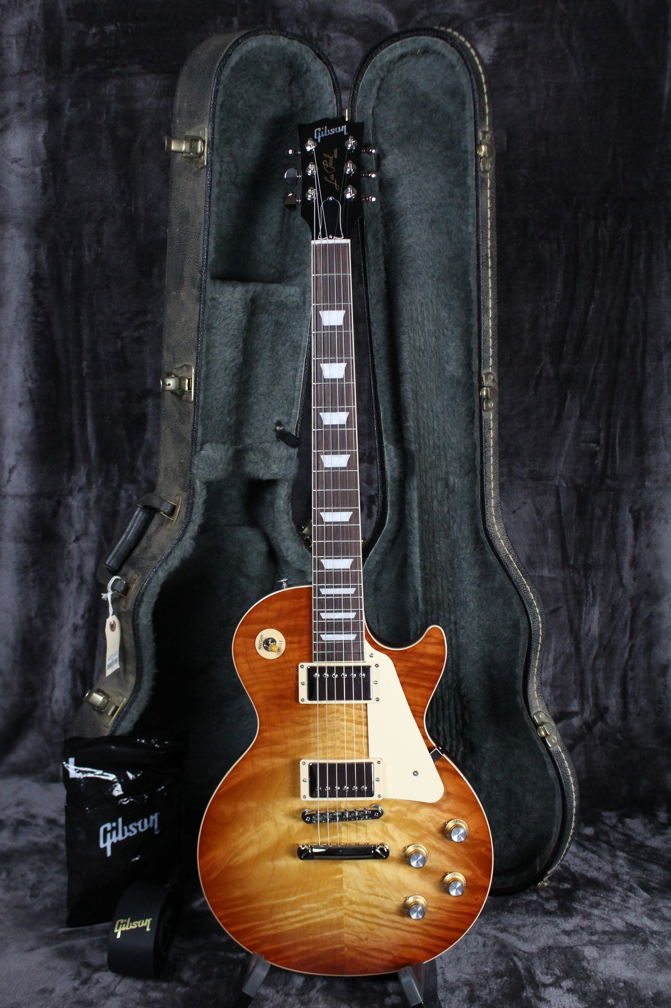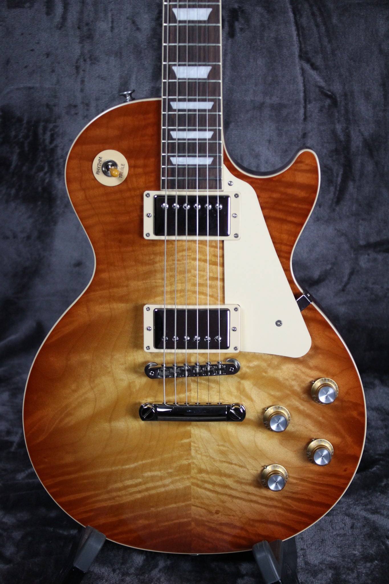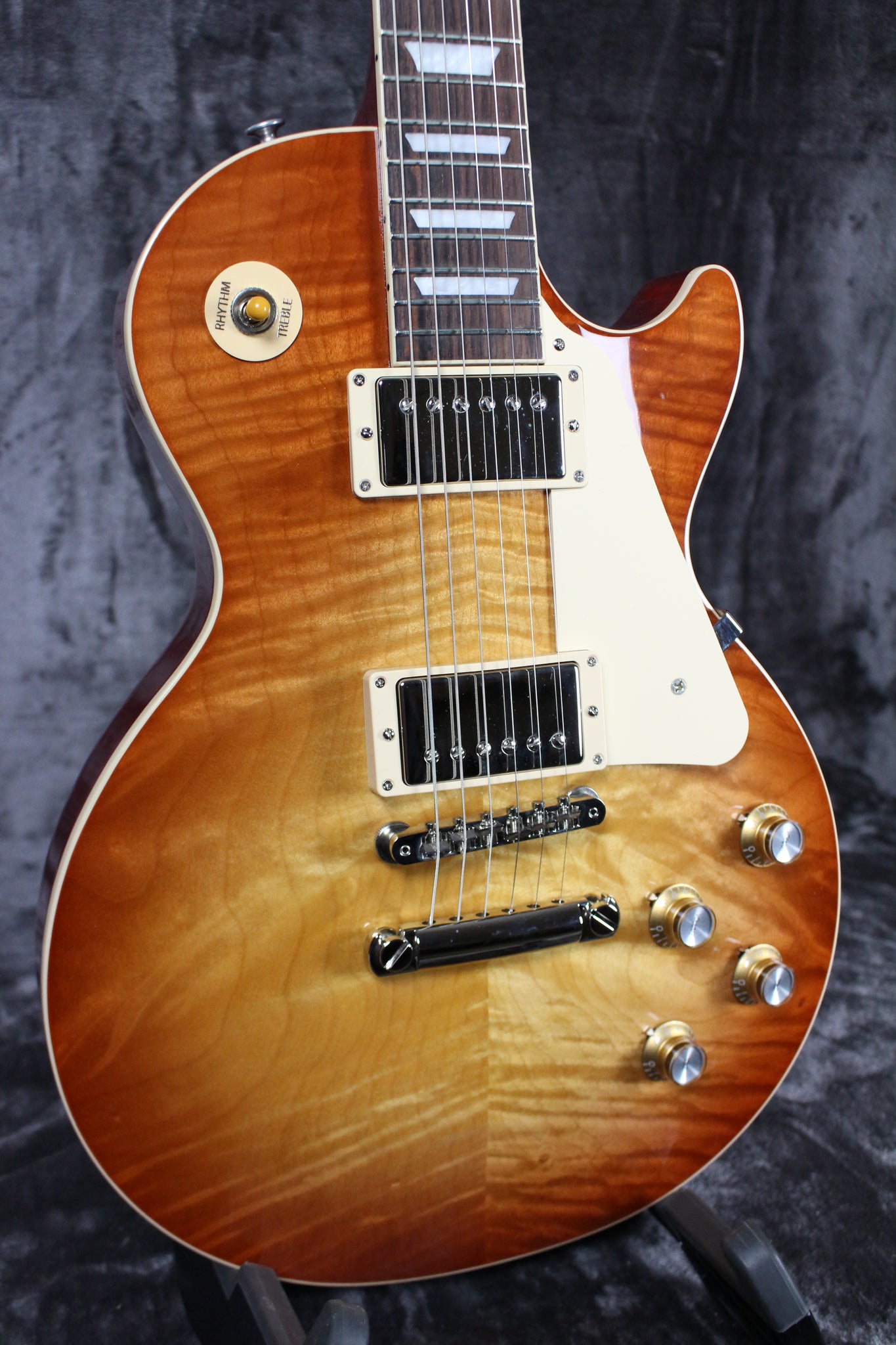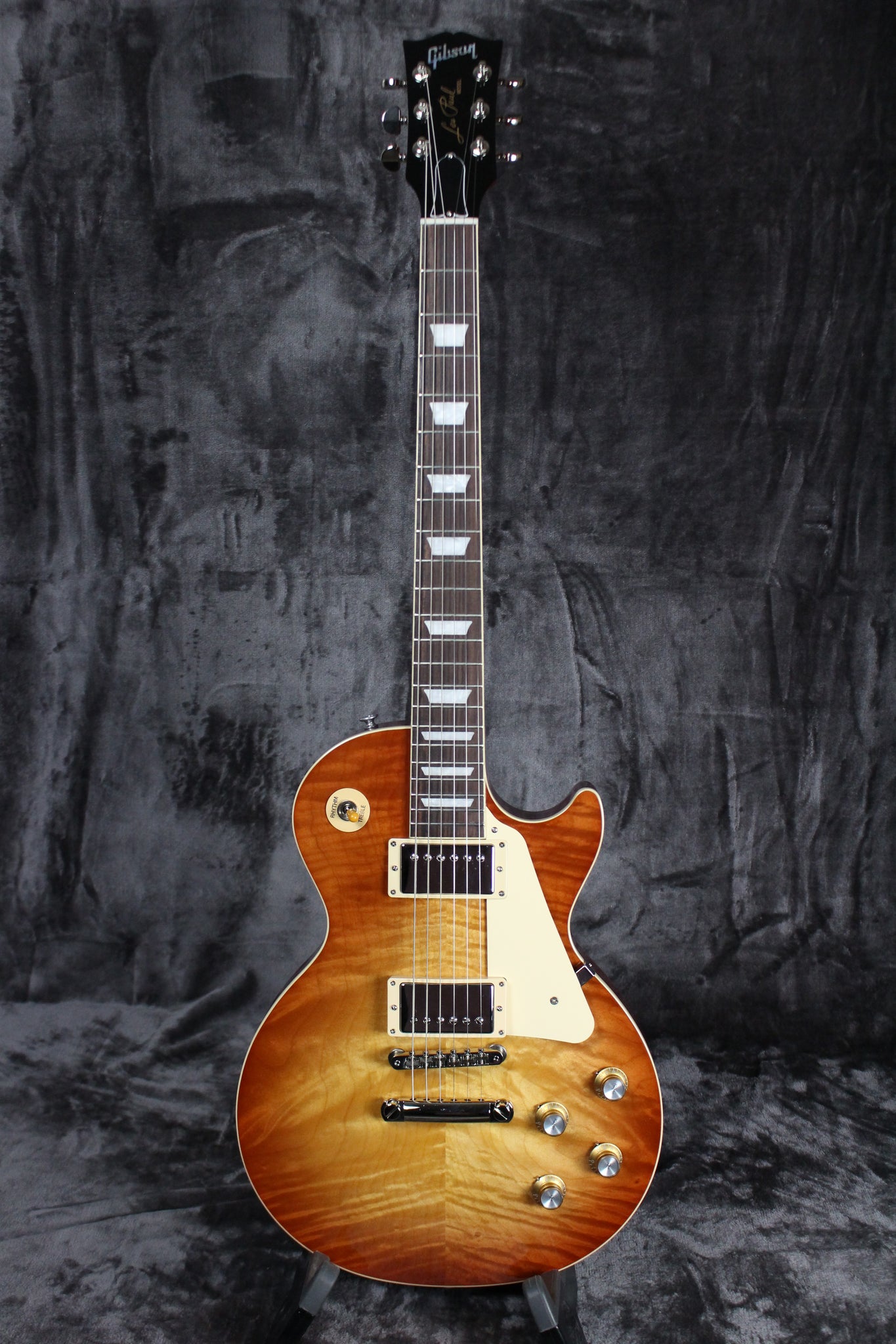 Summary: The new Les Paul Standard returns to the classic design that made it relevant, played, and loved – shaping sound across generations and genres of music. It pays tribute to Gibson's Golden Era of innovation and brings authenticity back to life. The Les Paul Standard '60s has a solid mahogany body with an AA figured maple top and a SlimTaper 60s-style mahogany neck with a rosewood fingerboard and trapezoid inlays. It's equipped with a classic ABR-1 Tune-O-Matic bridge, aluminum Stop Bar tailpiece, Grover Rotomatic "Kidney" tuners, and gold Top Hat knobs with silver reflectors. The 60s Burstbucker pickups are loaded with Alnico 5 magnets and wired to audio taper potentiometers and Orange Drop capacitors.