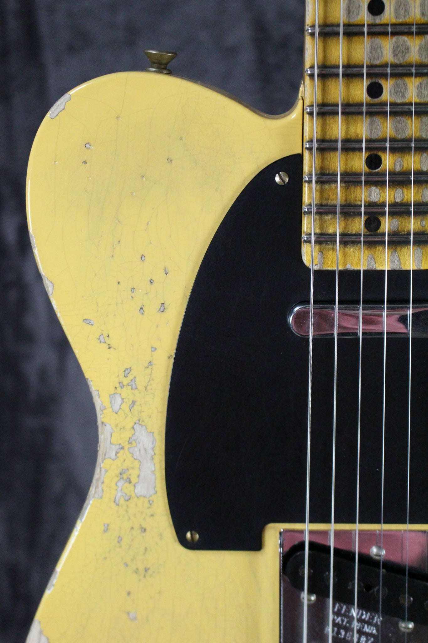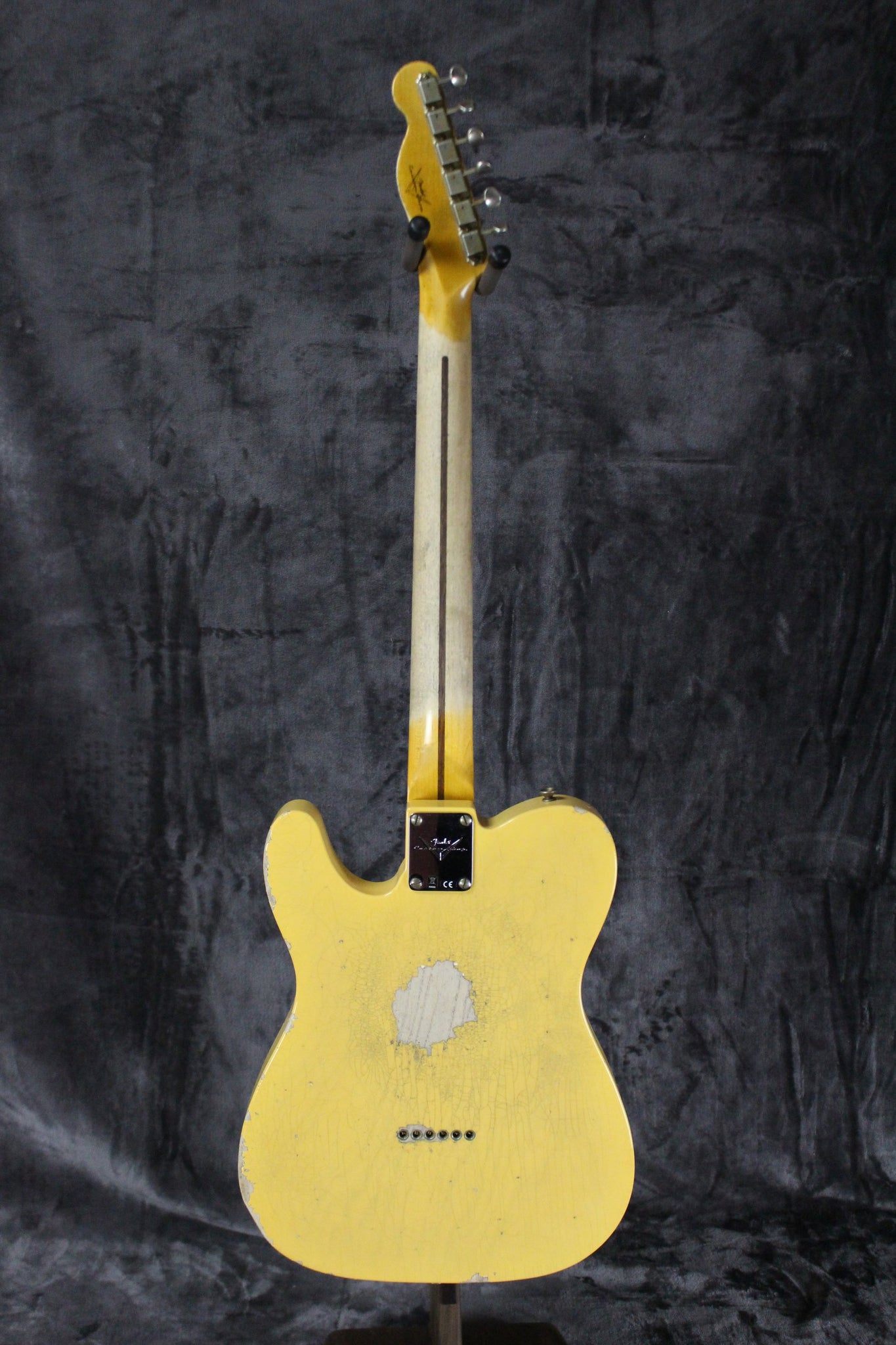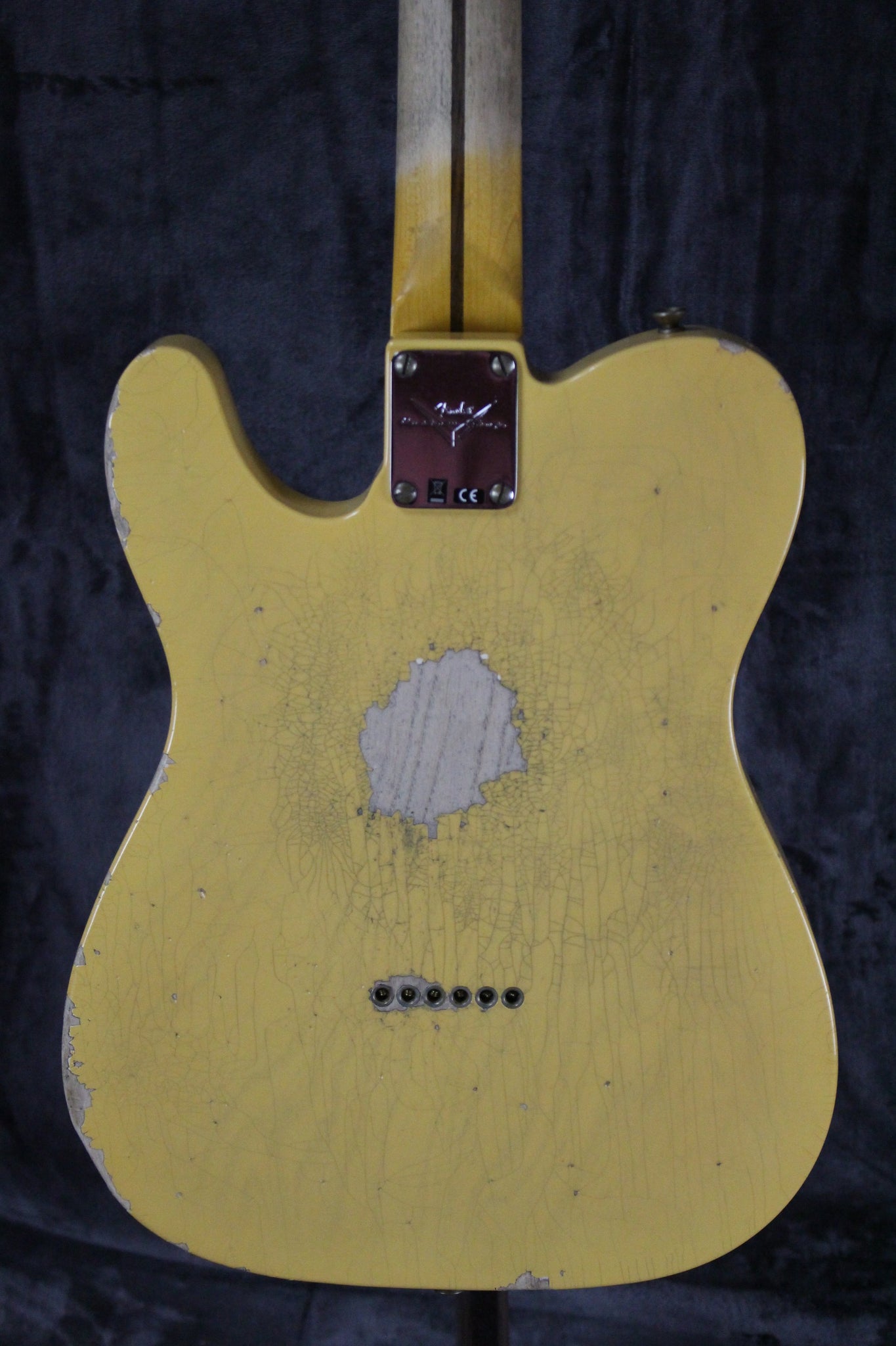 Cosmetics: This guitar is in great shape. It has light surface scratches on the body, along with dents scrapes, crazing, checking and wear comenserate with heavy relic’ing from the Fender Custom Shop. The back of the neck is clean, and the frets show minimal wear. Overall, this guitar plays very well and sounds fantastic.