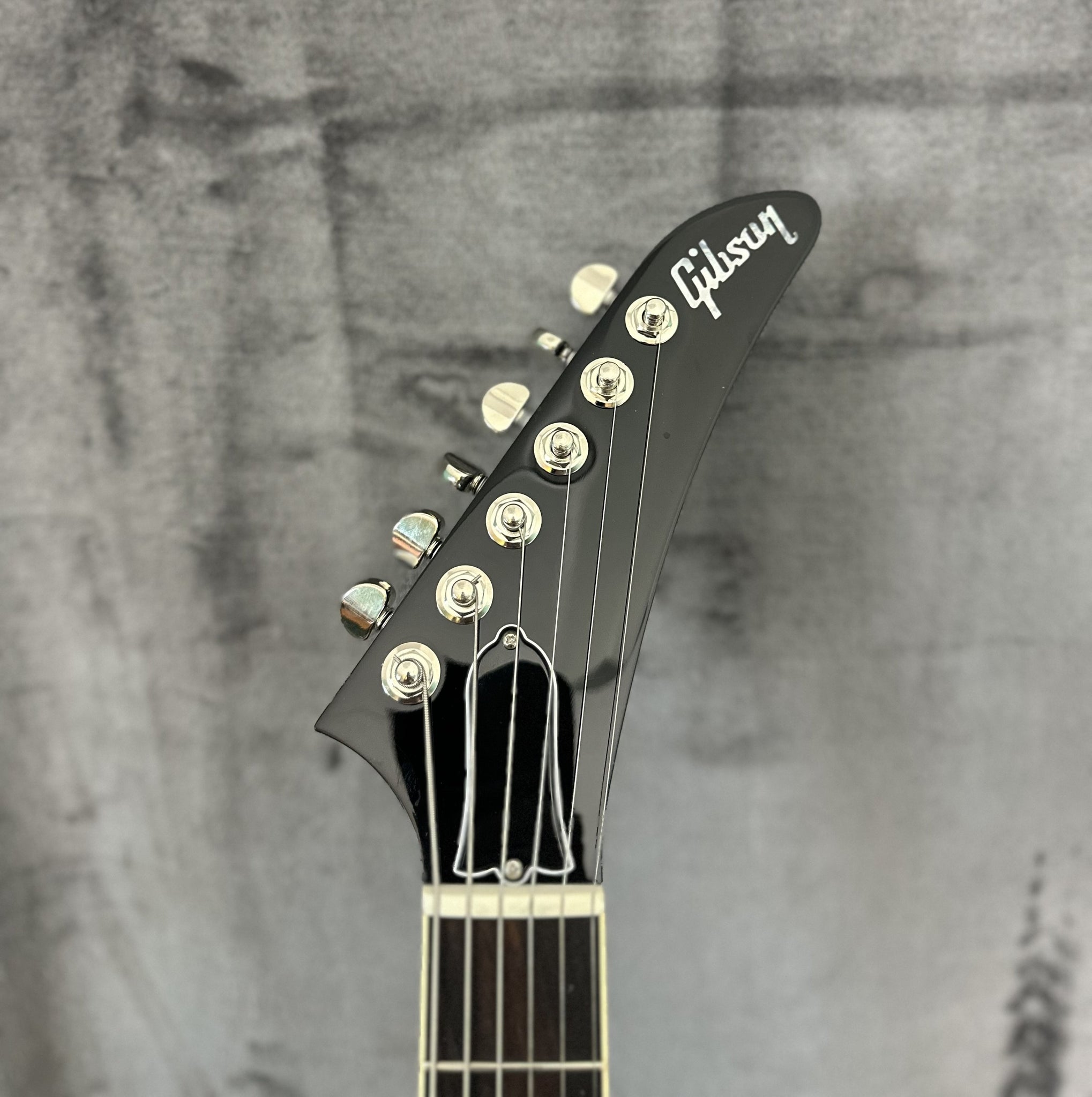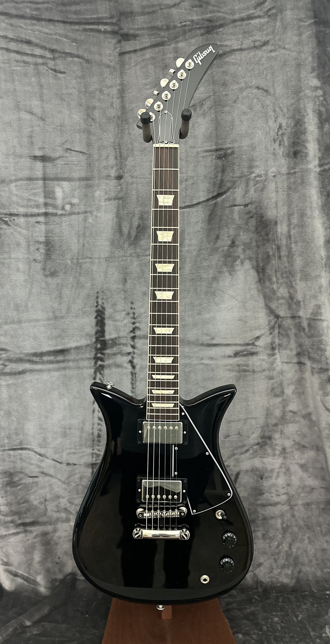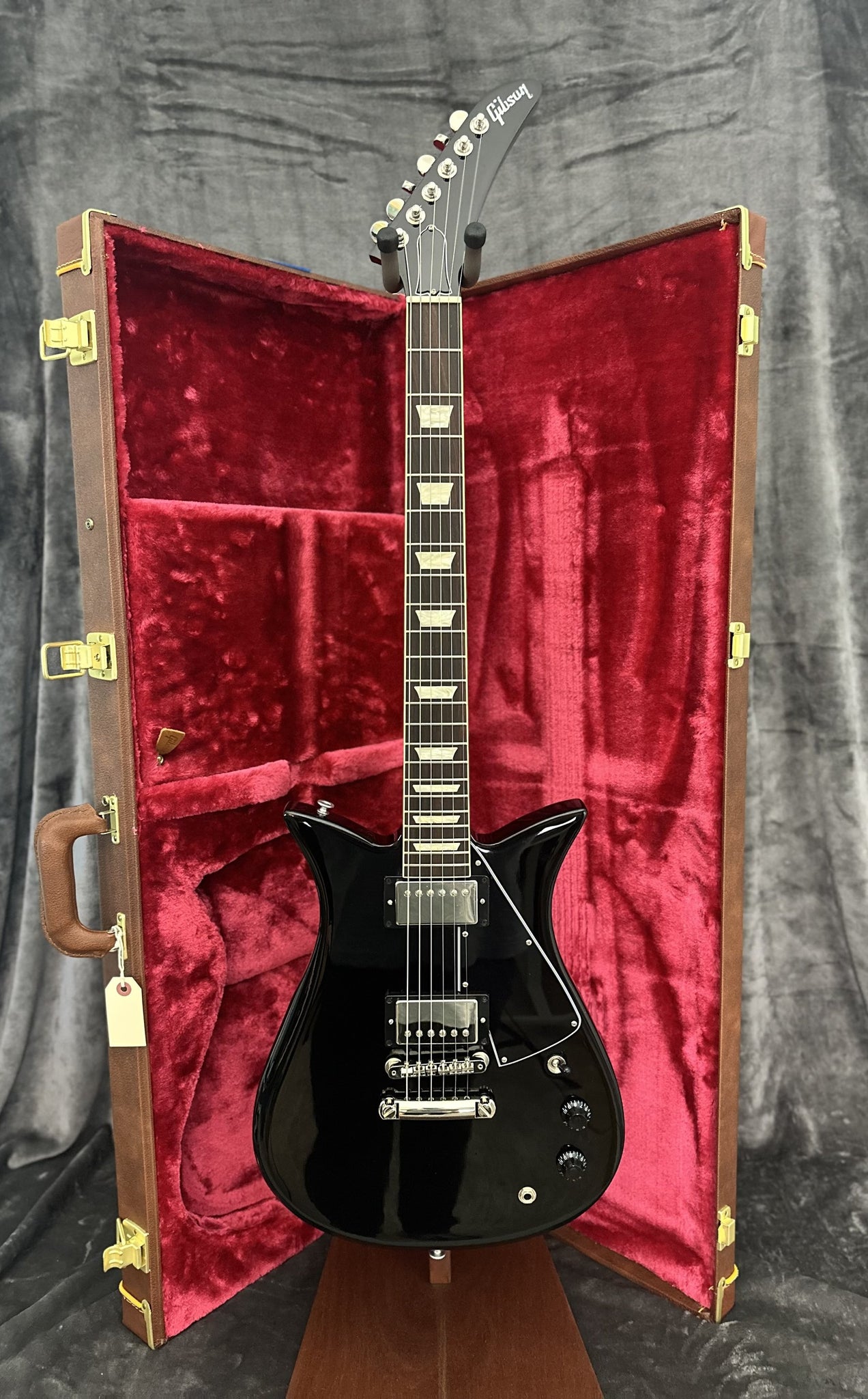 Bold, sleek, and unapologetically distinct, the 2024 Gibson Theodore in Ebony is a striking reissue of a long-lost design straight from the vaults of Gibson history. Originally sketched by Ted McCarty in 1957 but never released in his time, the Theodore merges vintage inspiration with modern playability—and in this deep black finish, it's more menacingly elegant than ever. The Theodore features a lightweight and resonant chambered alder body with a sculpted double-cut silhouette unlike anything else in the Gibson lineup. Its ergonomic contours and minimalist design are paired with a mahogany neck and rosewood fretboard, offering a warm tonal foundation and smooth, responsive feel. The neck sports a comfortable SlimTaper profile and a 22-fret, 24.75" scale length familiar to Gibson players.Additional features include a Tune-O-Matic bridge with a stopbar tailpiece, Grover tuners for solid tuning stability, and black top-hat knobs to complement the sleek Ebony finish. A black pickguard and minimalist headstock design round out the guitar's sharp visual presence. The 2024 Theodore isn’t just a nod to Gibson’s past—it’s a bold step into its future. With limited production and a design that stands apart from the crowd, this guitar is a rare mix of history, innovation, and attitude.