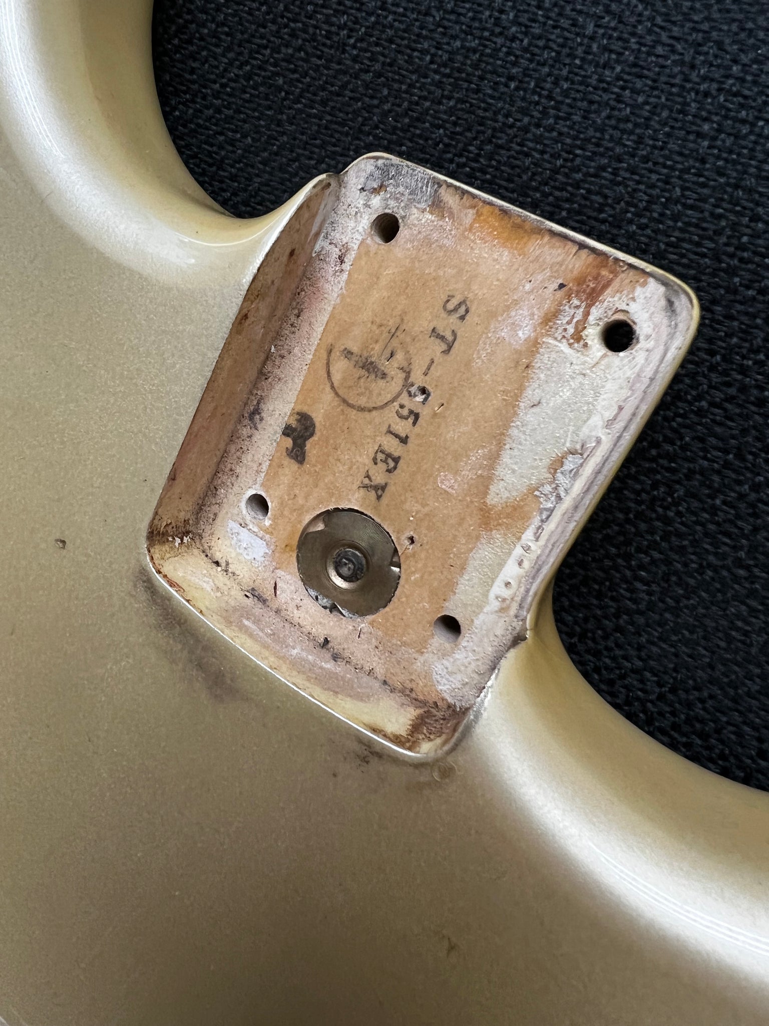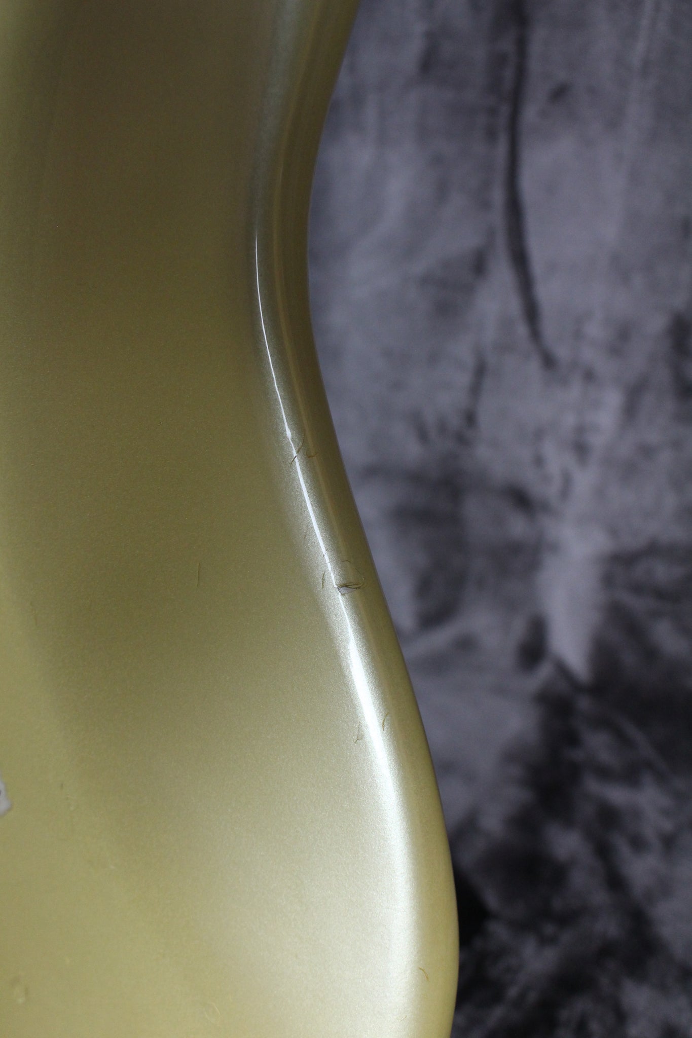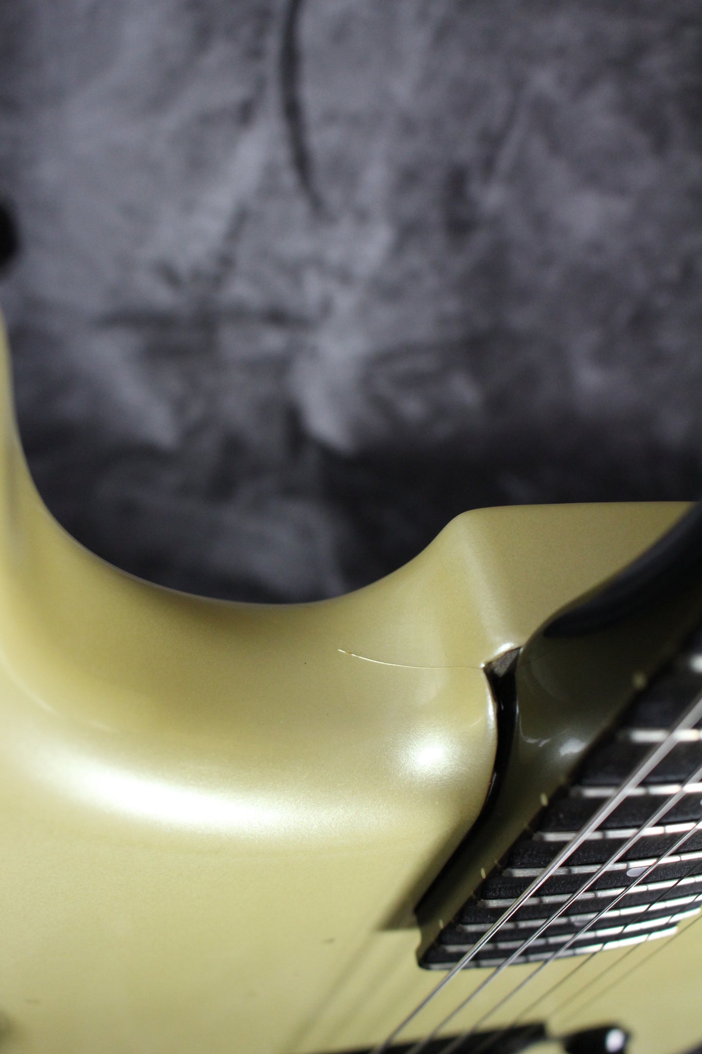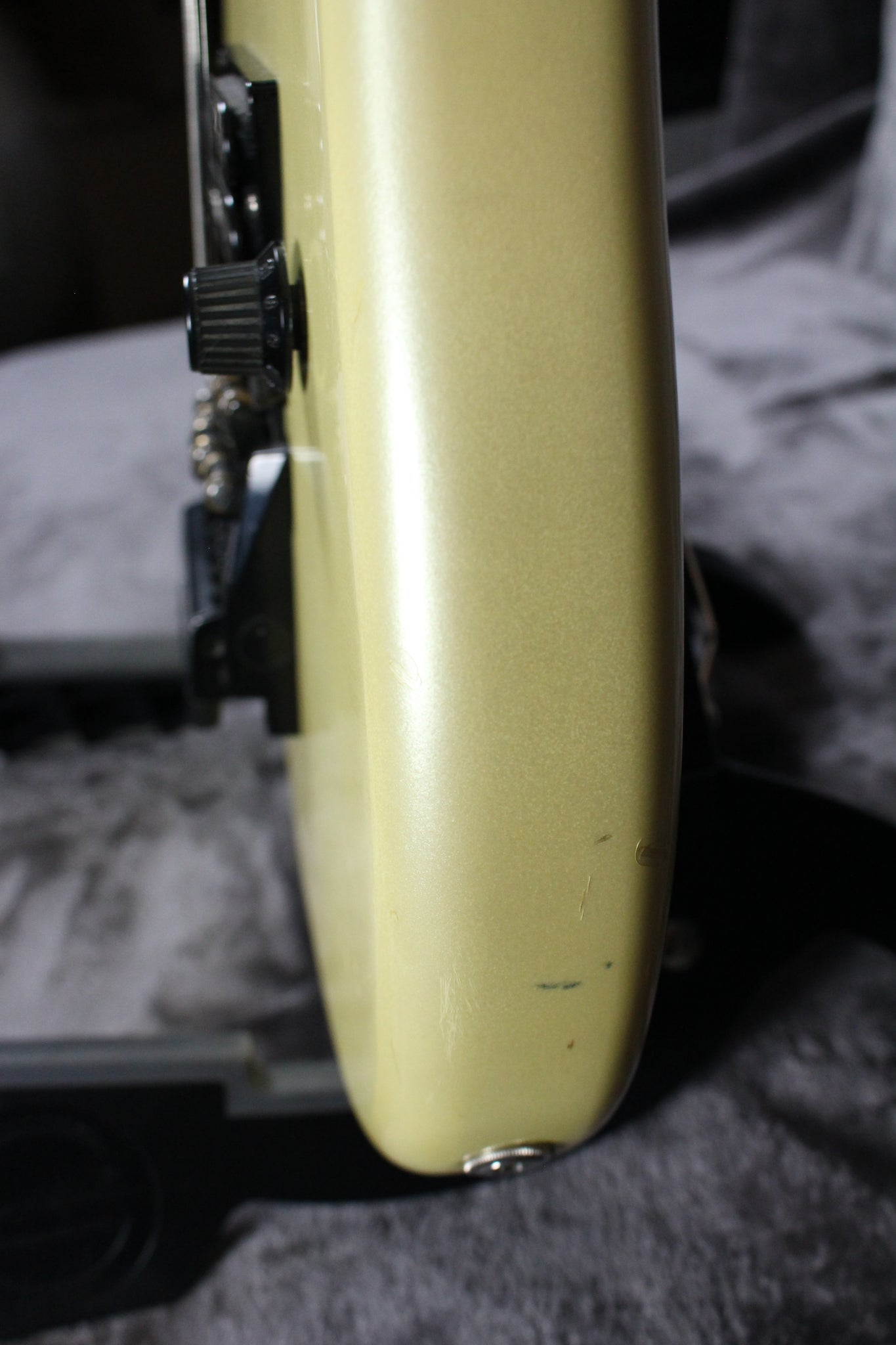 Cosmetics: This guitar is in good shape. It has light surface scratches and small indentations on the body. The back of the neck is clean, and the frets show minimal wear. It has a scalloped fretboard from the 12th fret down. A locking nut was used, and then removed, and a non-original string tree is in place.The back has buckle rash and a few indentations. Overall, this guitar plays very well and sounds fantastic.
