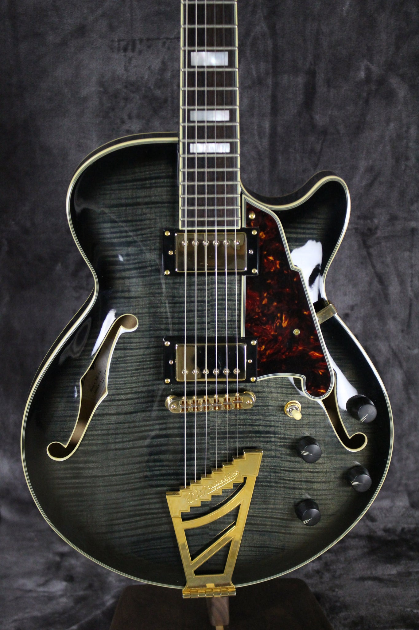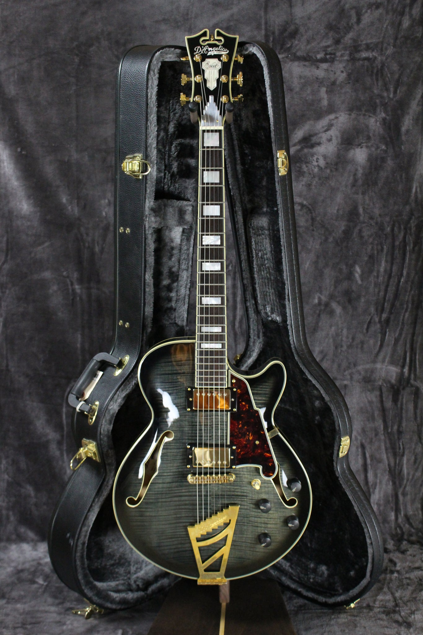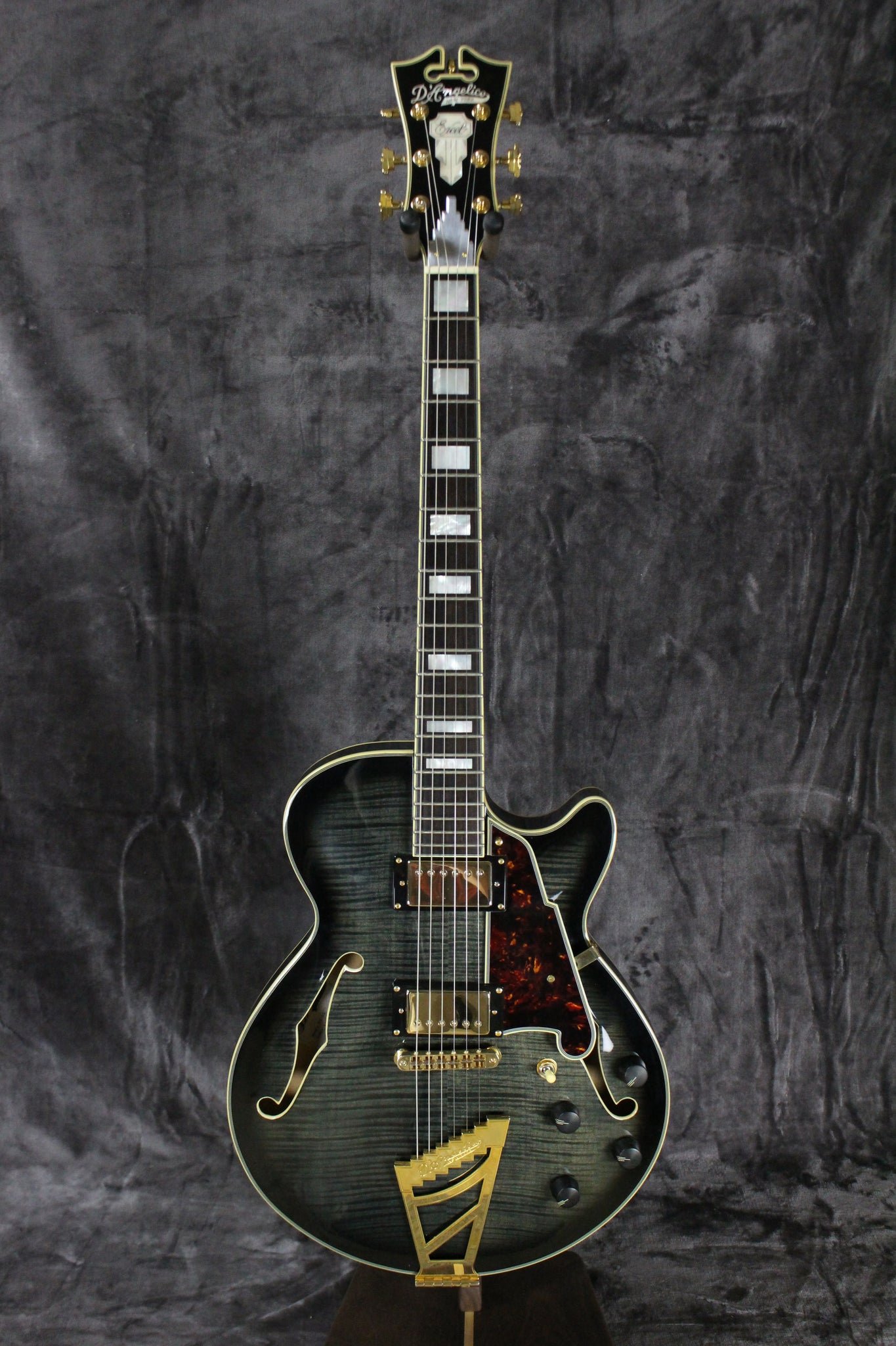 The D’Angelico Excel SS is a beautiful and versatile semi-hollow guitar. The Excel SS’s semi-hollow, single-cutaway body is extremely comfortable and yields a bright, rich, resonant sound with loads of bite and sustain, while a solid center block ensures a feedback-free performance. Equipped with a pair of humbuckers, the Excel SS serves up a variety of tones for every occasion. With a C-shaped, 3-piece maple/walnut neck, and a bound ebony fingerboard, this guitar is a joy to play. The Excel SS features high-end aesthetic touches such as mother-of-pearl and abalone block fingerboard inlays, multi-ply binding, a Scalini pickguard, and elegant gold hardware.