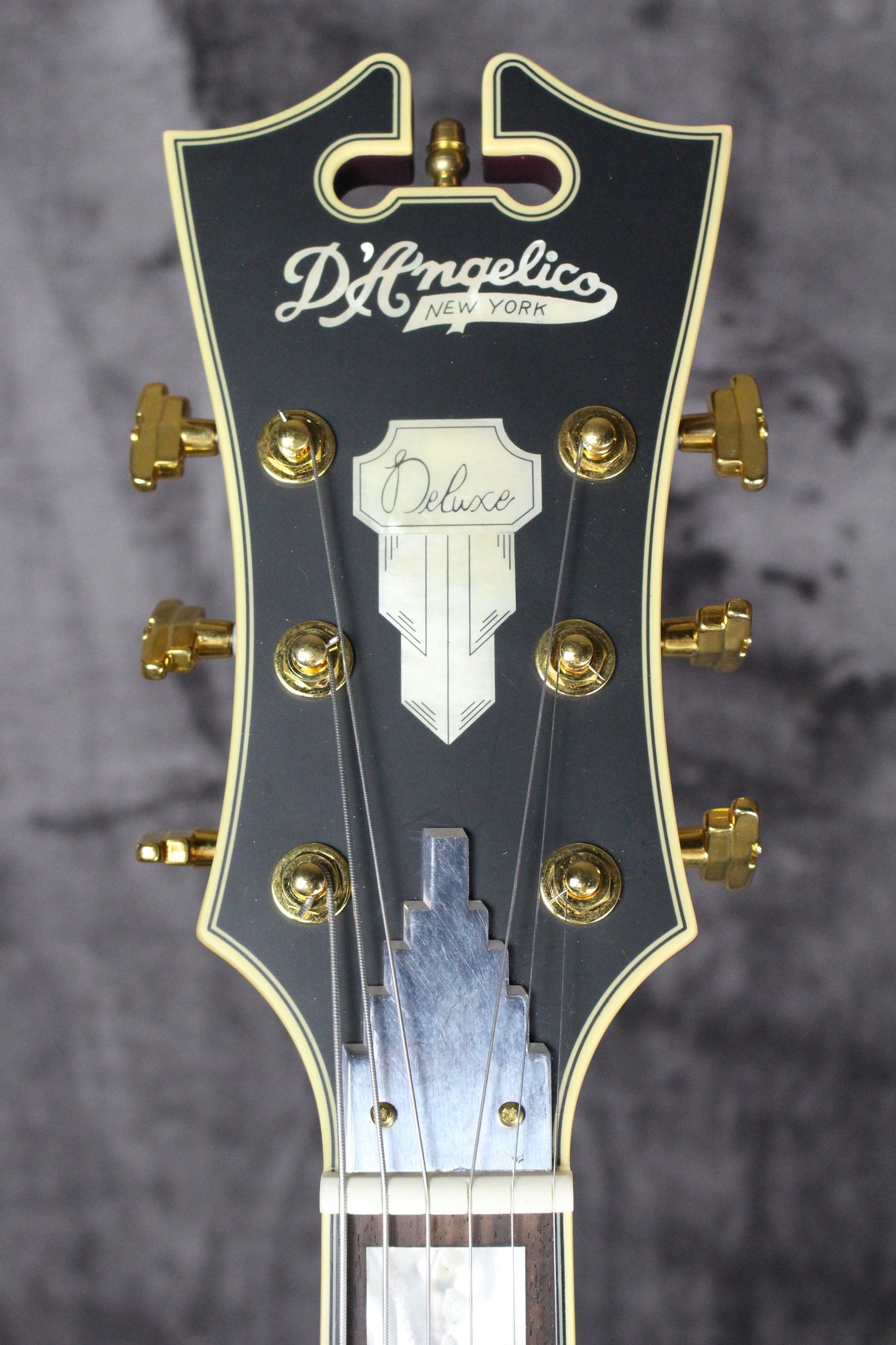 Pickups/Hardware: Grover Super Rotomatic locking tuning keys, two Seymour Duncan DA-59 humbuckers, Pinned Rosewood base/Roller Tune-O-Matic bridge, D’Angelico Stairstep tailpiece, Ebony control knobs, Tortoise Scalini pickguard.