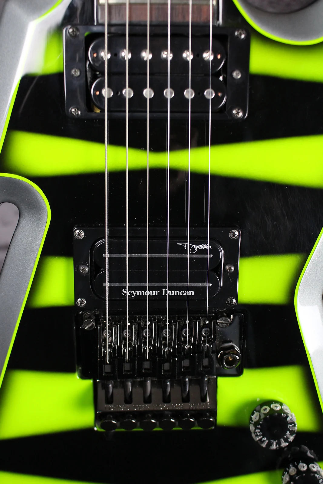 This guitar has Grover tuning keys, Dimebag Seymour Duncan humbuckers, and a Floyd Rose tremolo system.