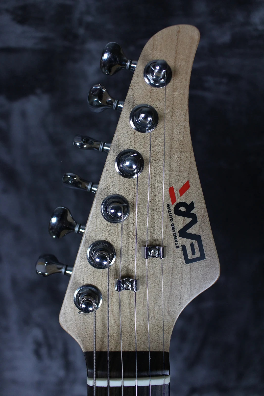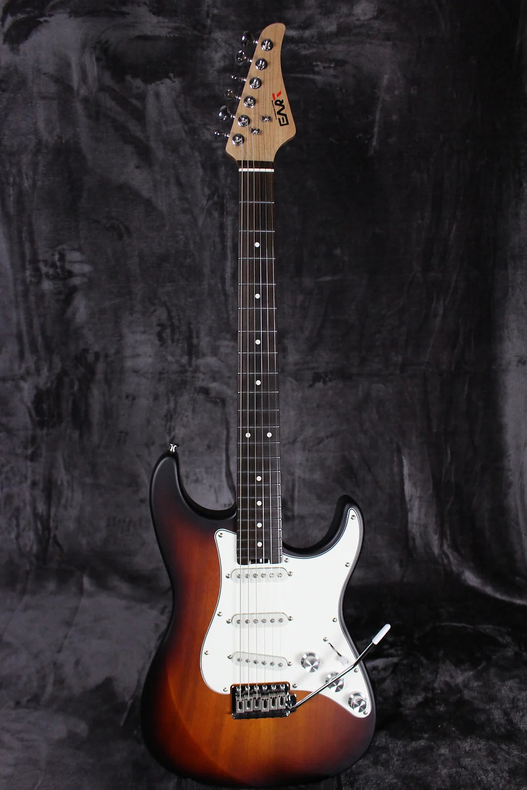 Summary: This “S” style guitar from Eart is in excellent condition. It comes equipped with three single coil pickups, chrome control knobs, and has a dark Rosewood fingerboard. It plays very well and has just been set up by our in-house tech.
