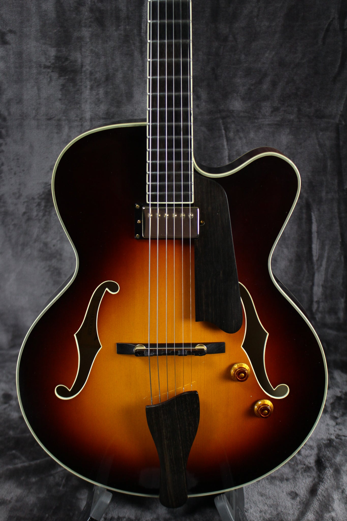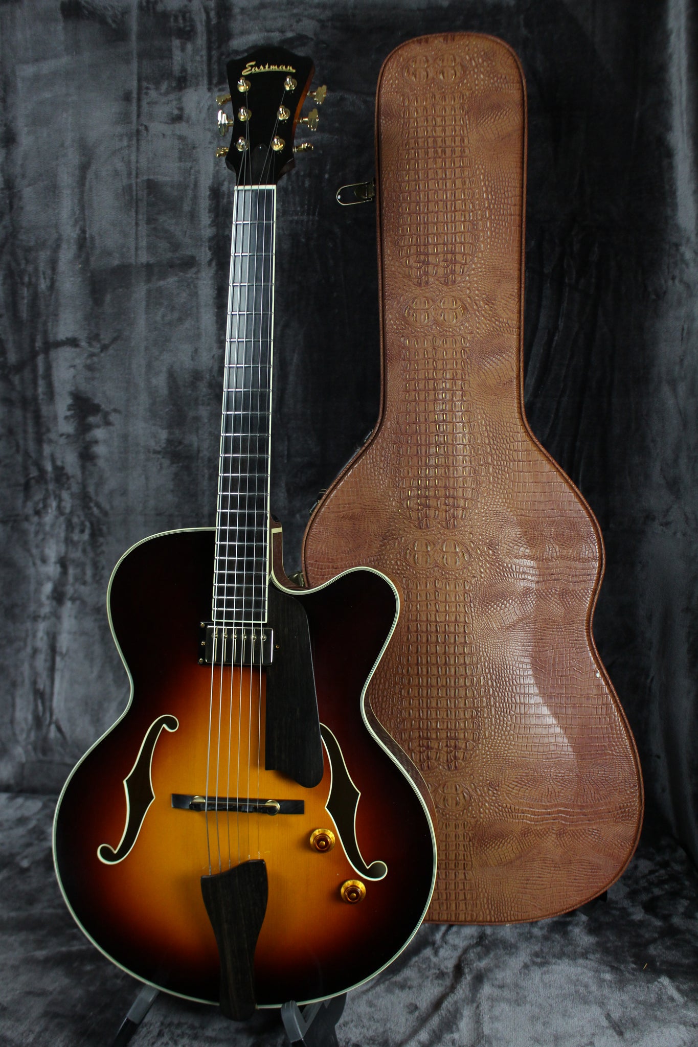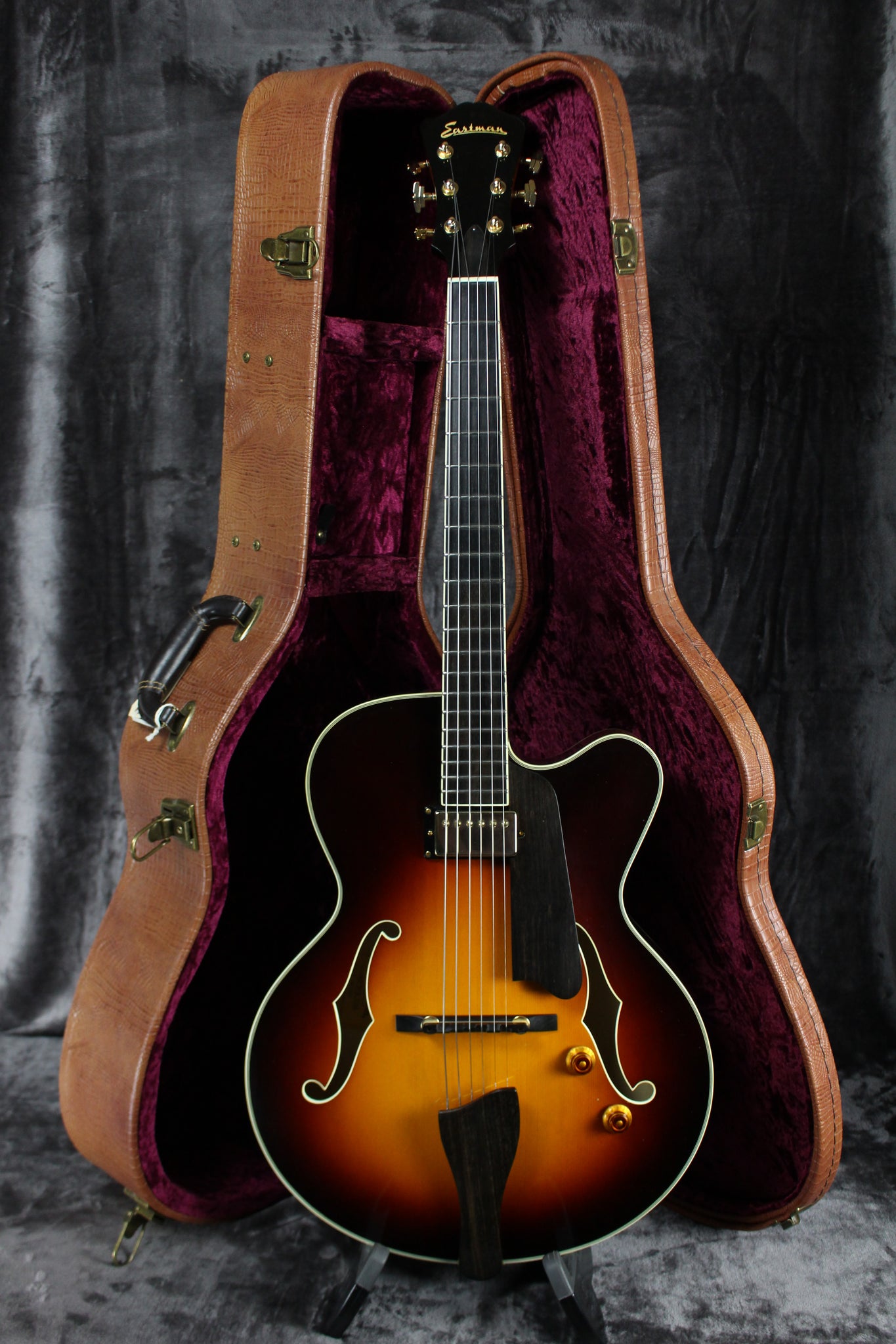 Summary: This 2010 Eastman AR503CE archtop pinsthat historic hollowbody charm and single-pickup sound against contemporary quality and playability to bridge the very best of archtop ages old and new. Its solid carved Sitka spruce top and maple back and sides establish a bright, clear, and naturally woody tonality right off the bat, further enhanced by an ebony-topped 3-piece maple neck with a C profile for player-fluid playing comfort. A single Seymour Duncan Seth Lover humbucker at the neck conveys tubby jazz tones and moody delta blues licks alike, with proper amber bell knobs for master Volume and Tone control to find that perfect archtop voice that suits your style.
