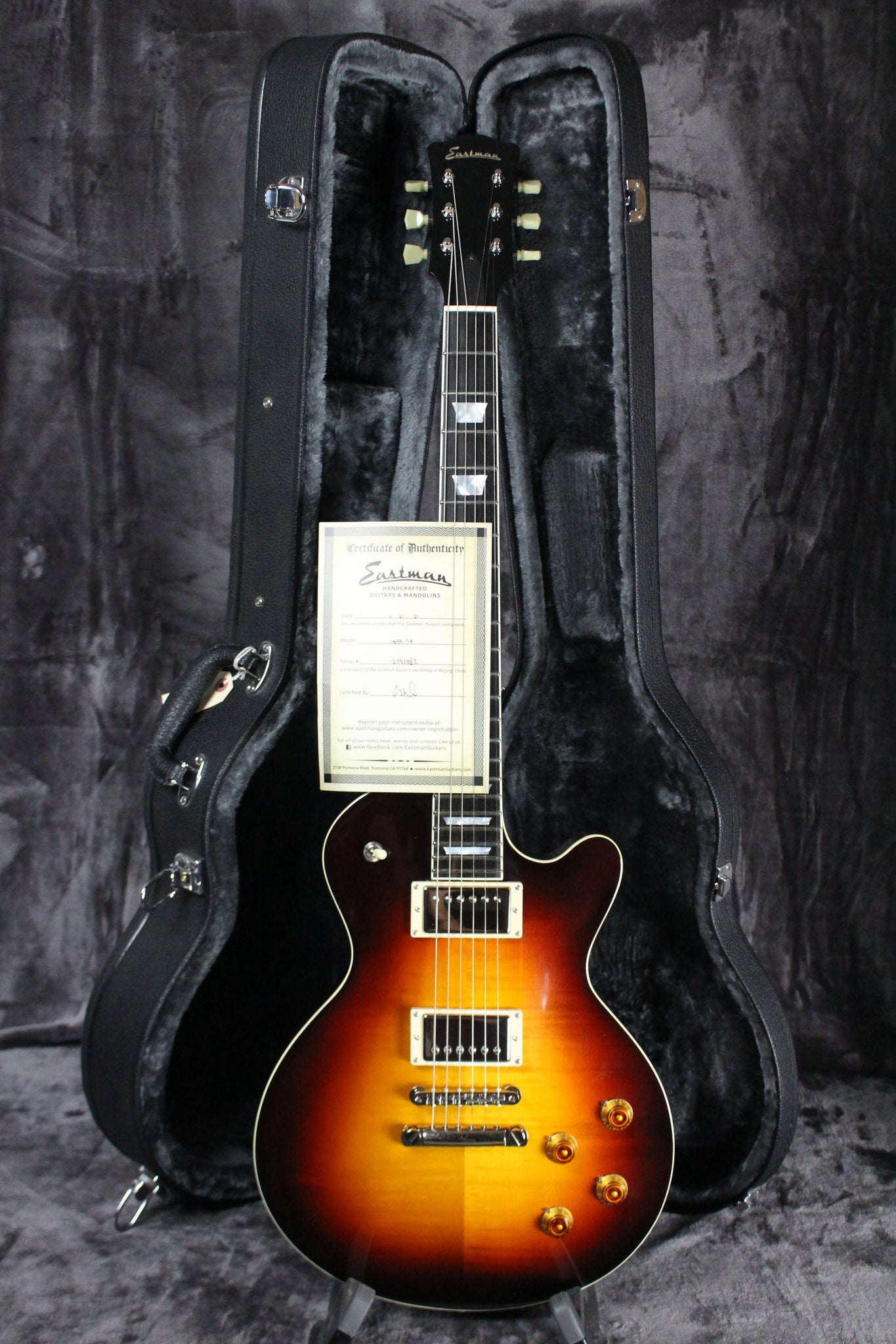 Summary: The SB59 is Eastman's take on the ultimate vintage style single cut with specs and a build quality that are stunning. It has a pair of Seymour Duncan ‘59 humbuckers. The solid Mahogany body is resonant, and the ebony fretboard is fast and smooth. The best sounds by far are the neck pickup with the volume and tone cranked. It’s bluesy, smooth, and sounds like the 60’s and 70’s. This guitar ships in the original hard-shell case and it plays and sounds fantastic.