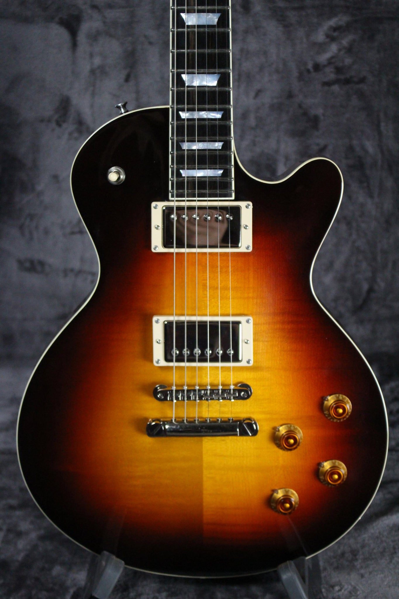 Neck: Bound one piece Mahogany with an Ebony fingerboard, 24.75” scale length, 1 11/16” nut width, trapezoidal pearl inlays.