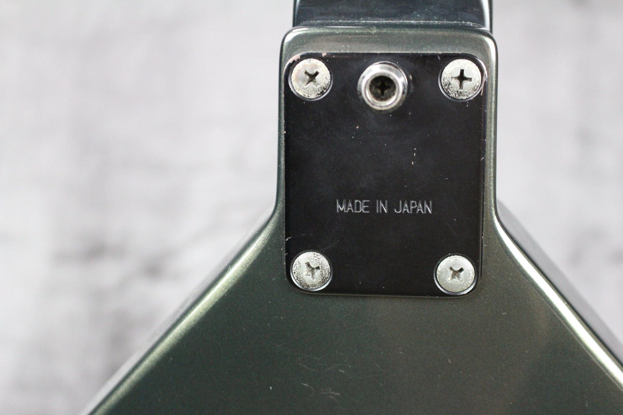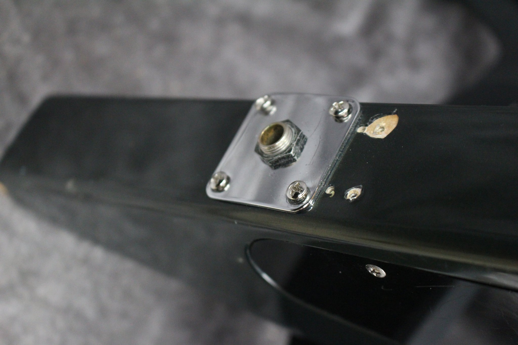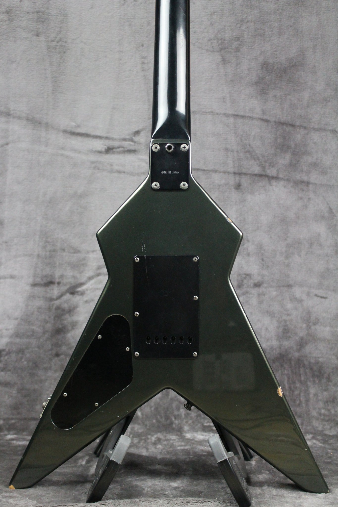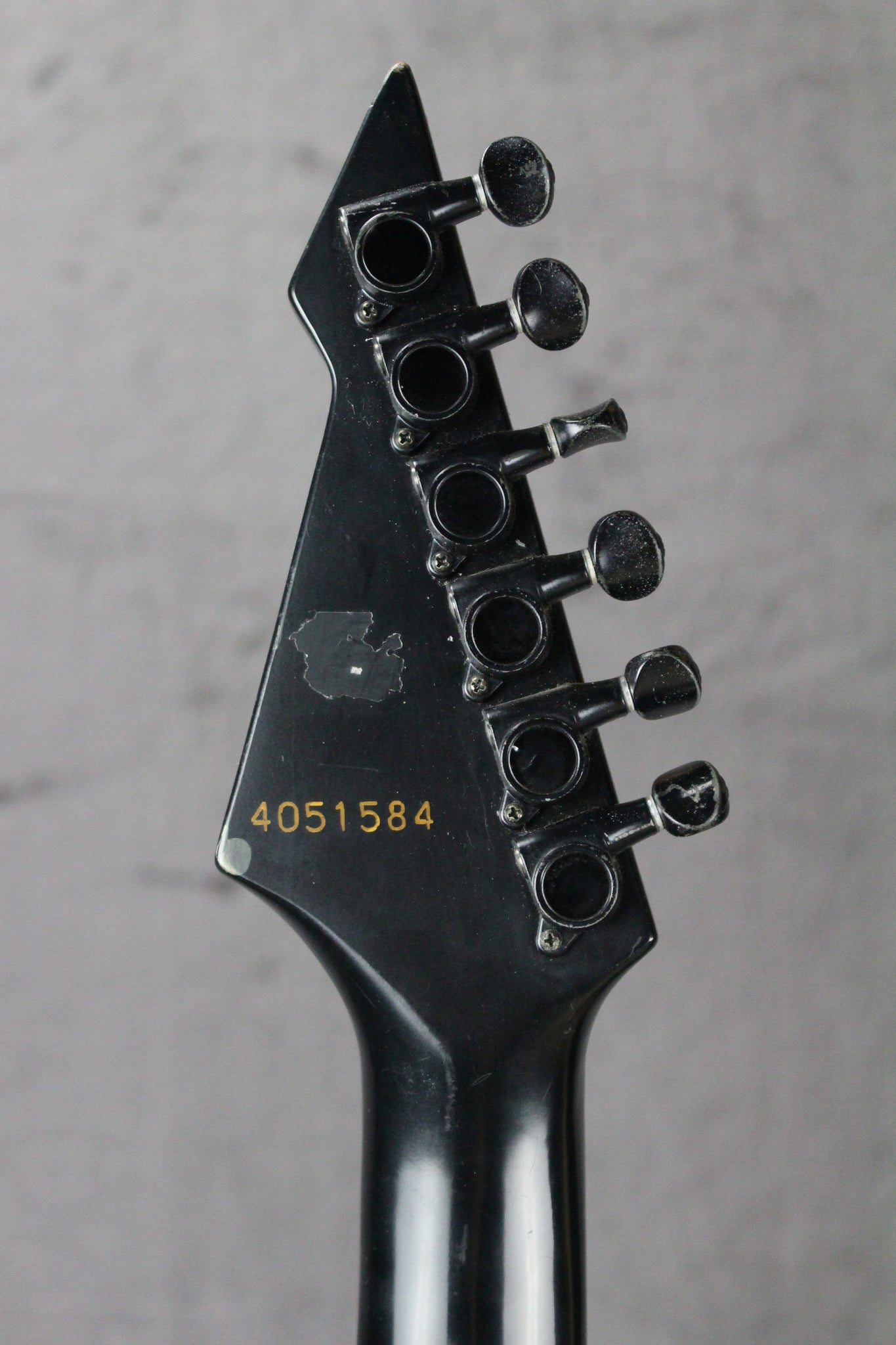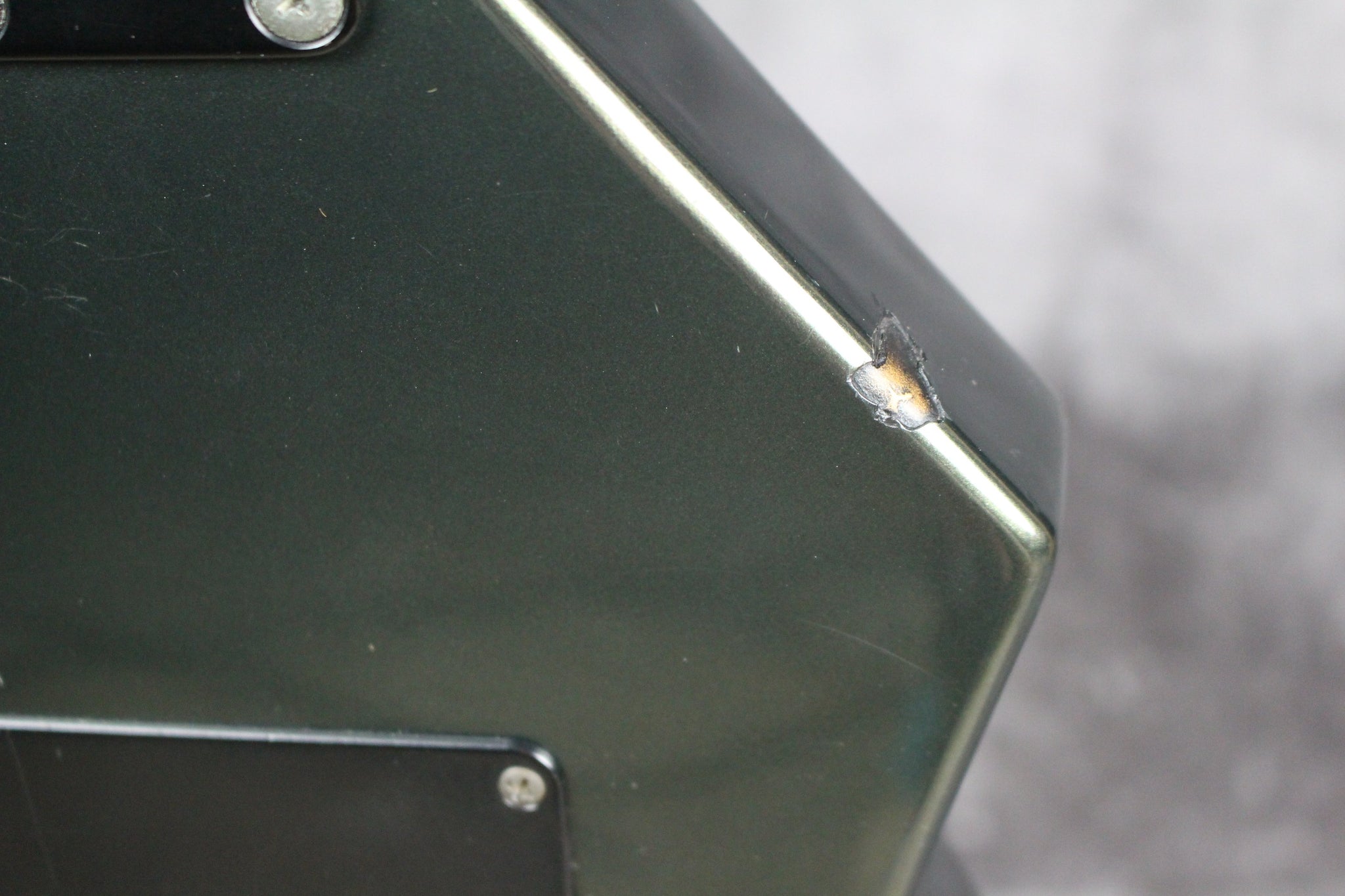 Cosmetics: This guitar’s body has a lot of wear on it. There are chips in the finish and small portions of wood missing on the points of V. There are chips in the finish hear and there on the body. There is one screw missing on the neck pickup cover that does not affect the playability or sound of the guitar. The input jack-plate has been replaced. The neck pickup has been replaced with an EMG humbucker.