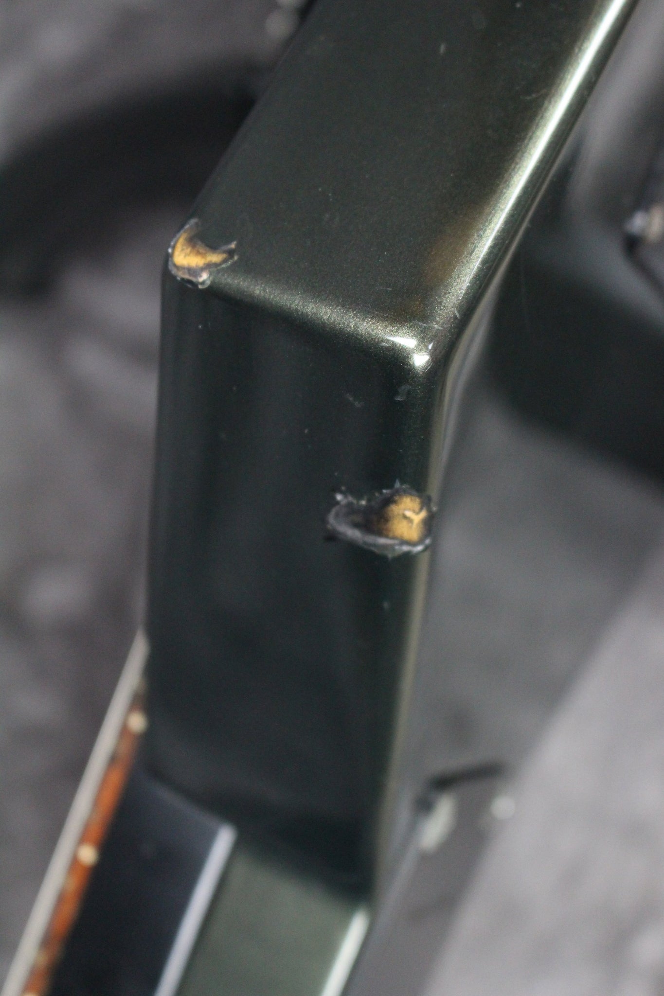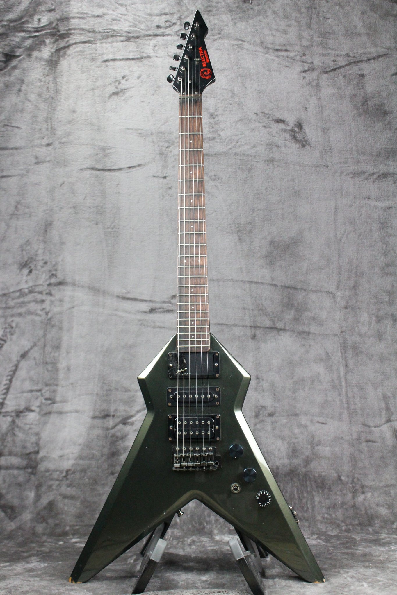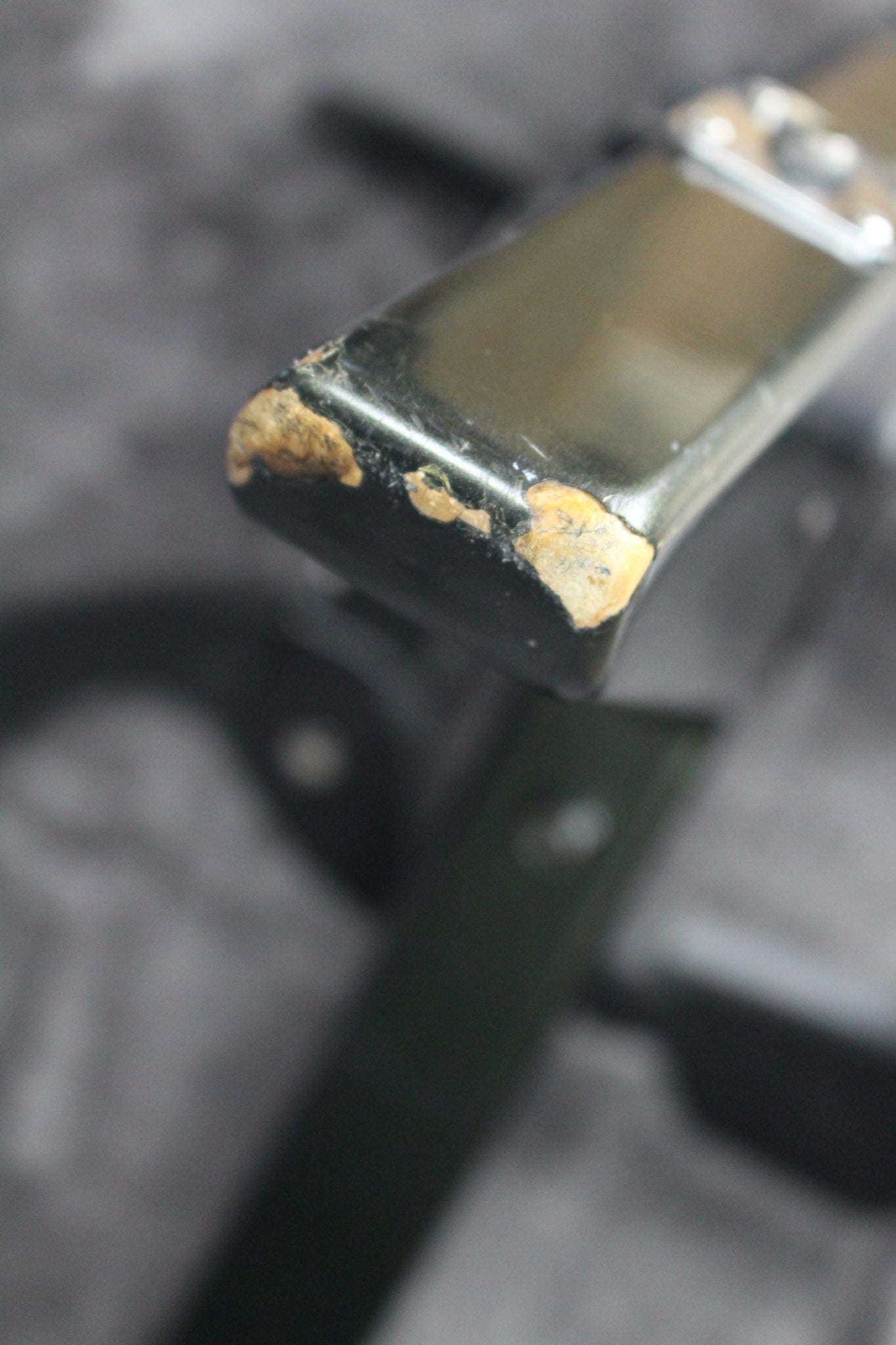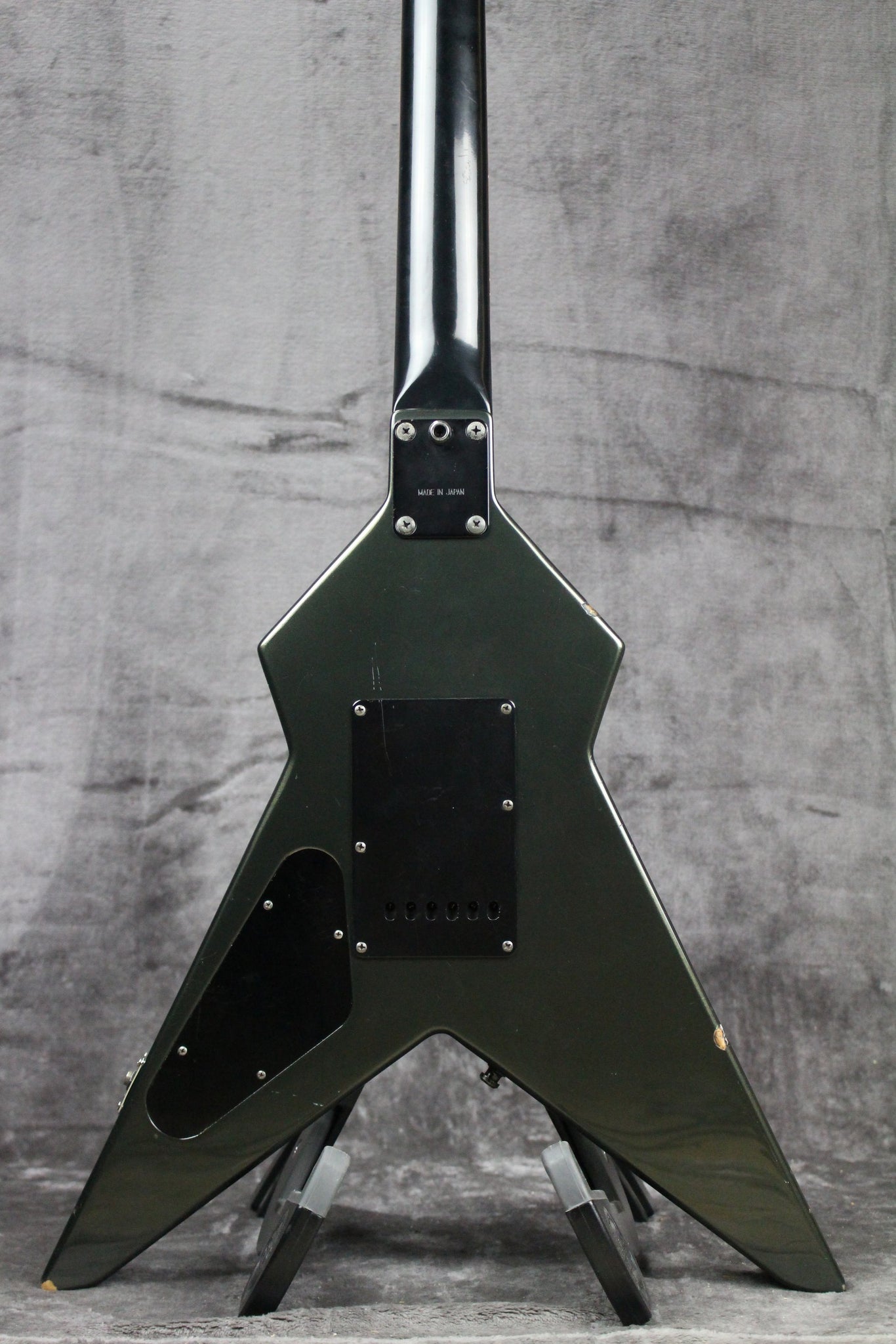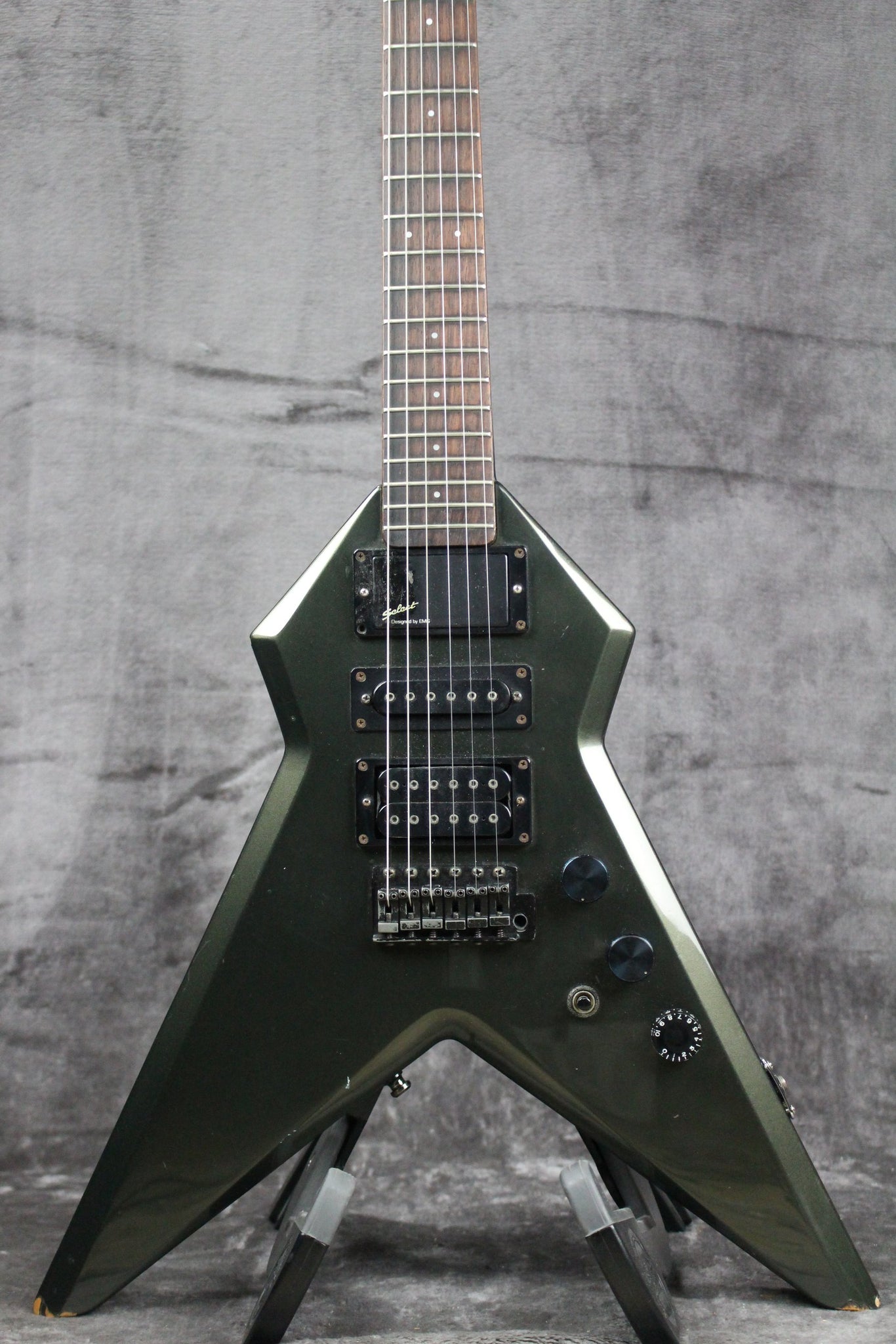 Cosmetics: This guitar’s body has a lot of wear on it. There are chips in the finish and small portions of wood missing on the points of V. There are chips in the finish hear and there on the body. There is one screw missing on the neck pickup cover that does not affect the playability or sound of the guitar. The input jack-plate has been replaced. The neck pickup has been replaced with an EMG humbucker.