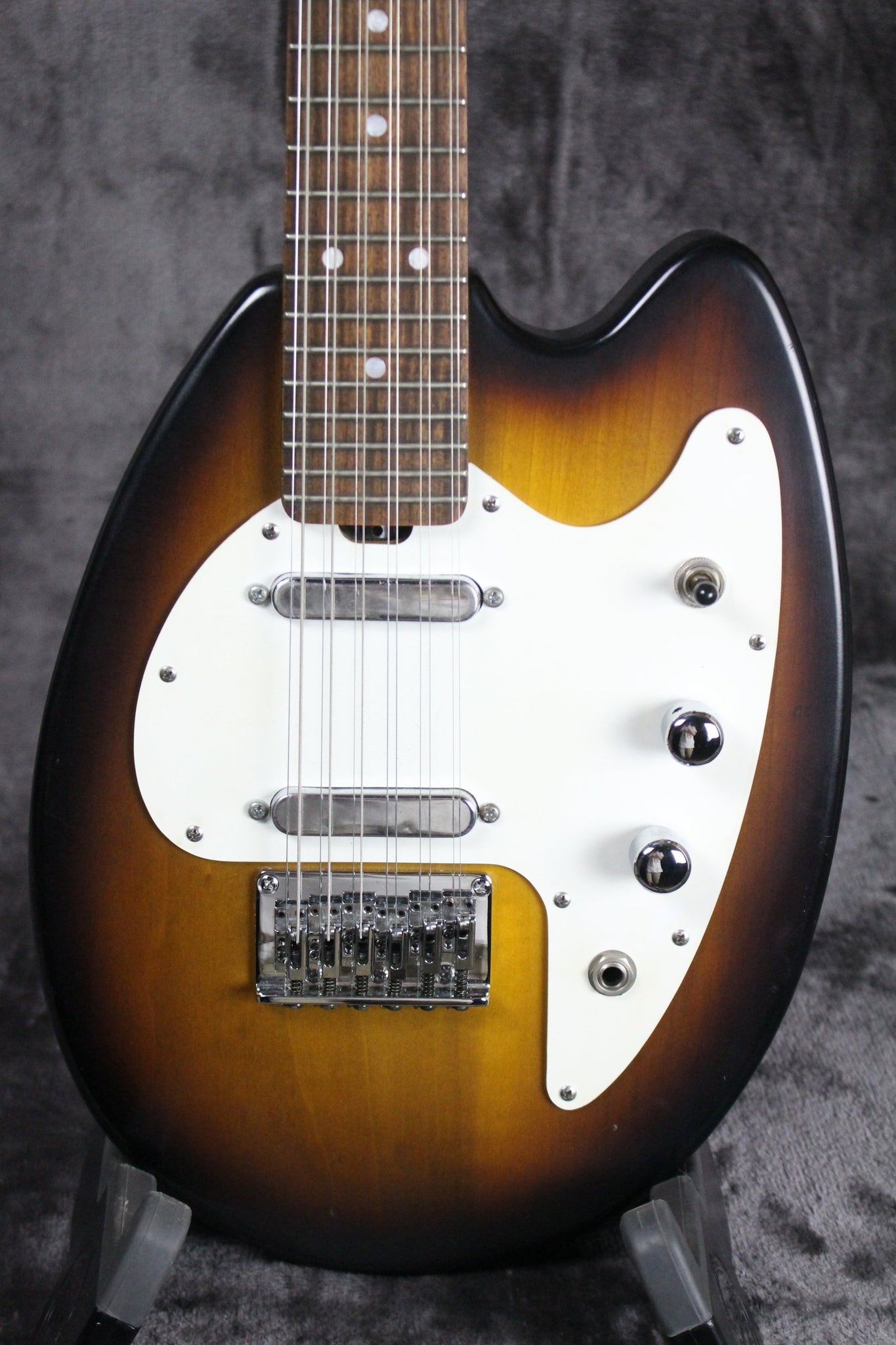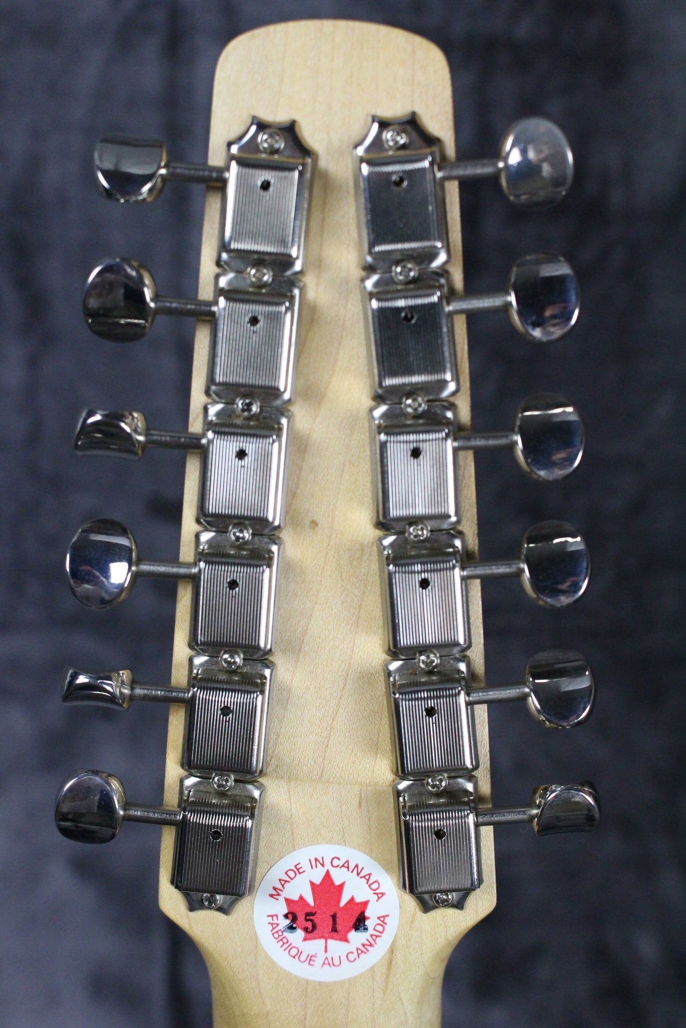 Pickups/Hardware: Two telecaster neck style single coil pickups, master volume/master tone controls/3-way pickup selector, vintage style tuning keys, white single ply pickguard, adjustable truss rod wheel, 6-saddle 12-string bridge (top load/through the body).
