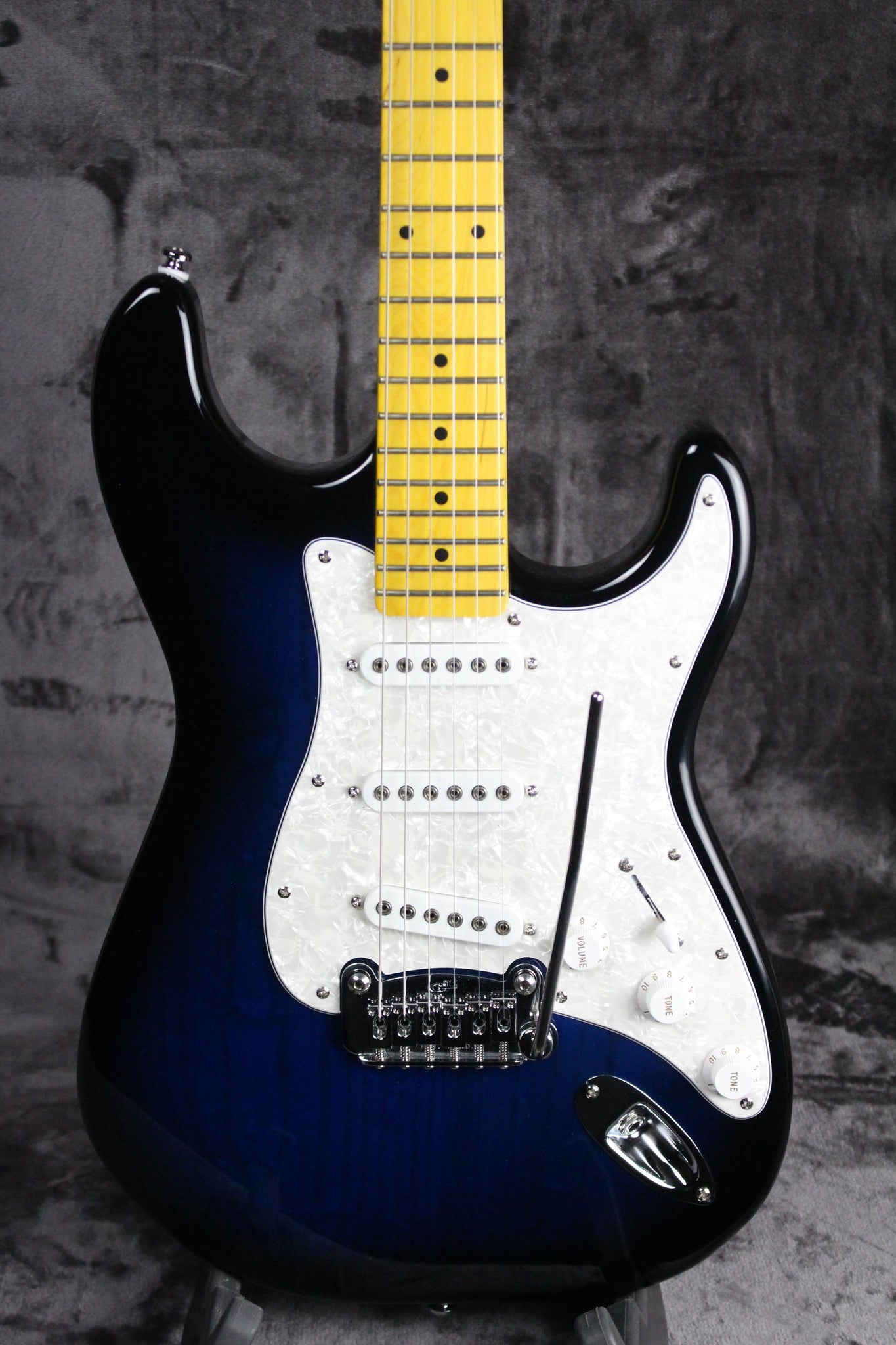 Pickups/Hardware: Three MFD single-coil pickups, G&L tuning keys, white pearl pickguard, master volume/two tone controls/5-way pickup selector, G&L Dual Fulcrum Vibrato tremolo system.