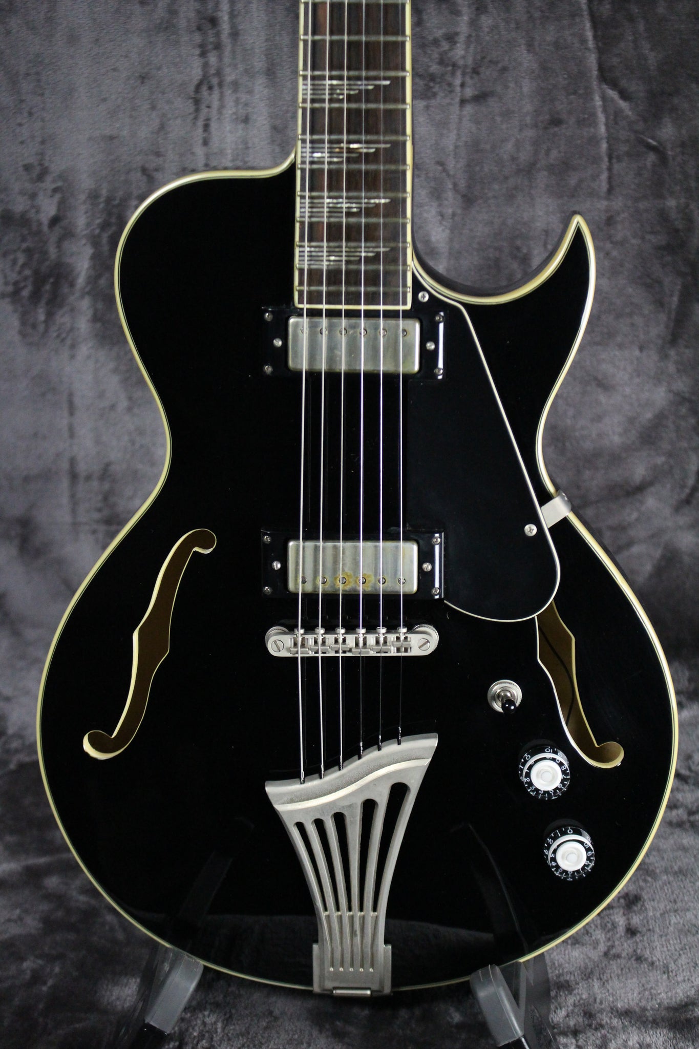 Pickups/Hardware: Mini humbucker pickups, Grover tuning keys, adjustable fixed bridge with a custom matte nickel floating tailpiece, black/white speed knobs.