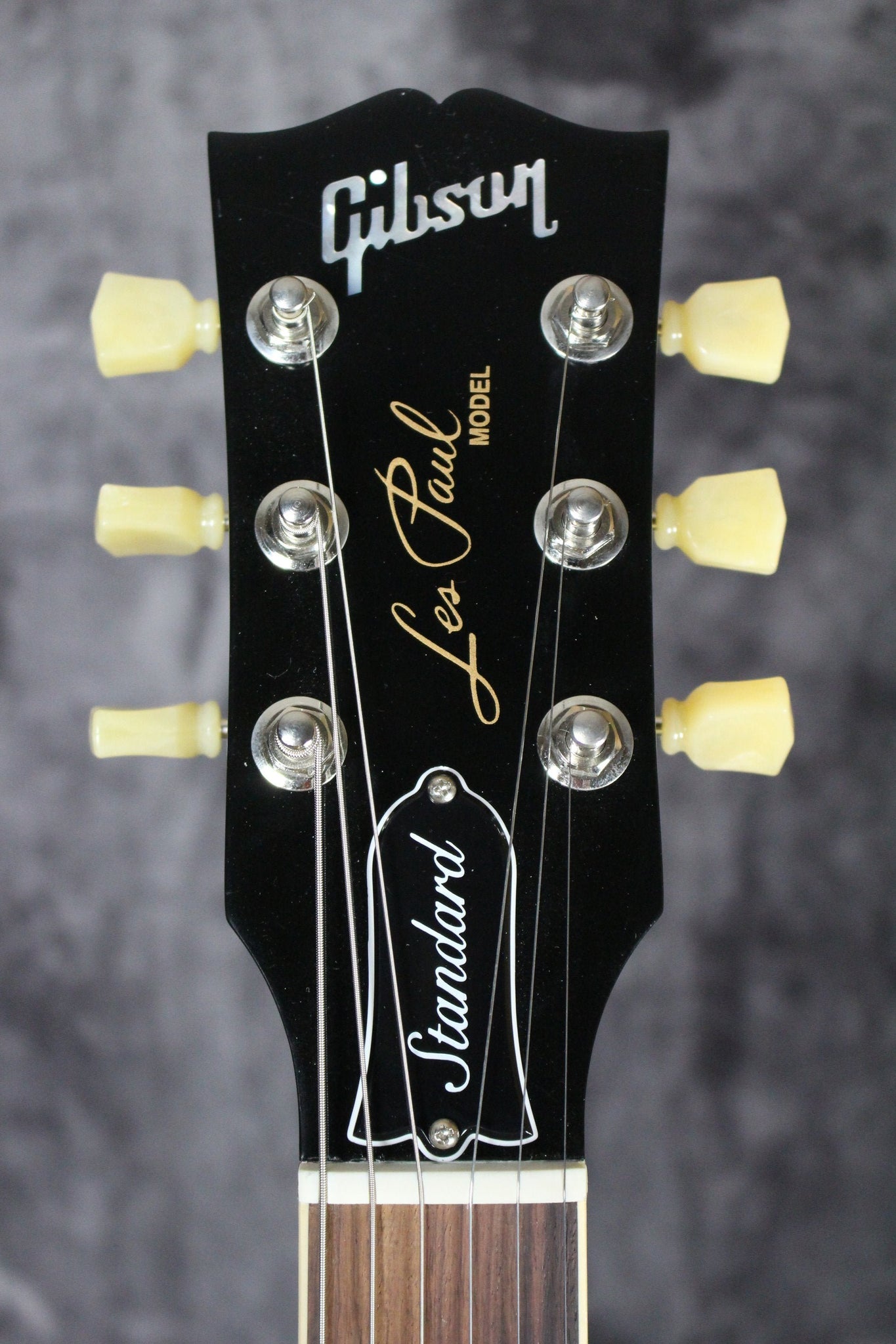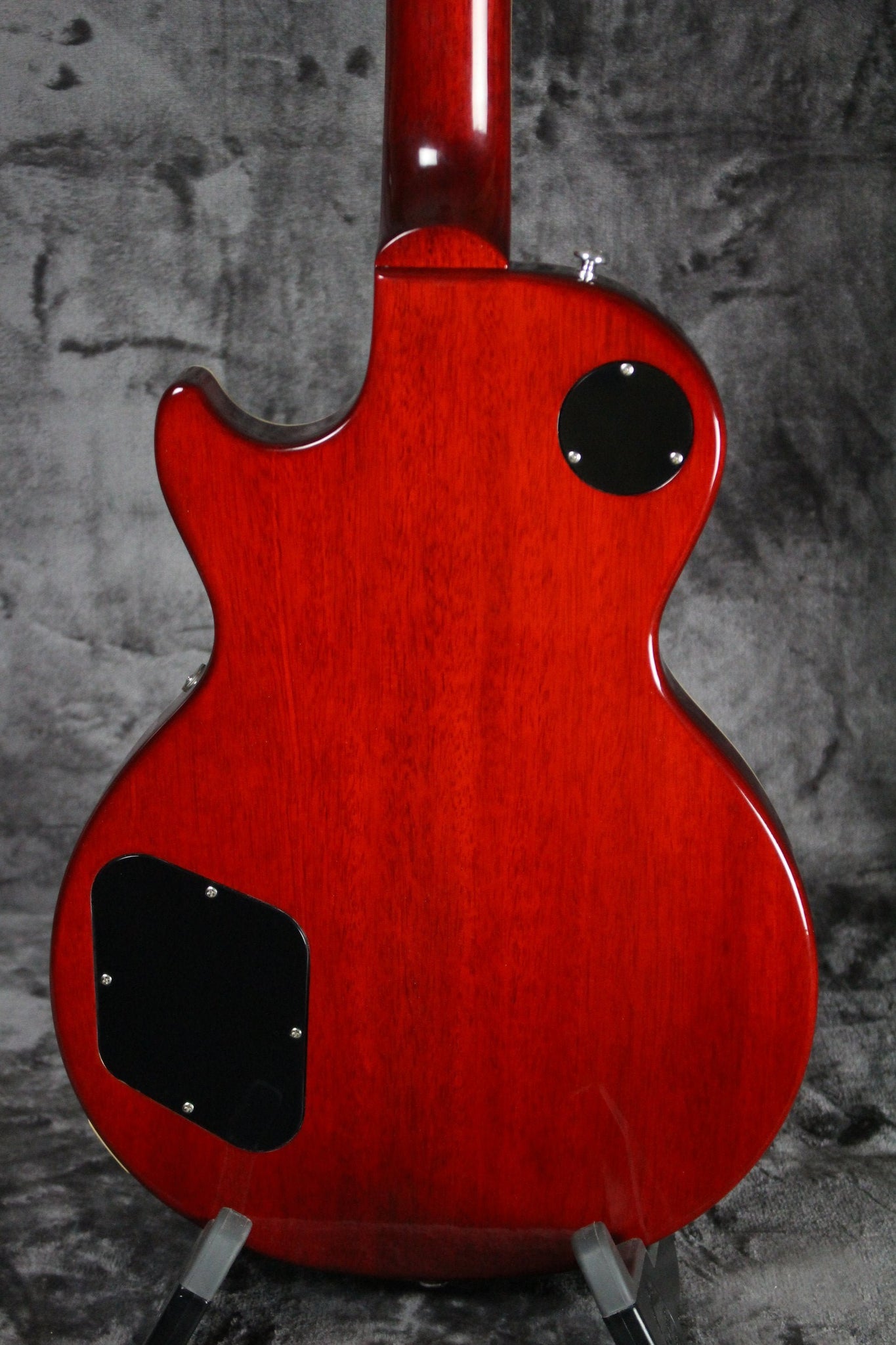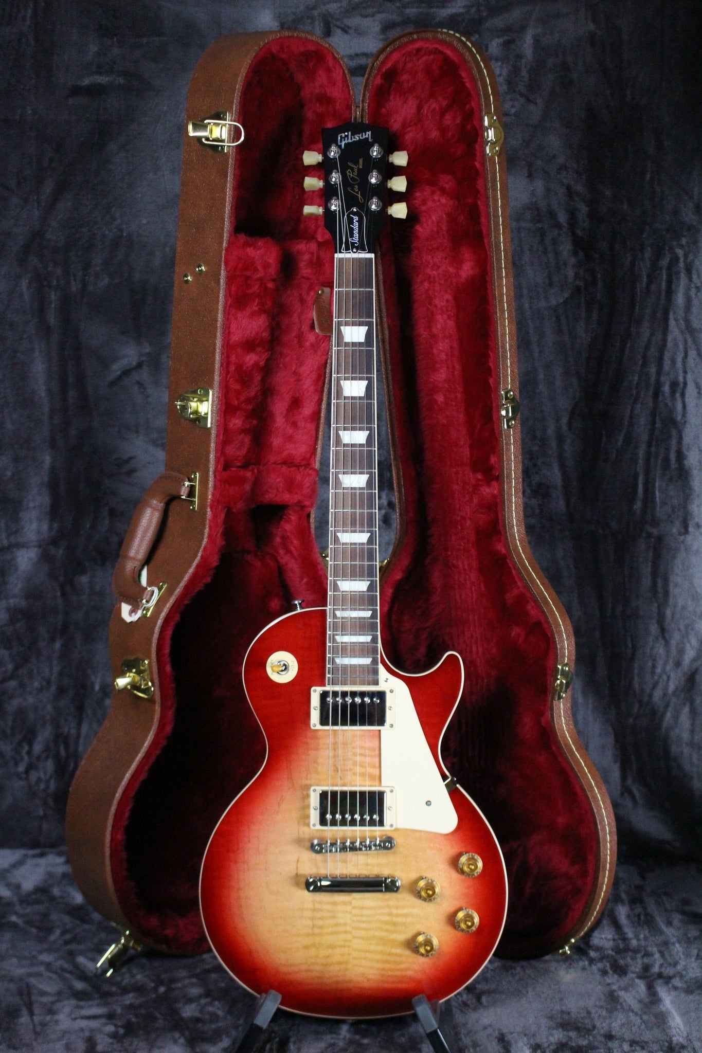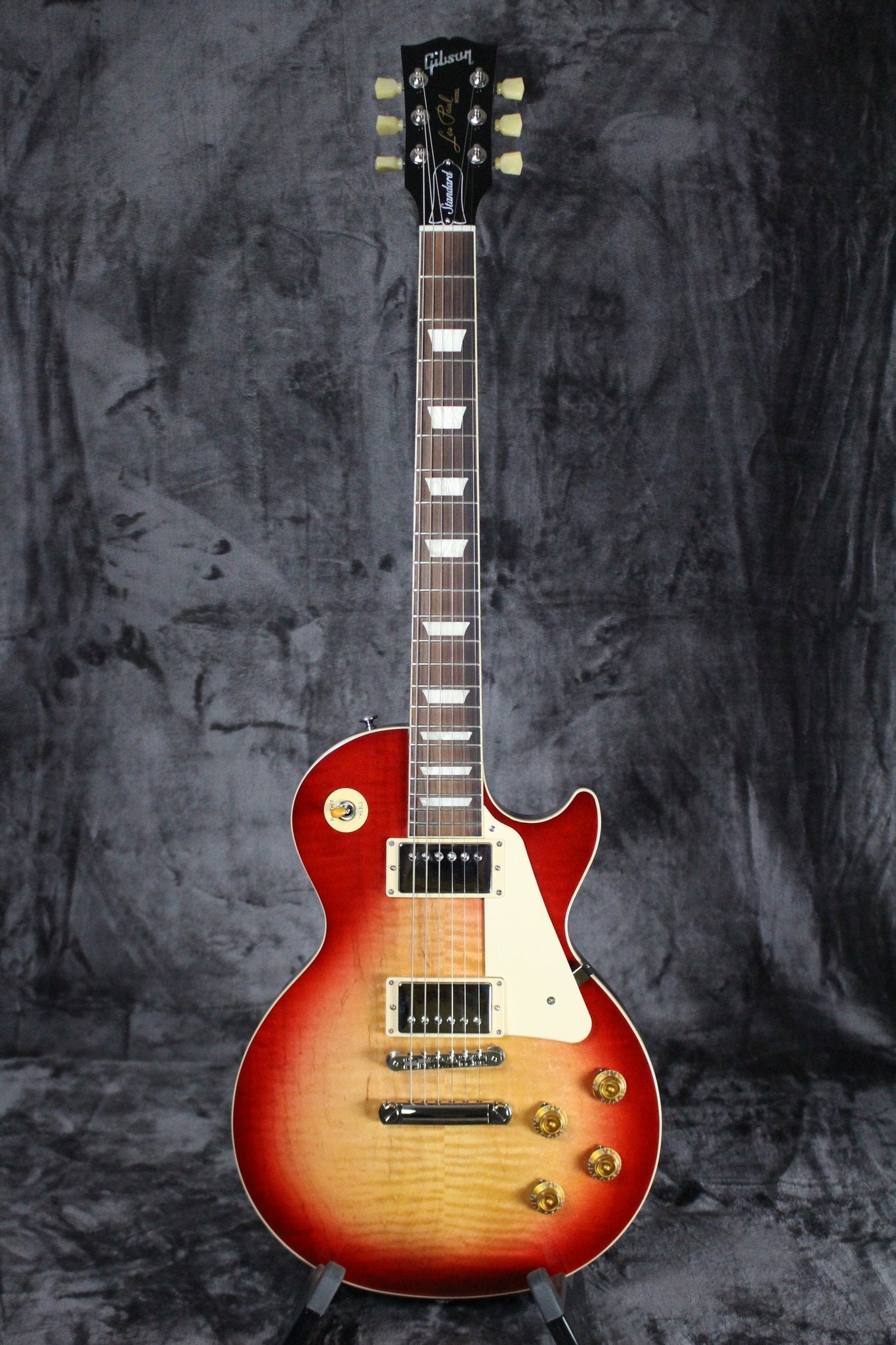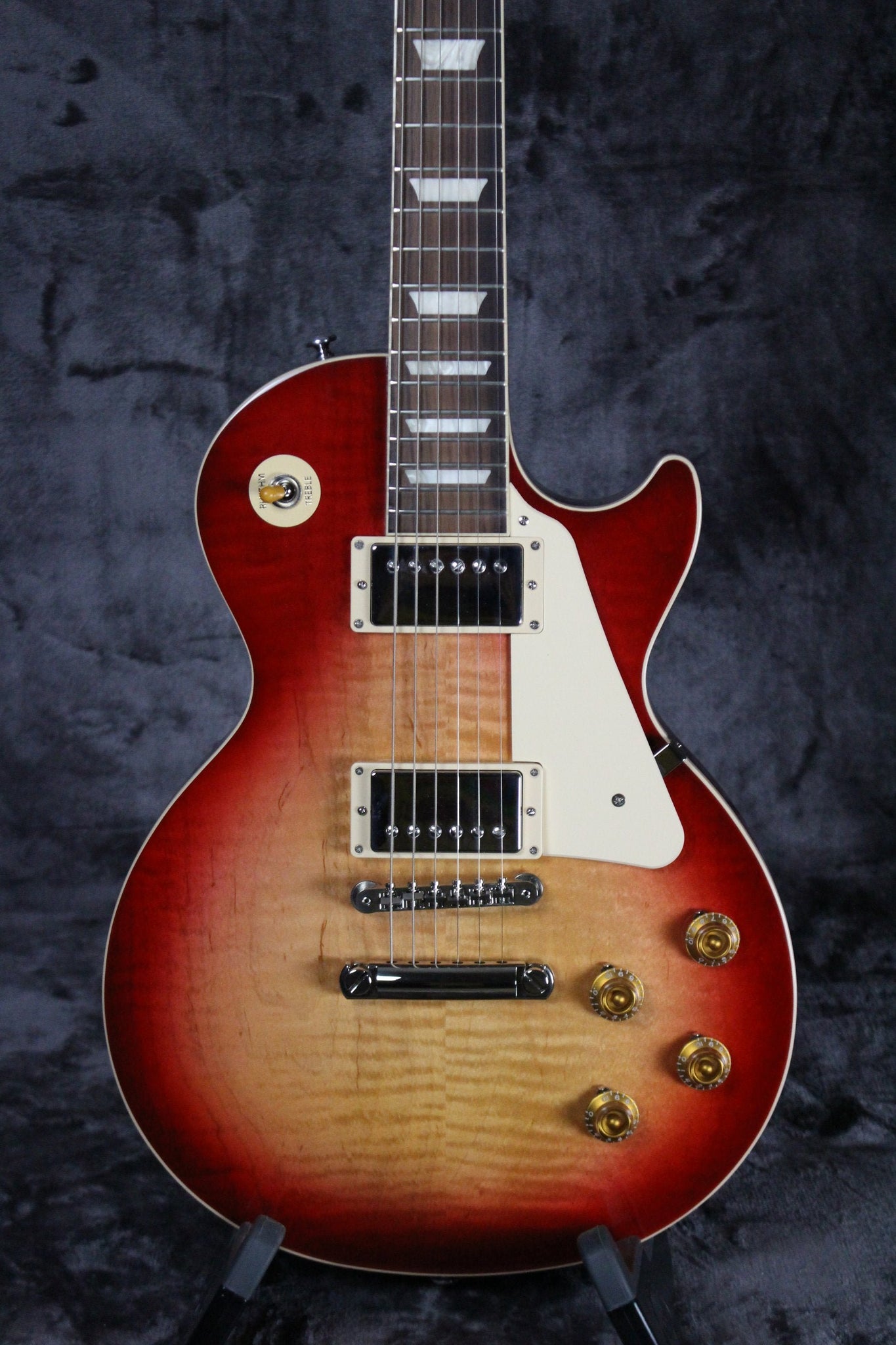Summary: The Les Paul Standard 50's has a solid mahogany body with a maple top, a rounded 50's-style mahogany neck with a rosewood fingerboard and trapezoid inlays. It's equipped with an ABR-1, the classic-style Tune-O-Matic bridge, aluminum stop bar tailpiece, vintage deluxe tuners with keystone buttons, and aged gold tophat knobs. The calibrated Burstbucker 1 (neck) and Burstbucker 2 (bridge) pickups are loaded with AlNiCo II magnets, audio taper potentiometers and orange drop capacitors.