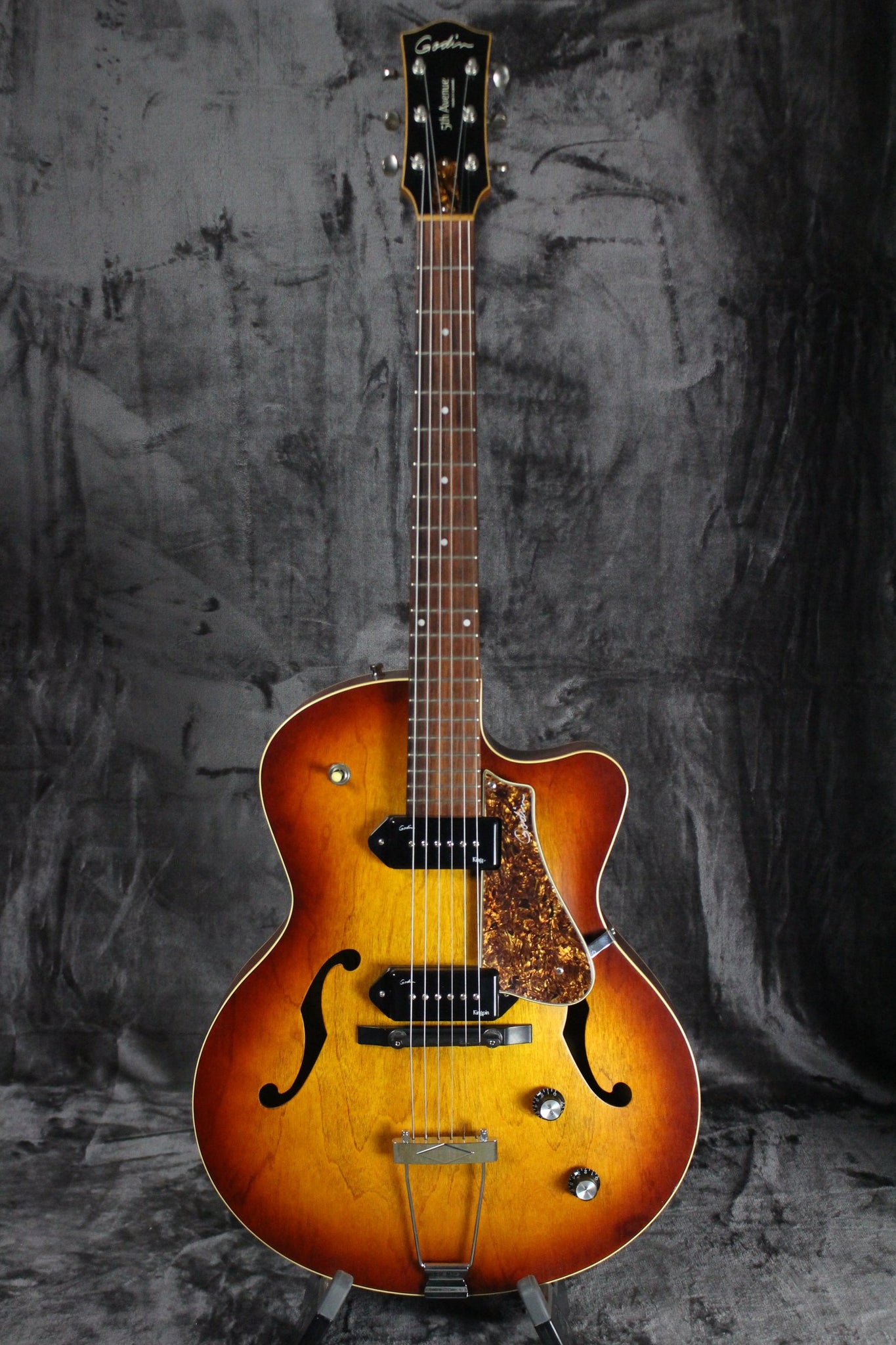 Pickups/Hardware: Two Godin P90 single coil pickups, 1x Tone, 1x Volume, 3-way Switch, floating pickguard, adjustable bridge, GraphTech nut, trapeze tailpiece.