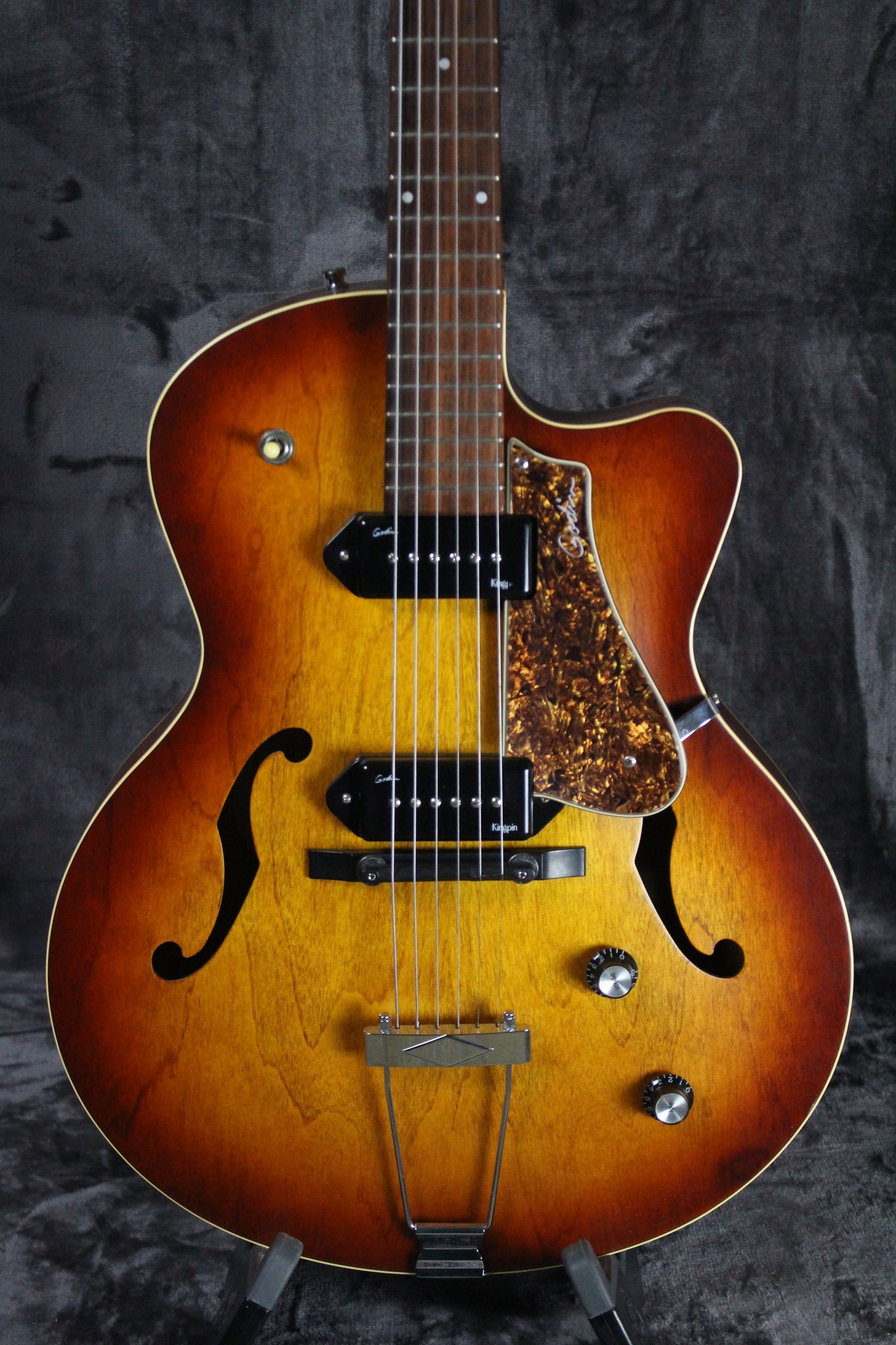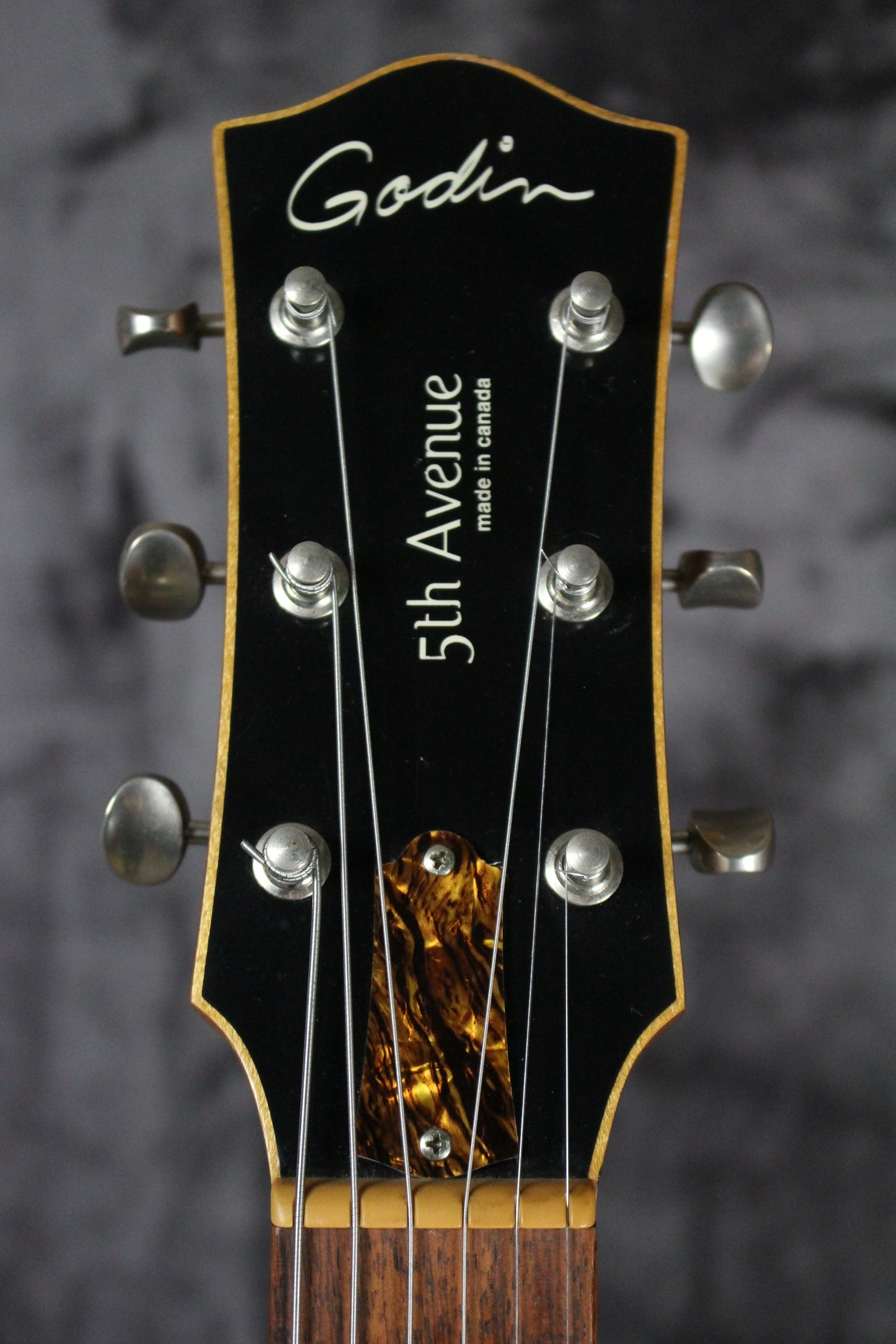 Summary: The 5th Avenue CW Kingpin features a Cutaway body design with two Godin Kingpin P90 single-coil pickups that deliver classic vintage tone with presence and clarity. Made from Canadian Wild Cherry, the body of the 5th Avenue features a molded arched top and back, as well as an adjustable bridge, classic F-holes, contoured high-gloss headstock, floating pickguard, and cream binding.